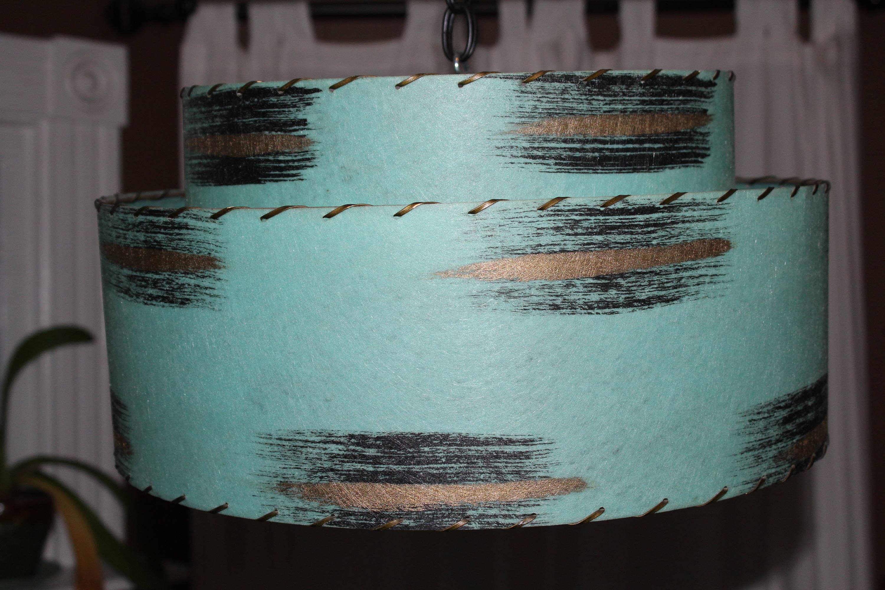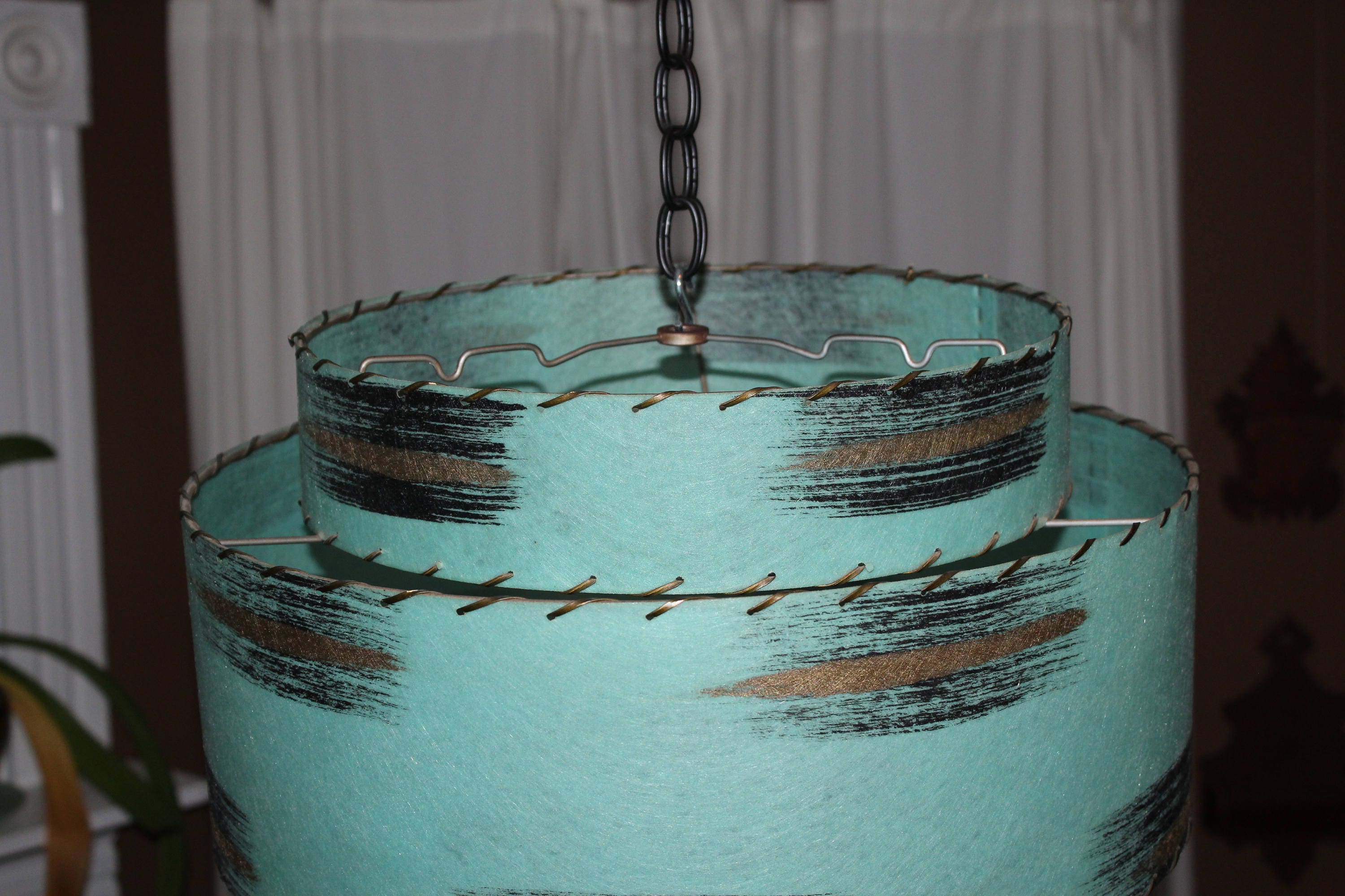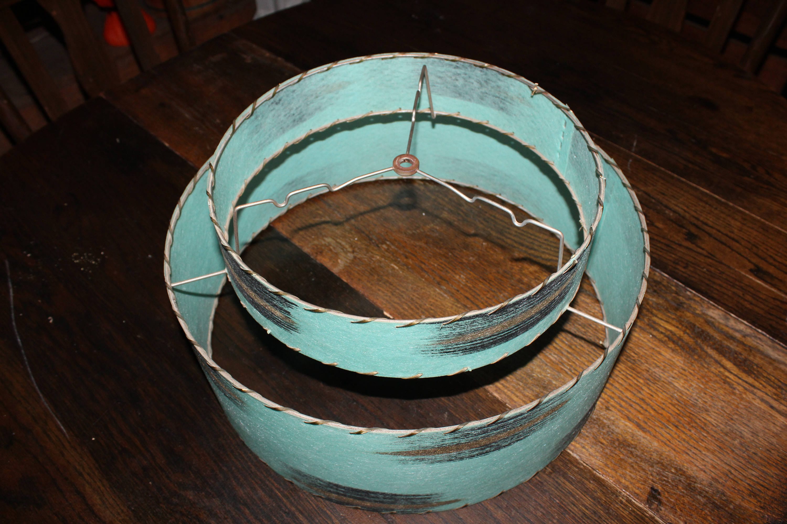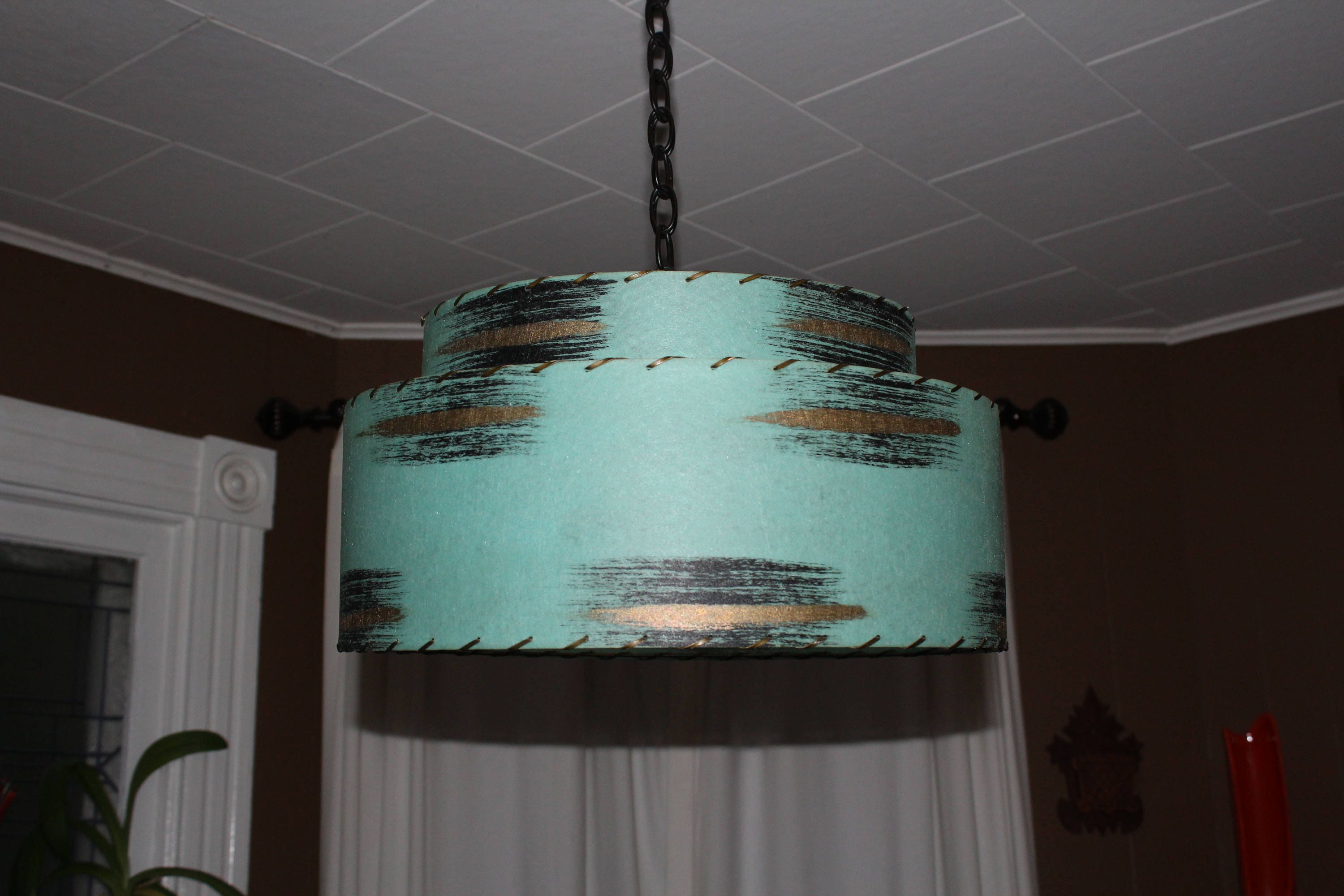 Vintage 1950s Mid Century two tier blueish/green fiberglass shade, in very good condition. The shade measures 17" in diameter x 8 1/2" high and looks great, perfect for a retro home. Enjoy!