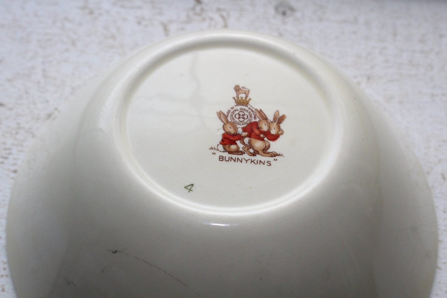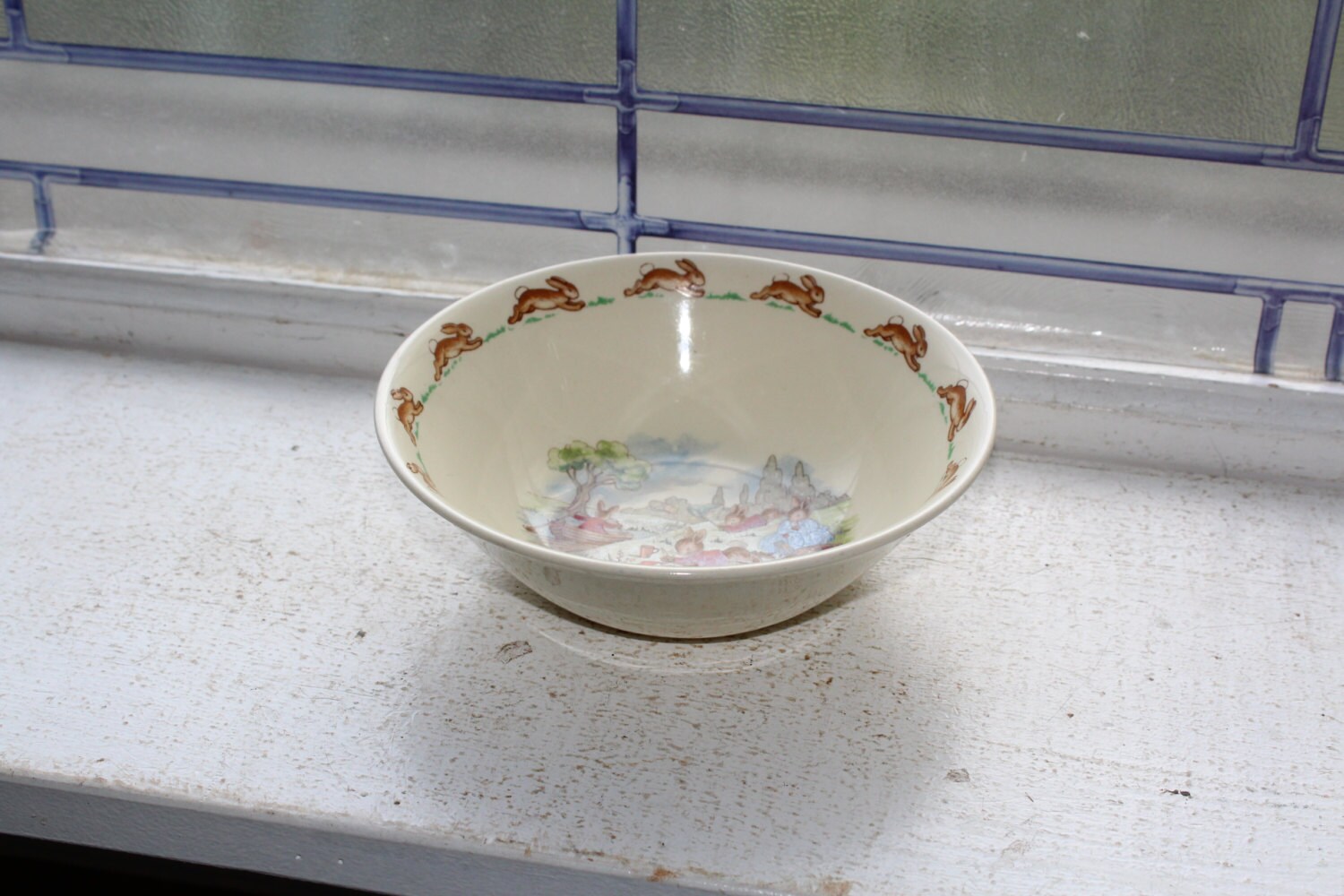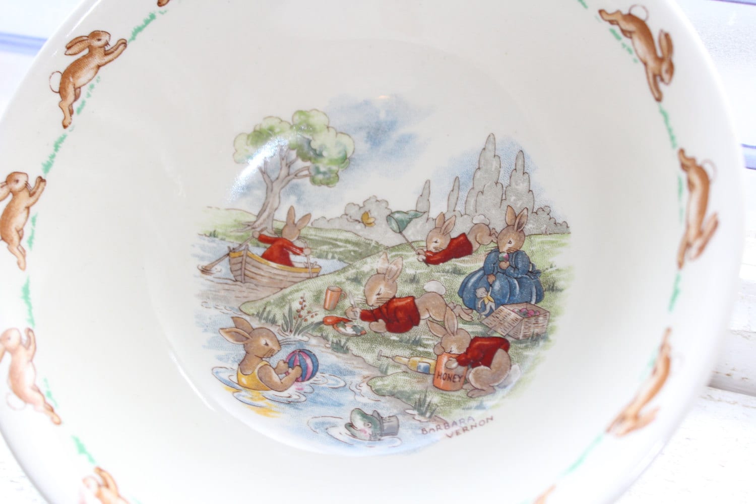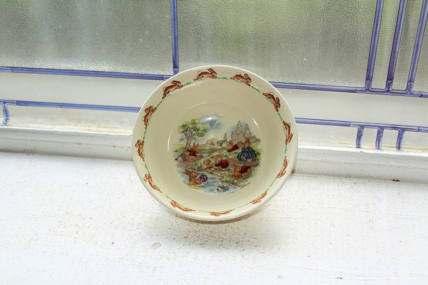 Vintage 1960s Royal Doulton Bunnykins cereal bowl featuring bunnies playing beside a river. It is in excellent condition. The bowl measures 6" wide and is 1 7/8" high. Enjoy!