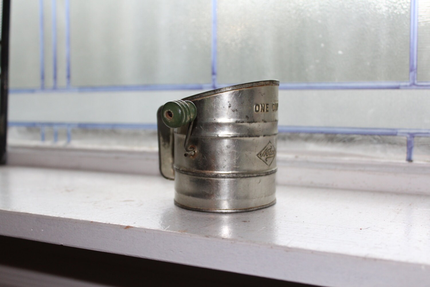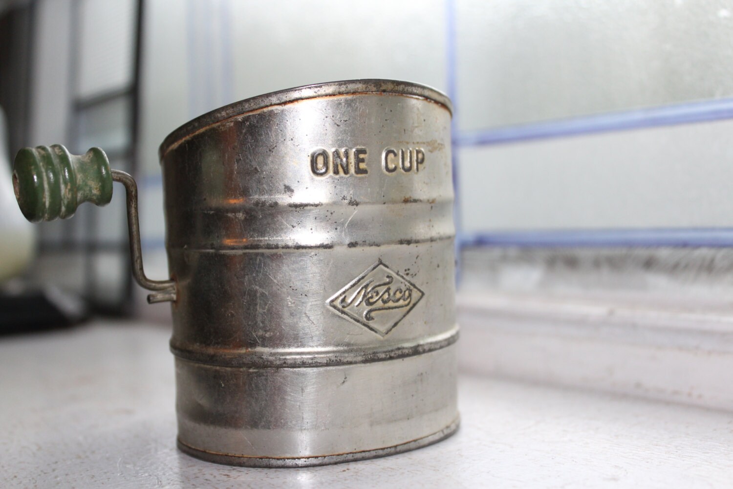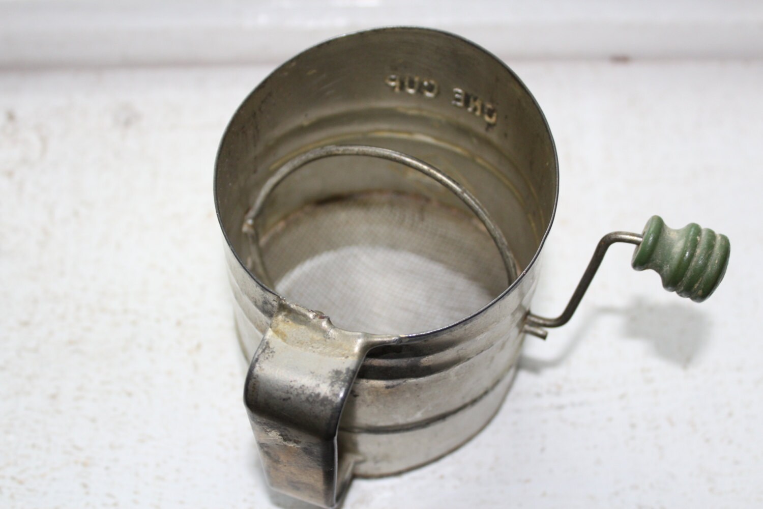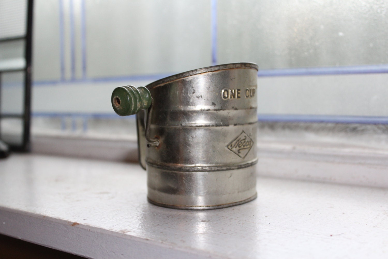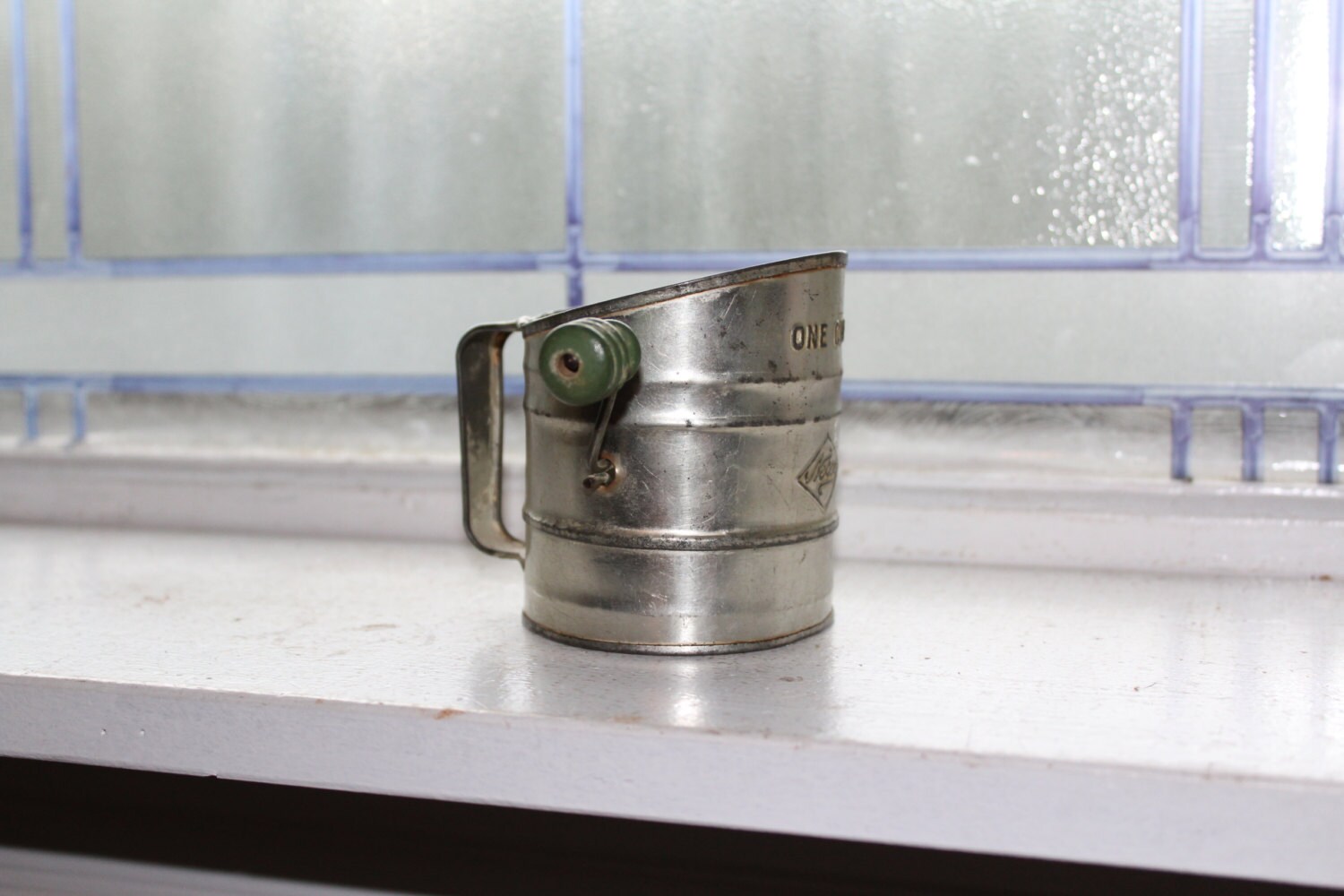 Vintage 1940s 1 cup sifter with green wood knob handle, perfect for use or display in a country kitchen. It measures 3 1/2" high and was made by Nesco. Enjoy!