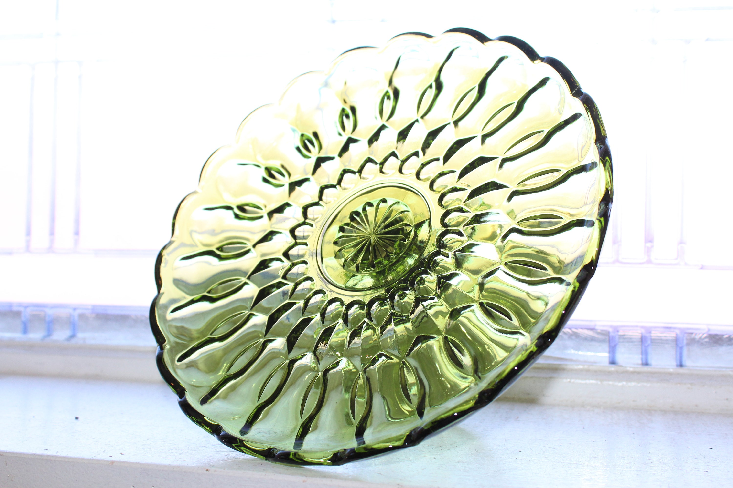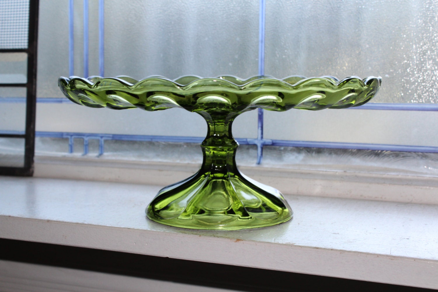 Vintage 1960s avocado green Fairfield cake stand with ruffled edge, in excellent condition. The stand measures 10" in diameter x 4 3/8" high. No chips or cracks, perfect for use or display. Enjoy!