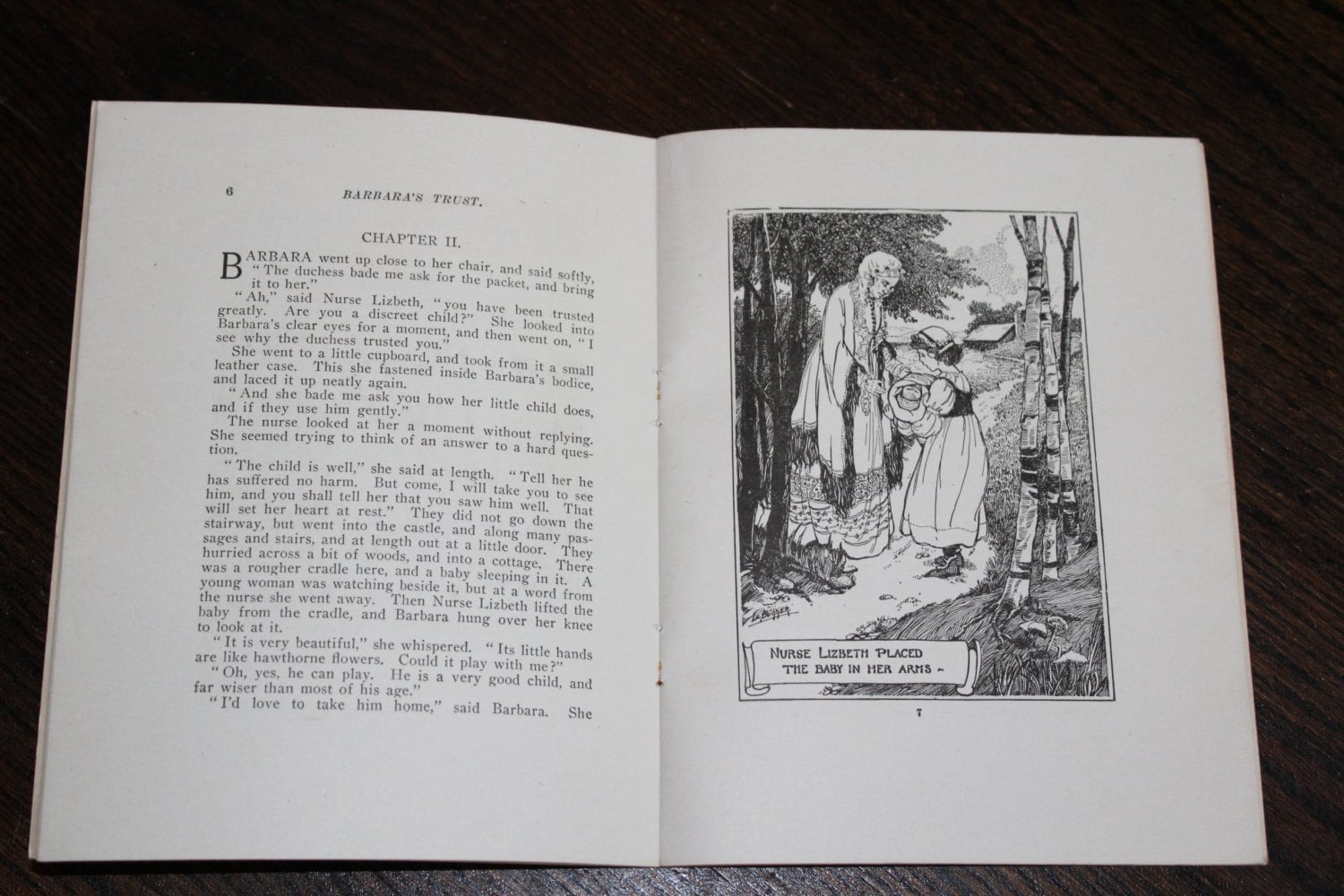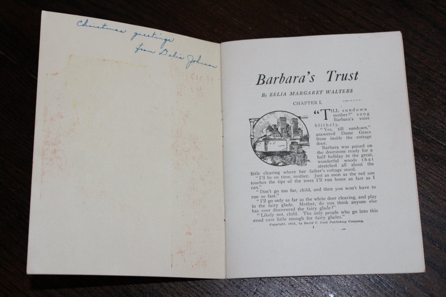 Antique 1913 paperback book, Barbara's Trust by Zelia Margaret Walters. The book measures 6 3/4" x 5 1/8" and has 16 pages. Overall good condition with minor cover staining. Enjoy!