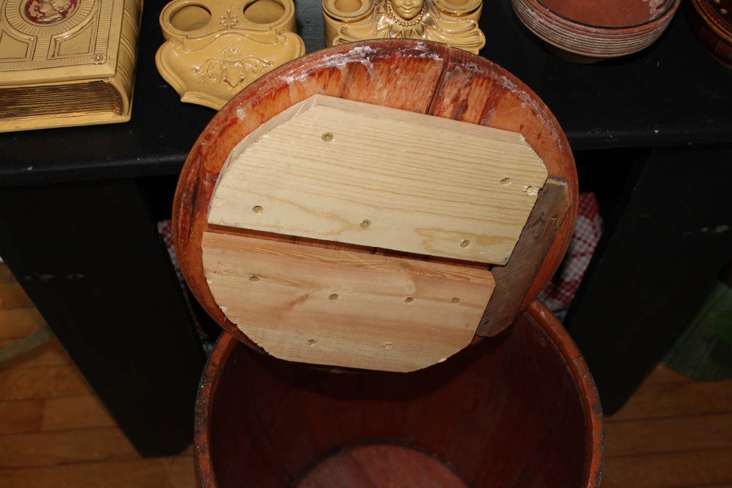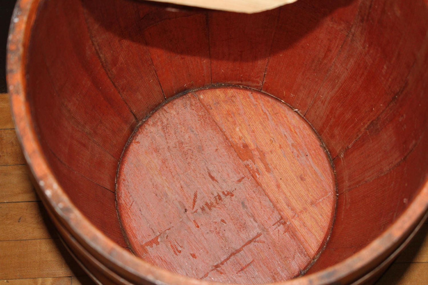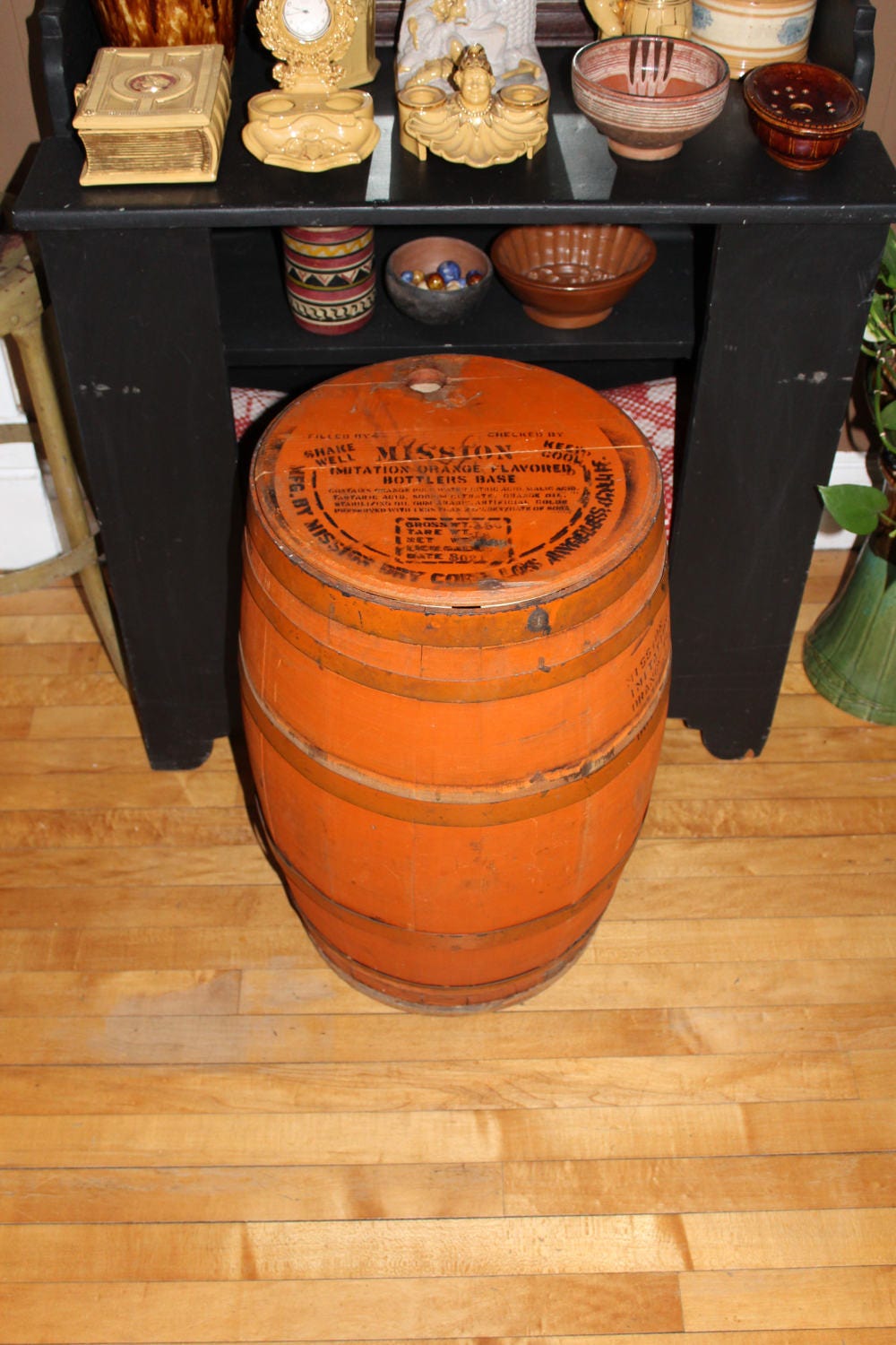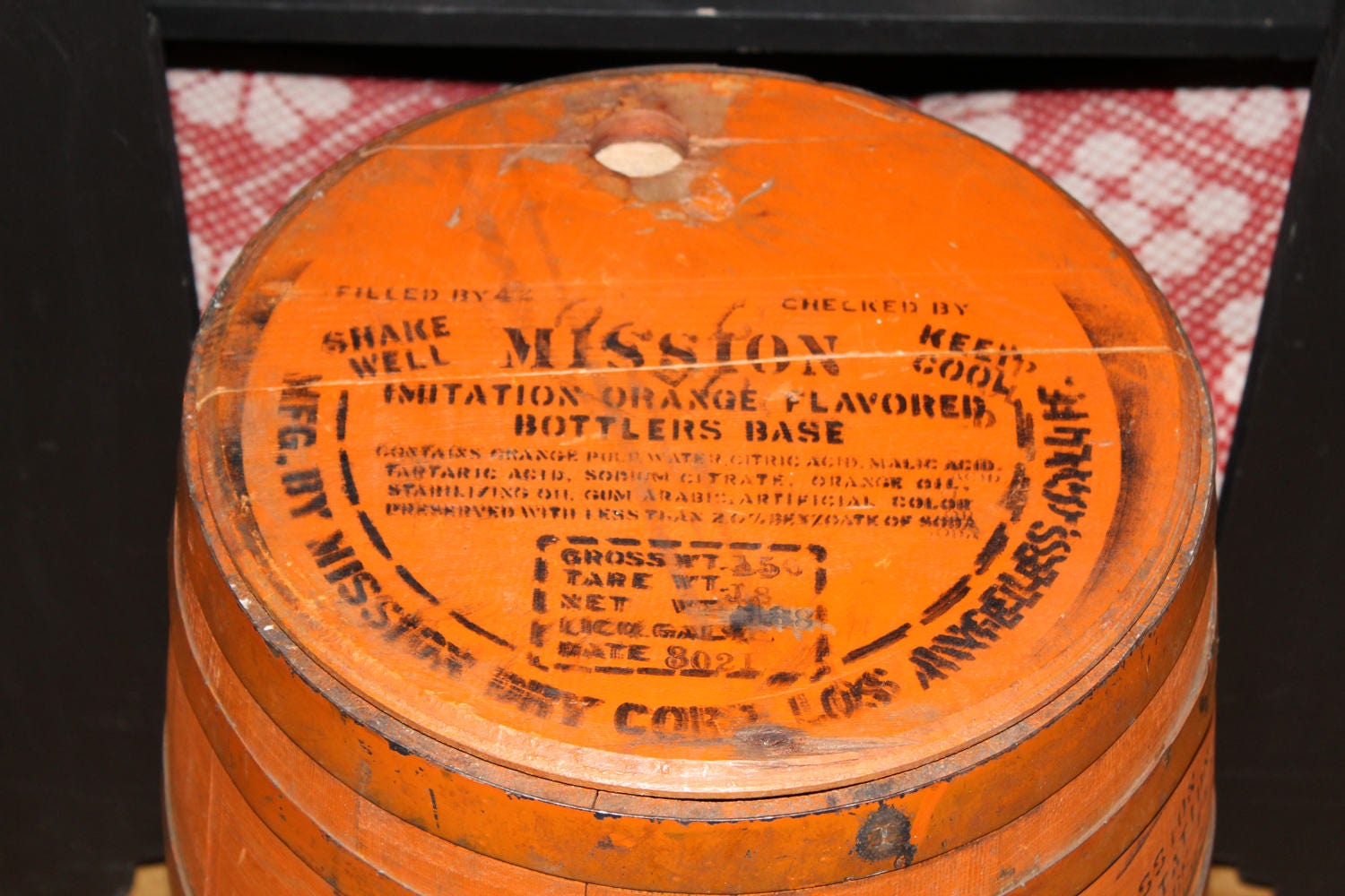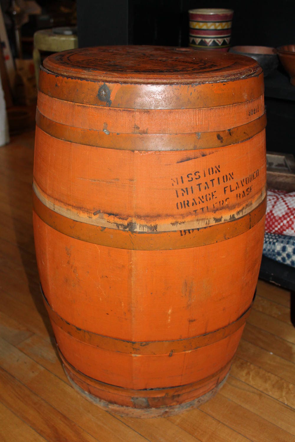 Large vintage 1930s Mission Orange Soda syrup barrel with staved wood construction, in very good condition. The barrel measures 24" high, weighs 20 lbs, and would make a nifty table in a bar or game room. The lid has had a couple of pieces of wood added to the underside for stability, and the barrel itself is very sturdy. Enjoy!