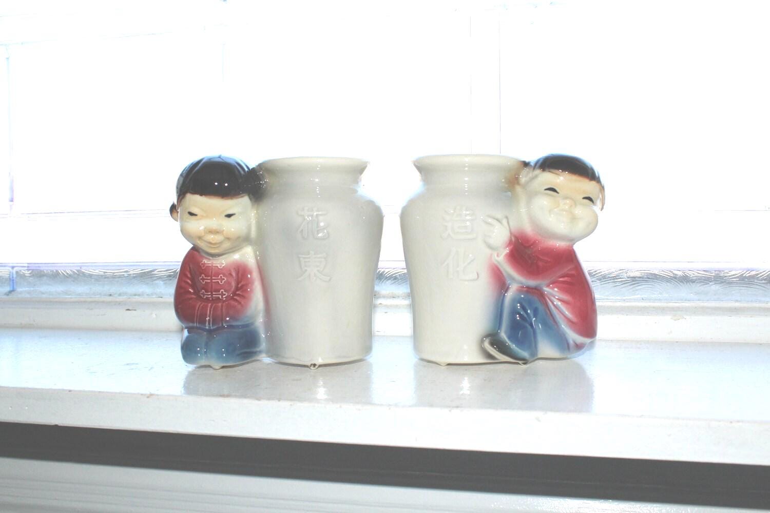 Vintage mid century Royal Copley pottery pair of Asian figure vases, in good condition and perfect for use or display. They measure 4 1/2" high. No chips, one of them has a very small hairline on the vase portion. Enjoy!