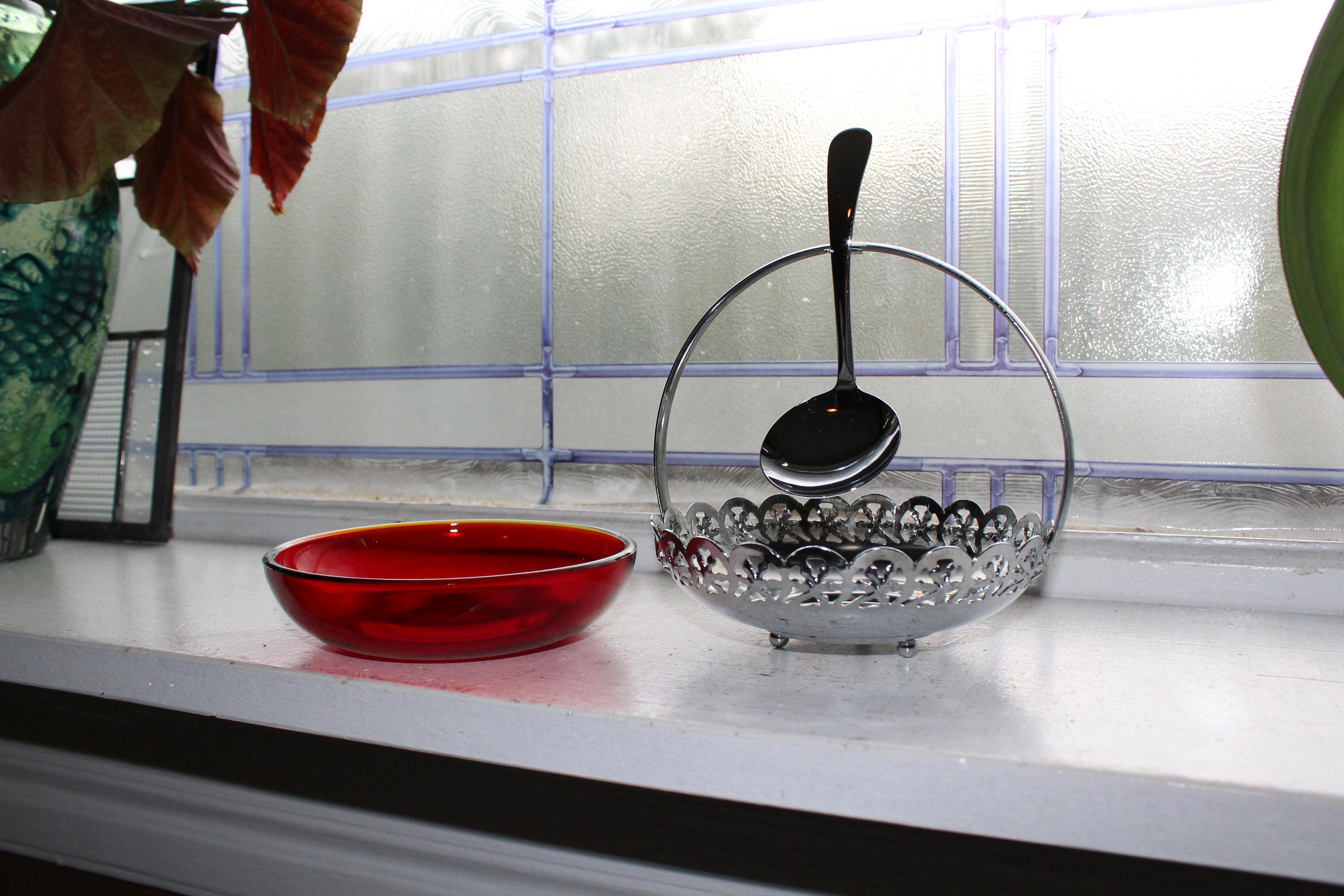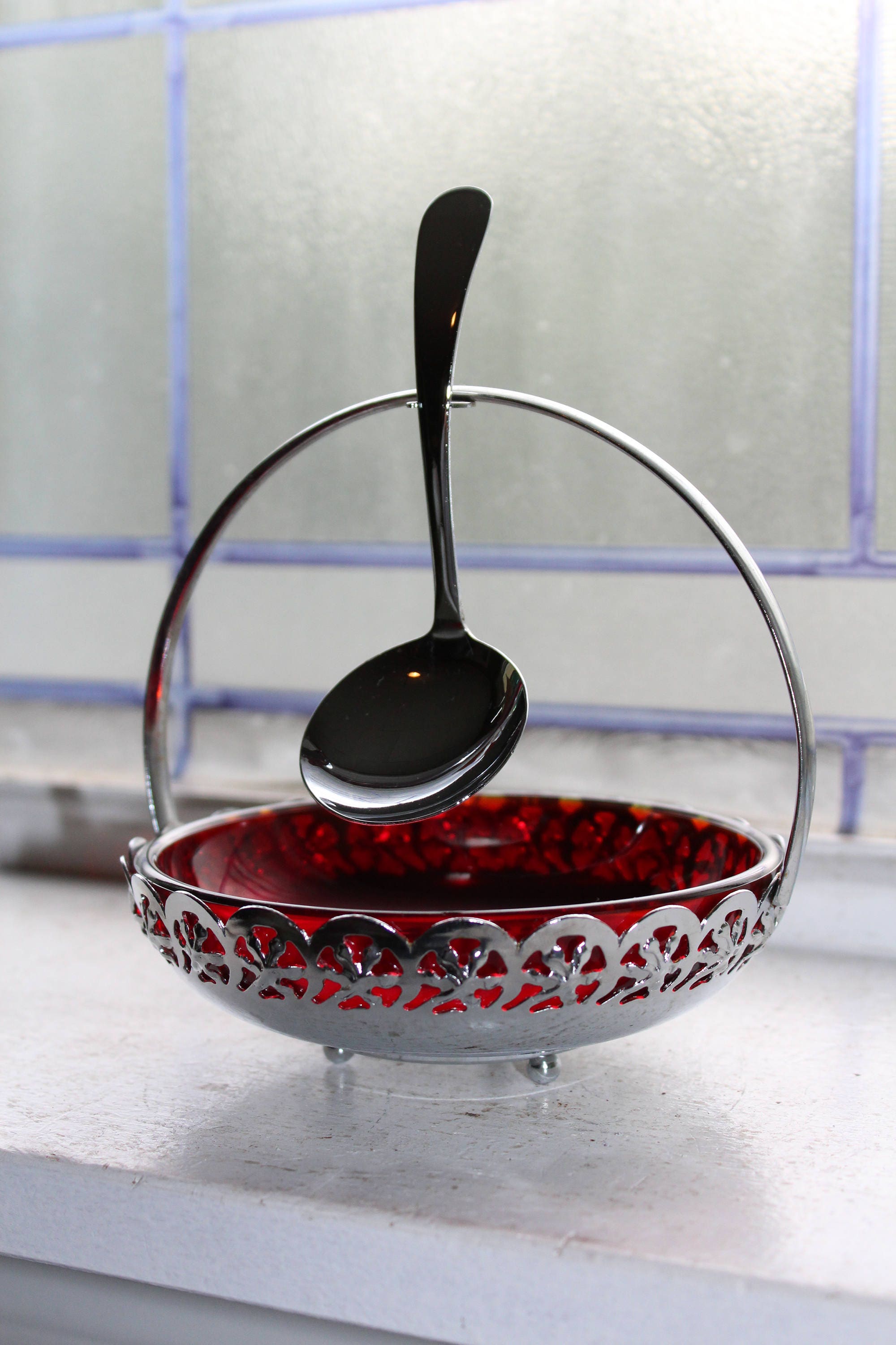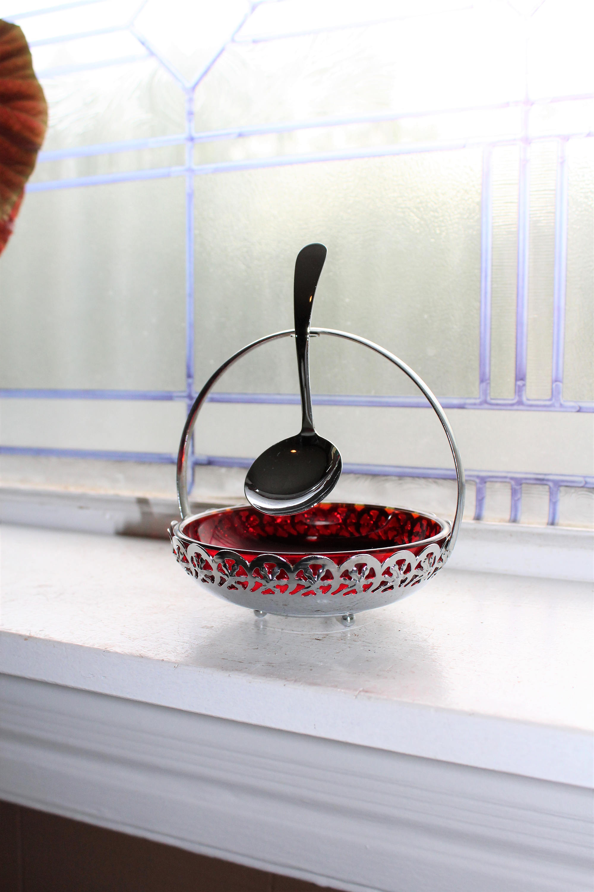 Vintage royal ruby red glass condiment dish with footed chrome stand and spoon, in excellent condition. It measures 5" high to the top of the stand and is marked Made in England. Enjoy!