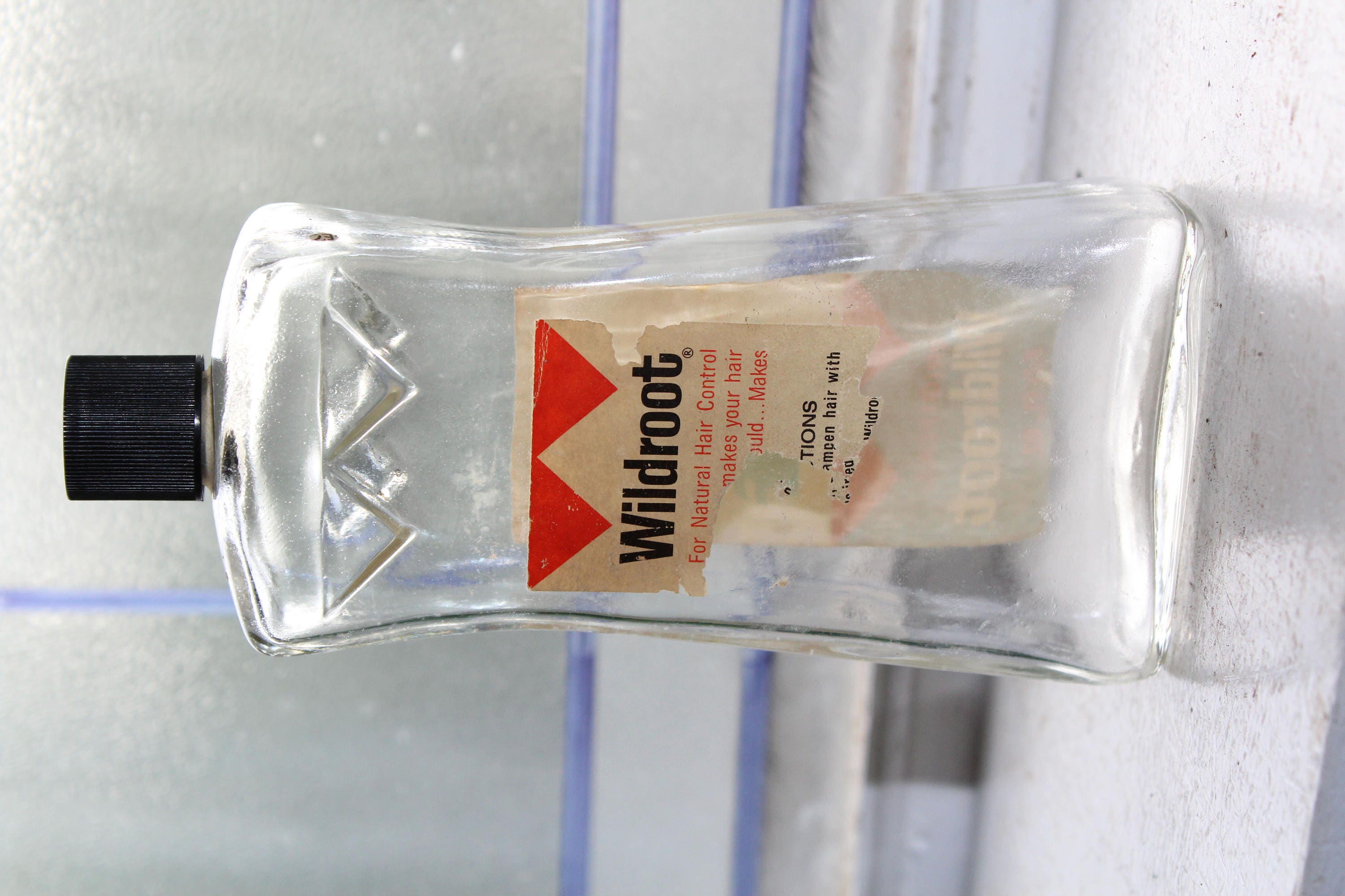 Vintage 1960s Wildroot hair care glass bottle, perfect for display in a bathroom or hair salon. The 8 oz. bottle measures 7" high. Back label is torn, front label displays well. Enjoy!