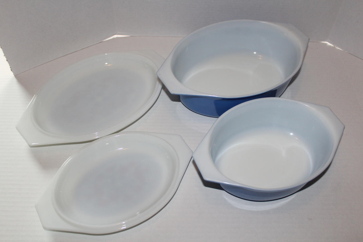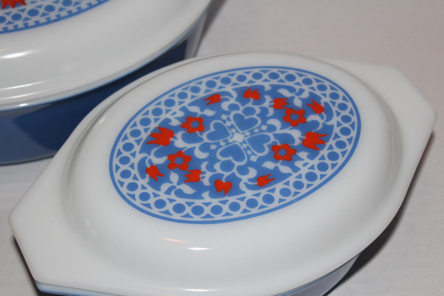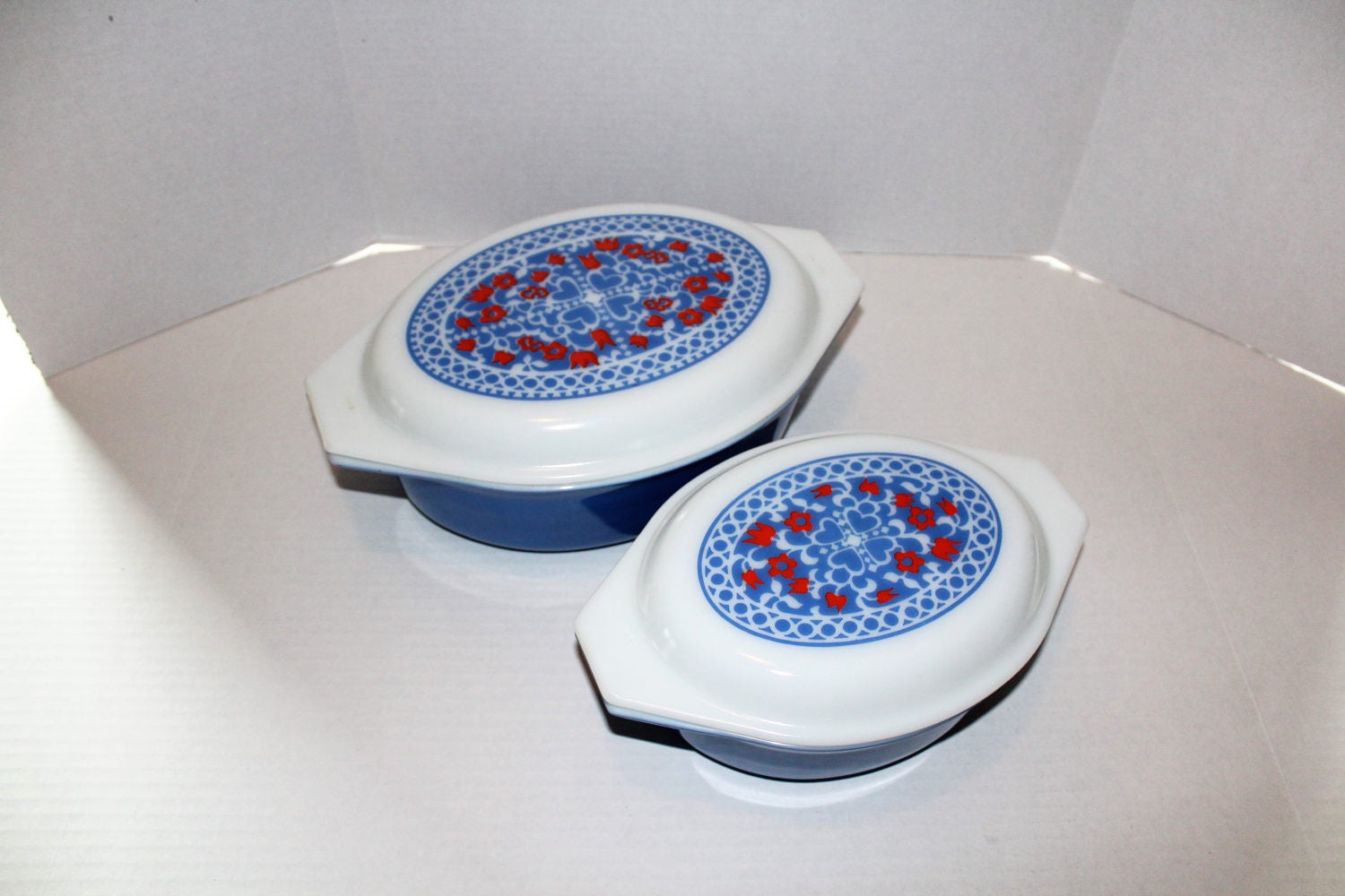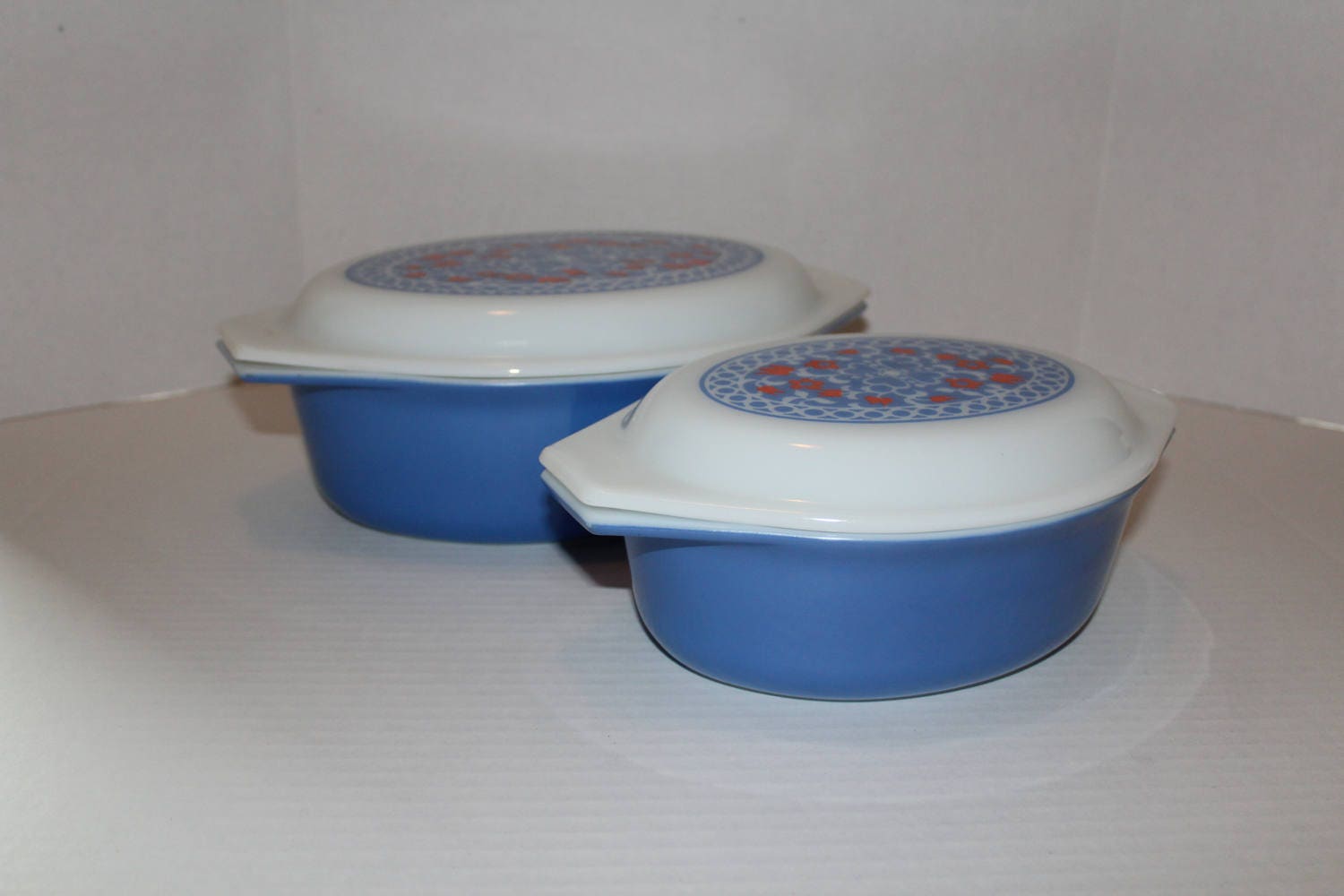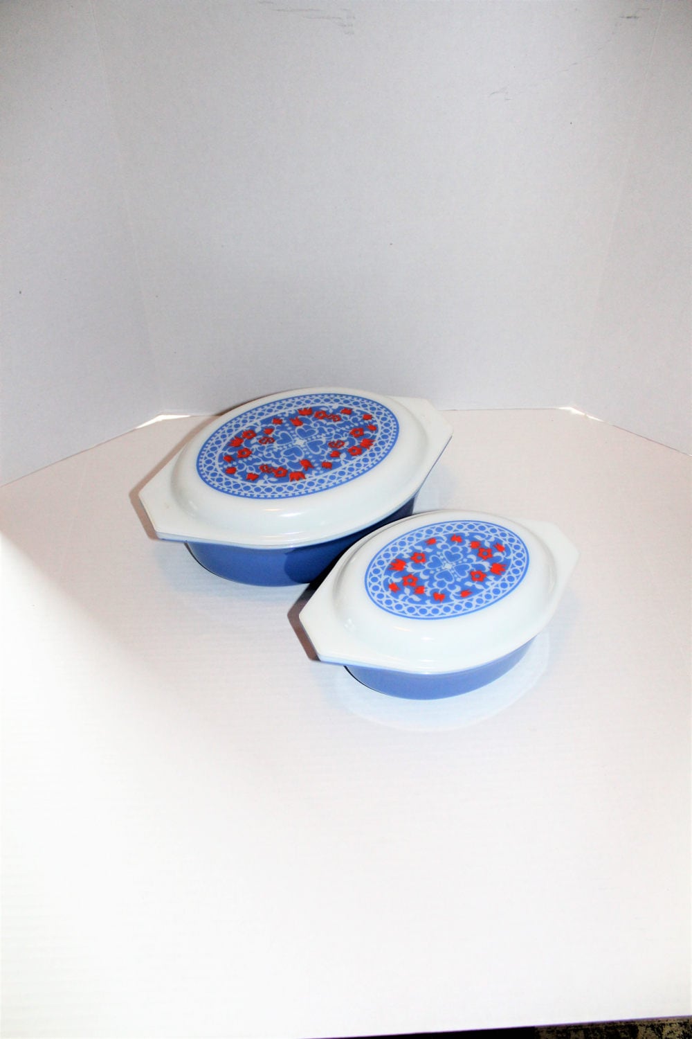 Pair of vintage 1970s Pyrex New Holland covered casseroles, both in very good condition. They are 1 1/2 and 2 1/2 quart sizes. The large one measures 12 3/4" from handle to handle, and the smaller one is 10 1/4" from handle to handle. No chips or cracks, minimal wear, great for use or display. Enjoy!