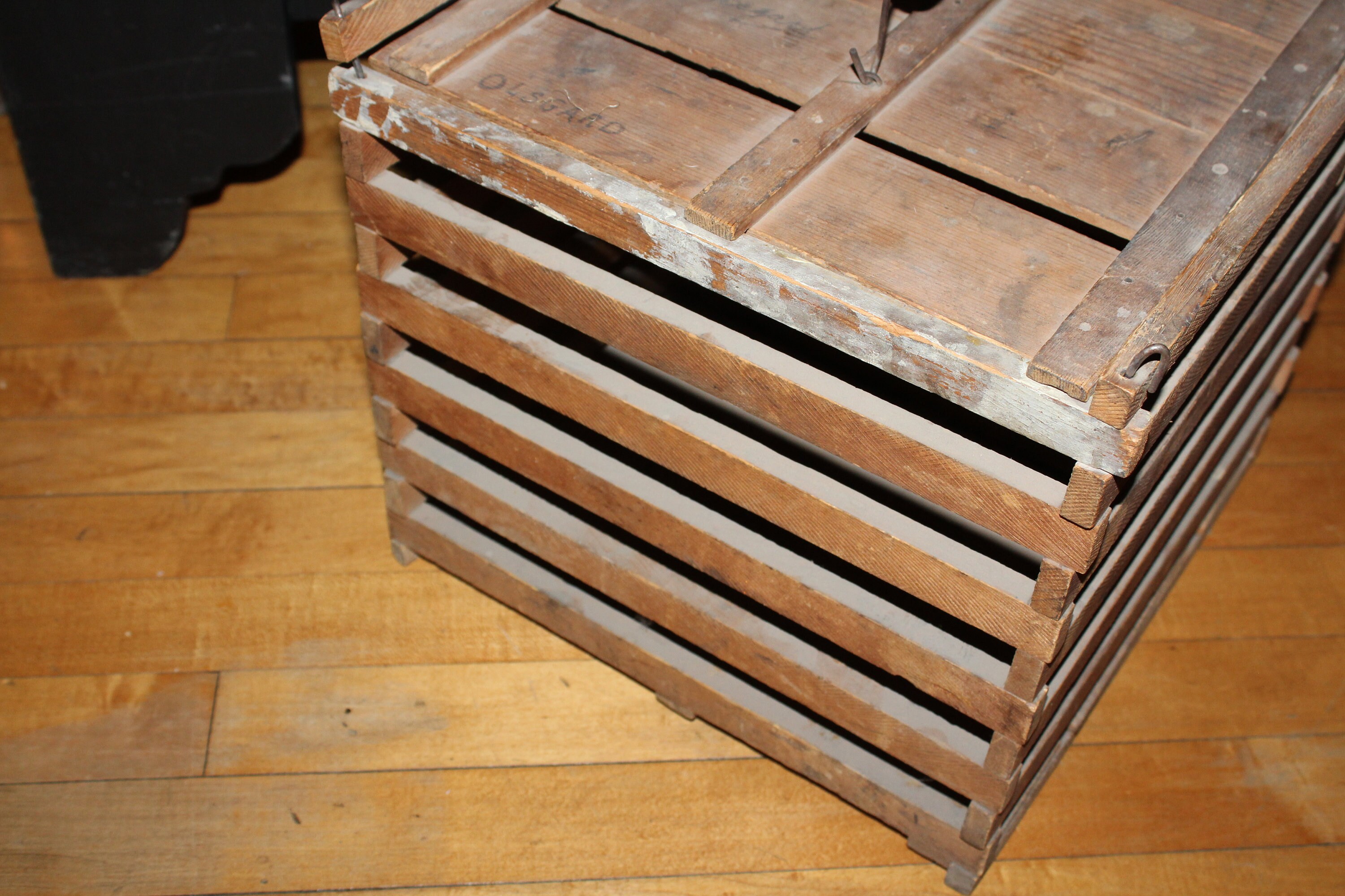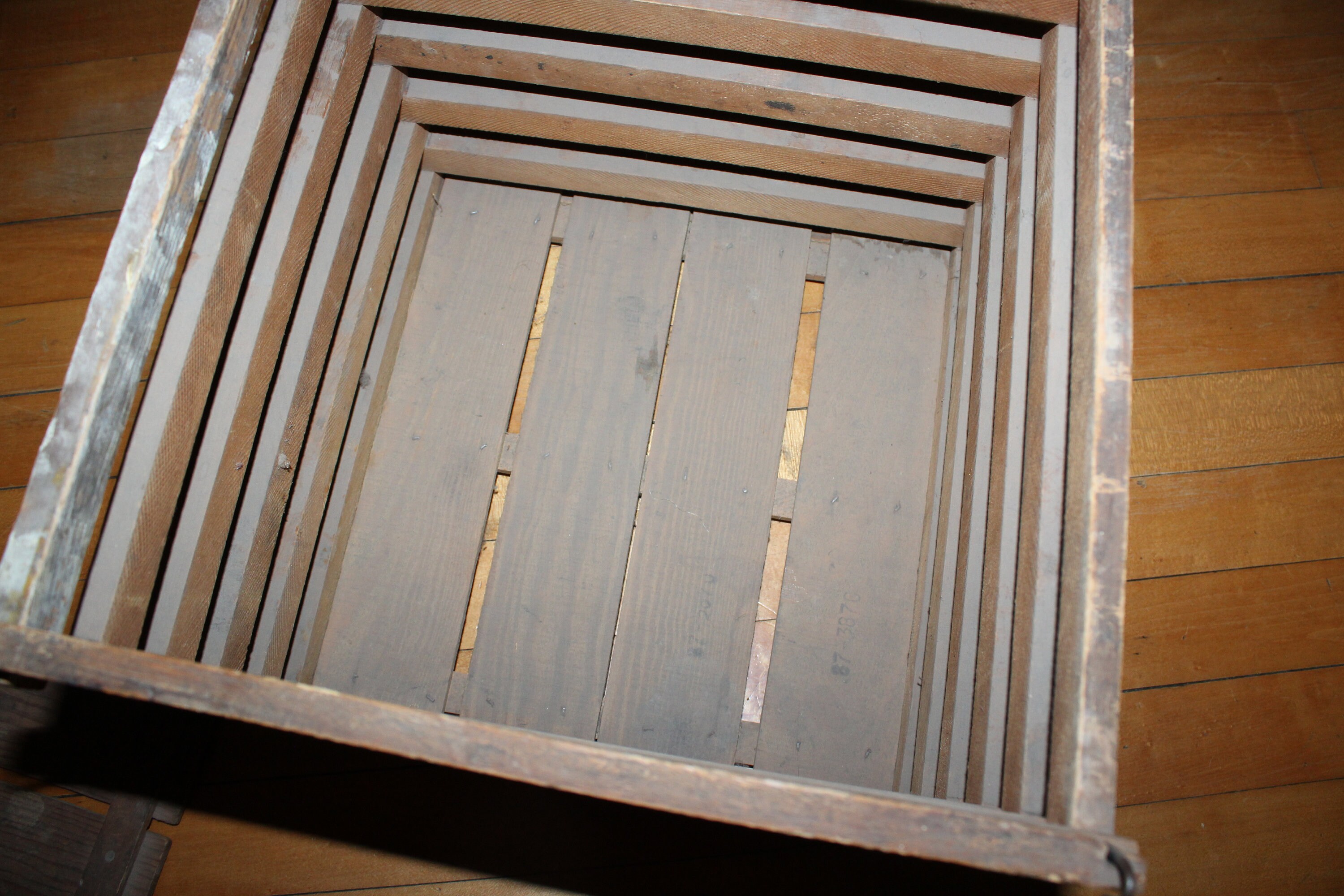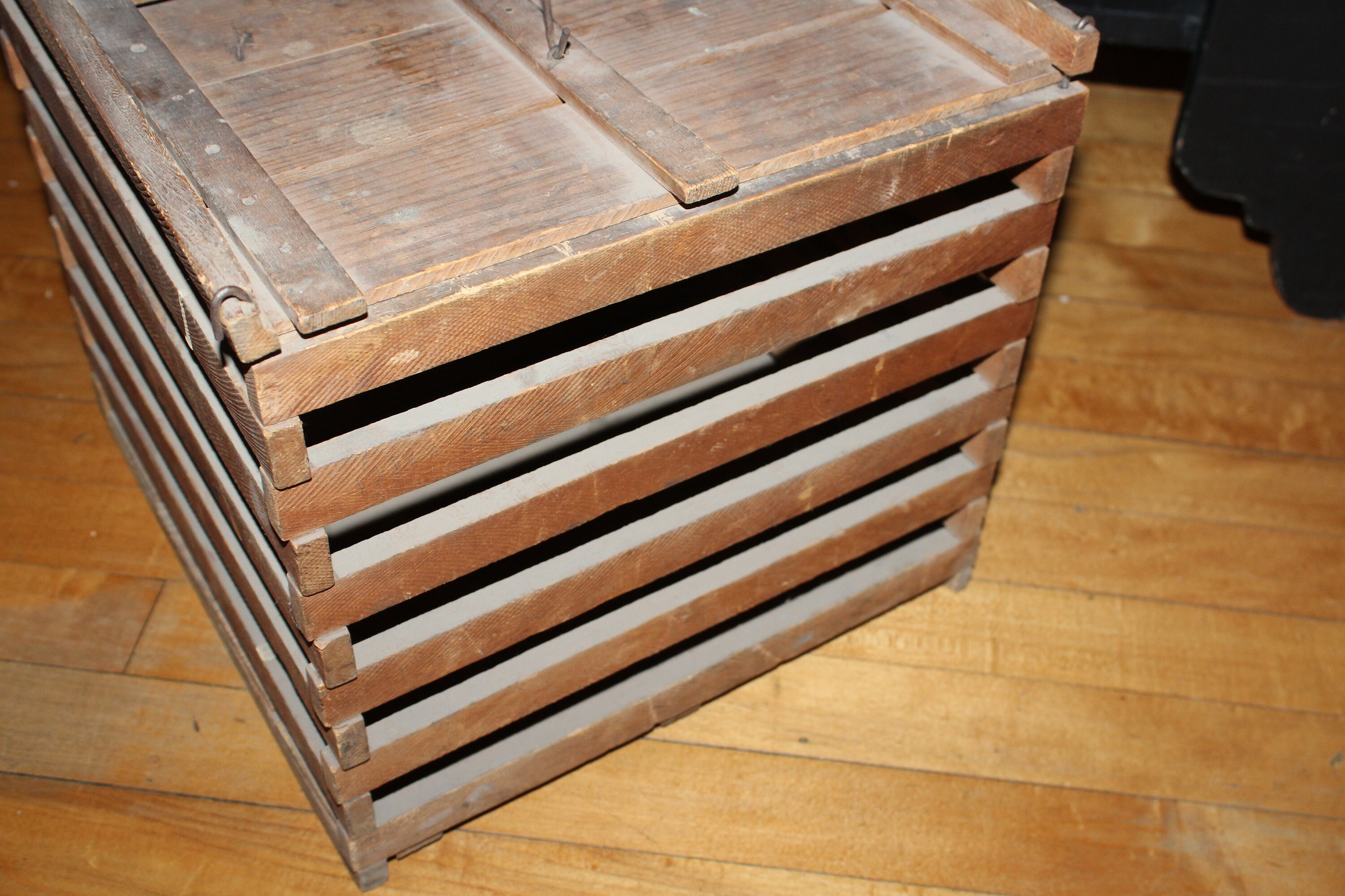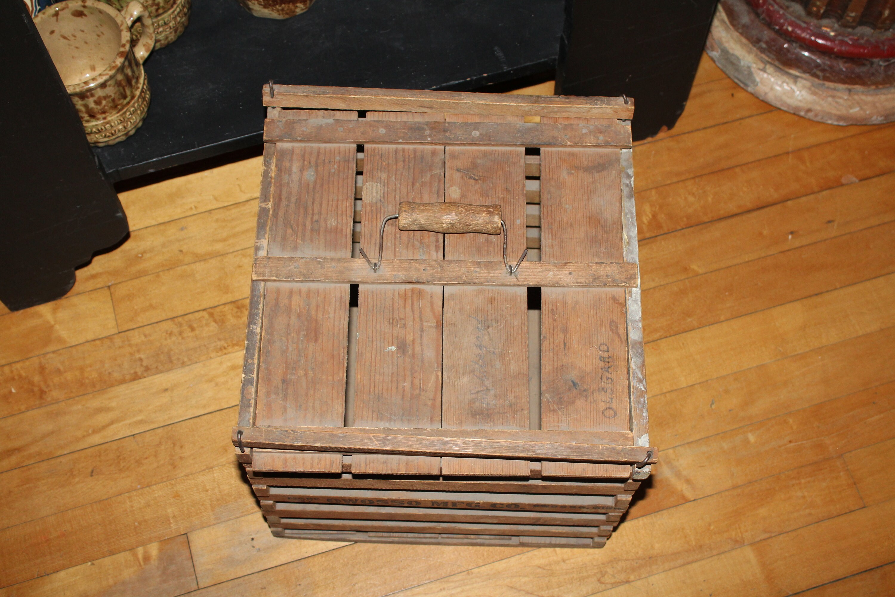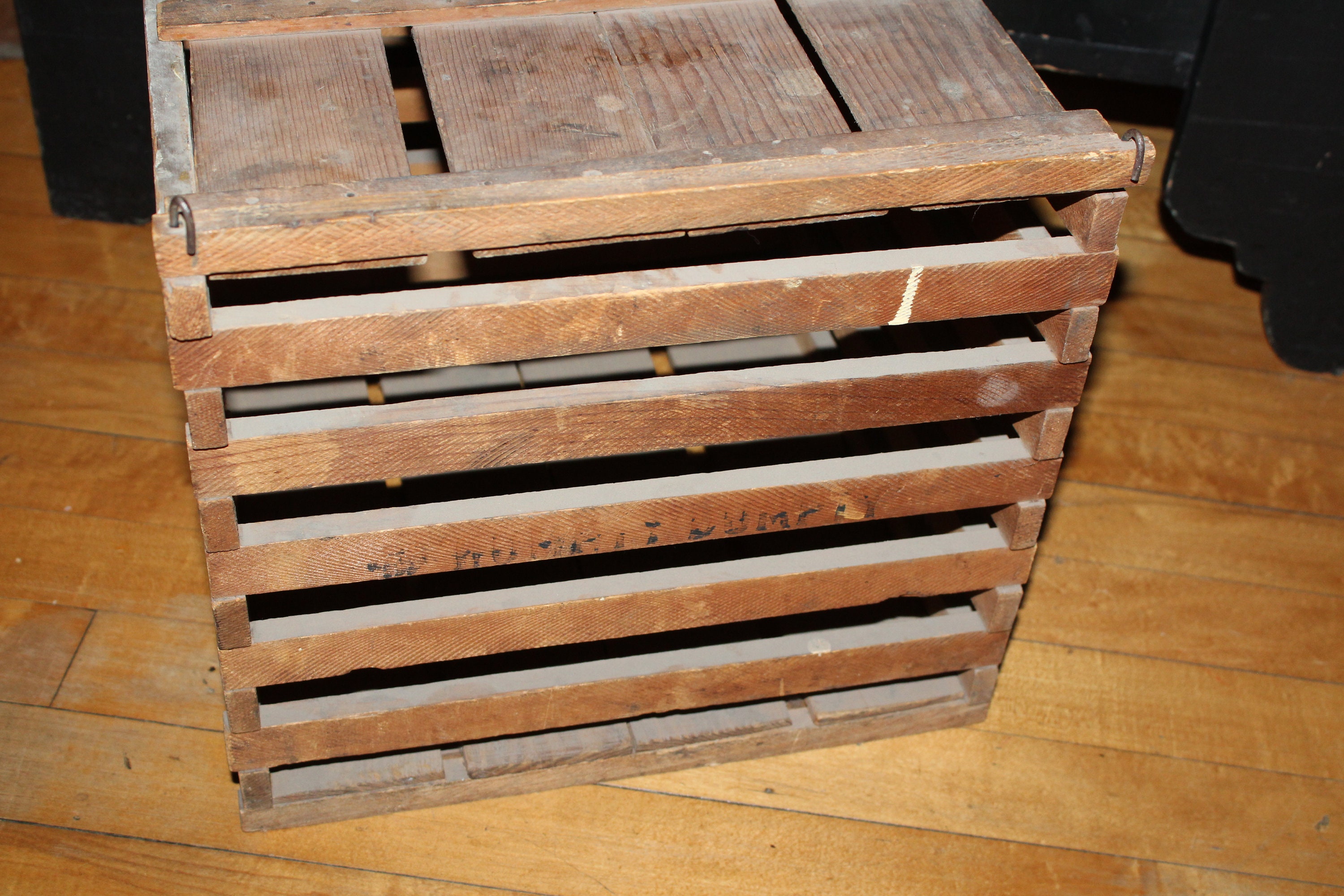 Vintage wooden egg crate with lid and wire and wood handle, in good condition. The crate measures 11 1/2" high and 12 1/2" square. Perfect for display in a country kitchen. Enjoy!