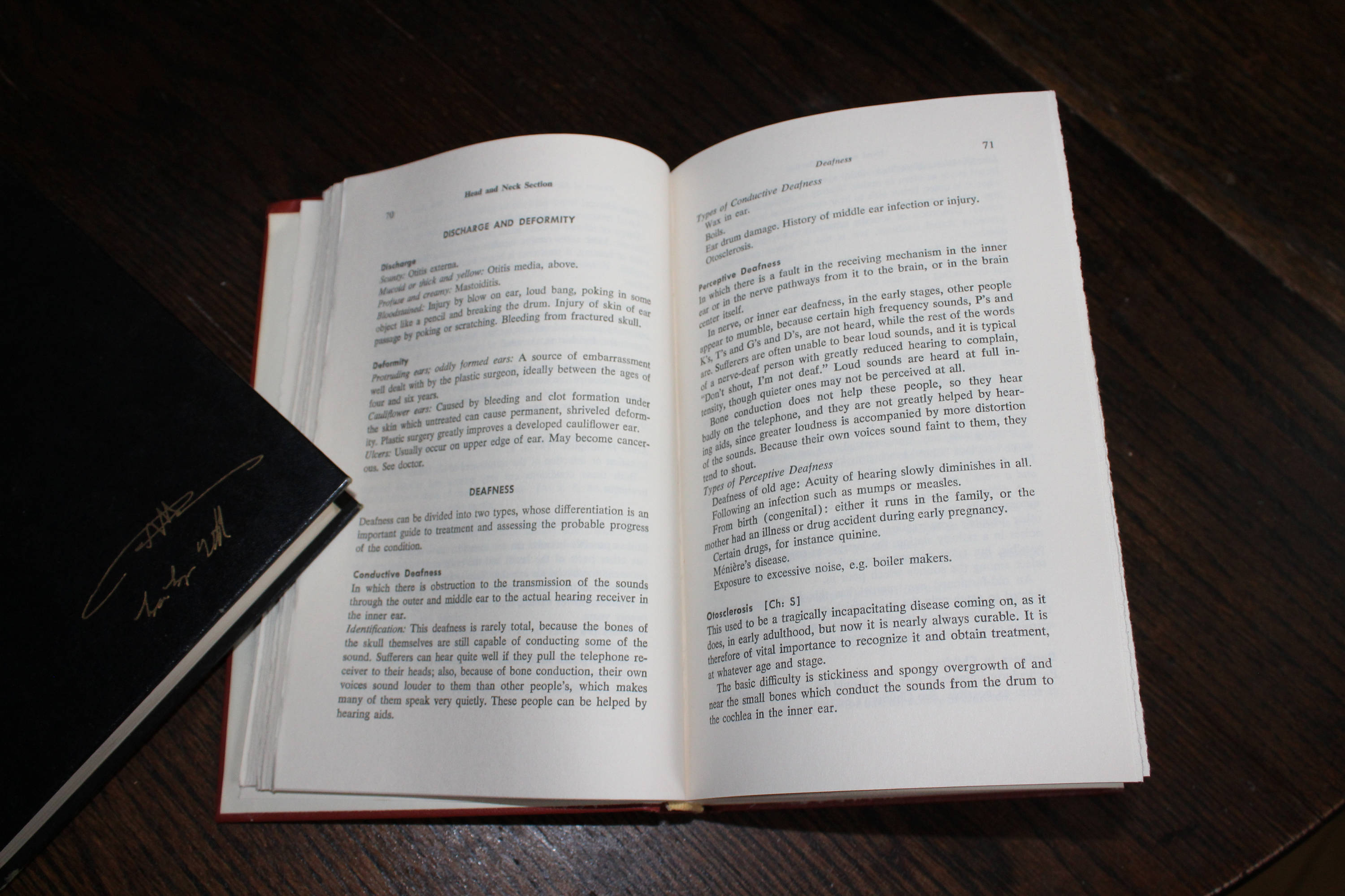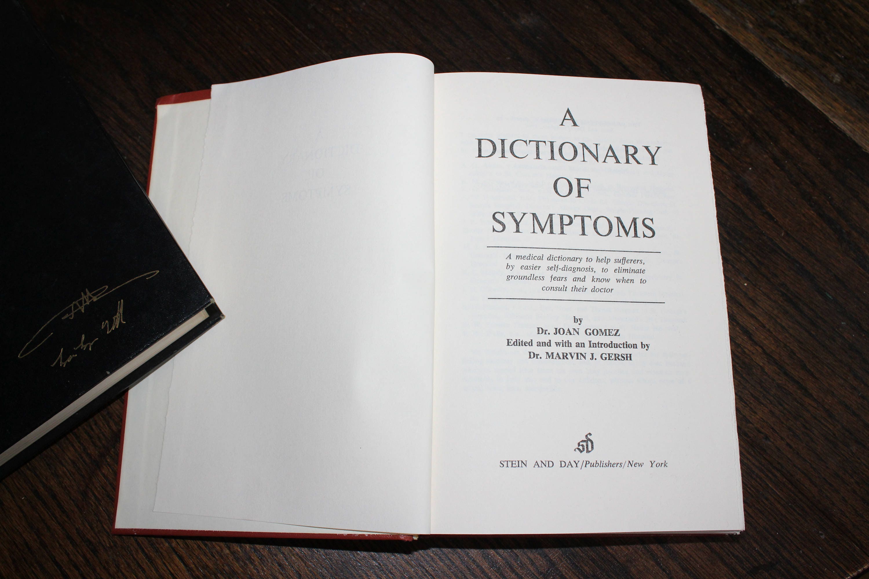 Vintage 1968 illustrated medical reference book, A Dictionary of Symptoms by Dr. Joan Gomez, in good condition. The book measures 8 1/2" x 5 1/2" and has 399 pages. Cover and pages are good although the first blank page is missing. Enjoy!