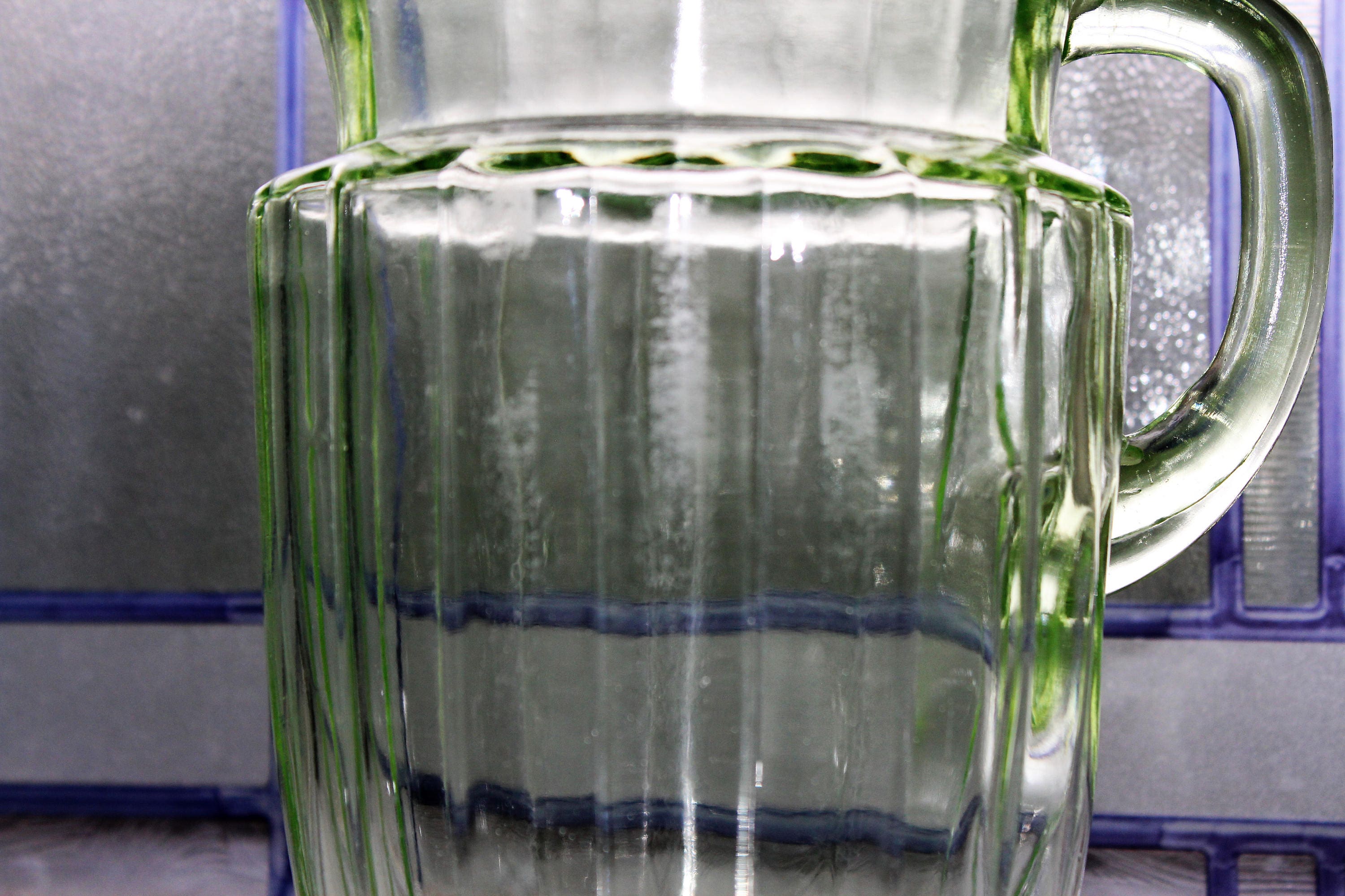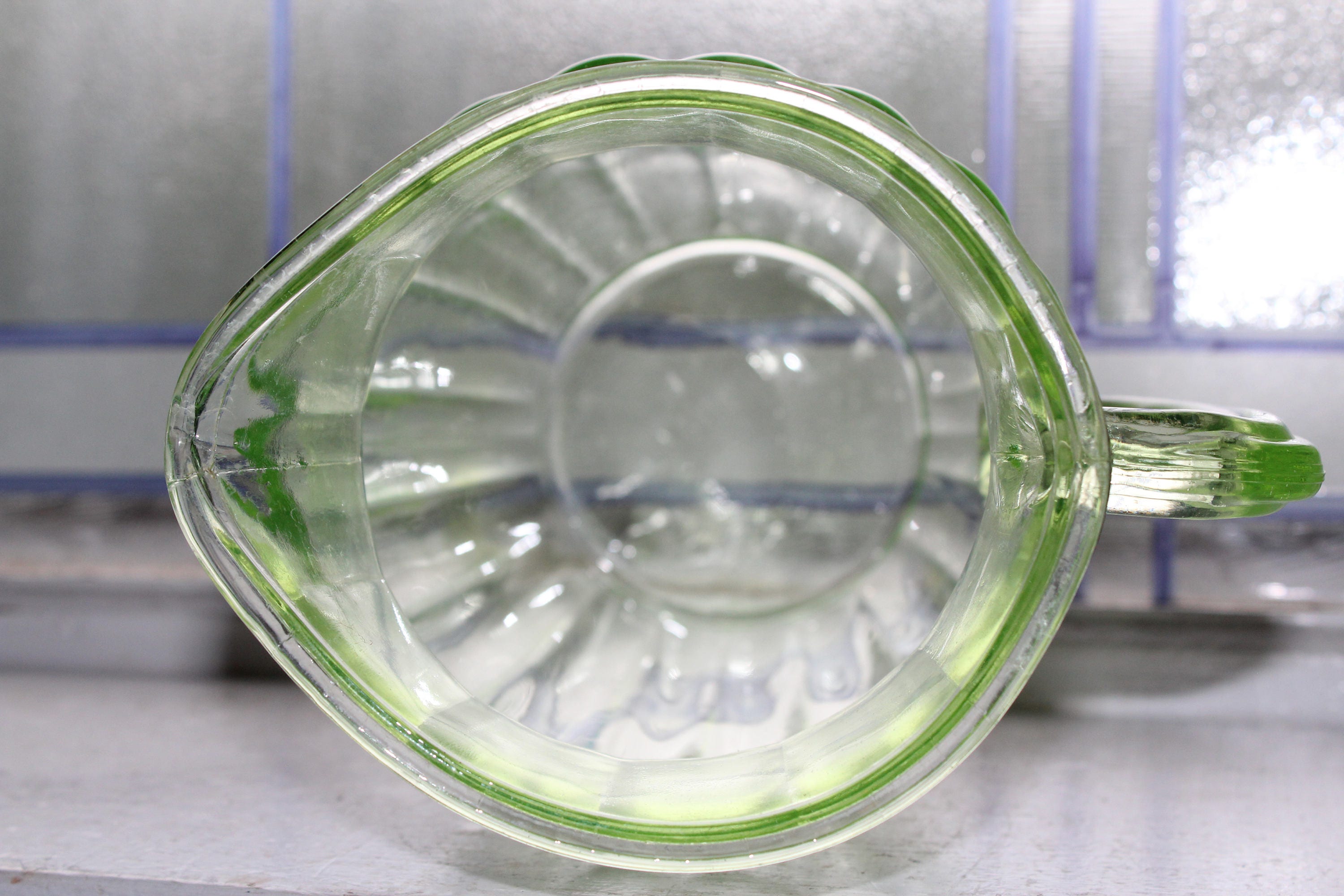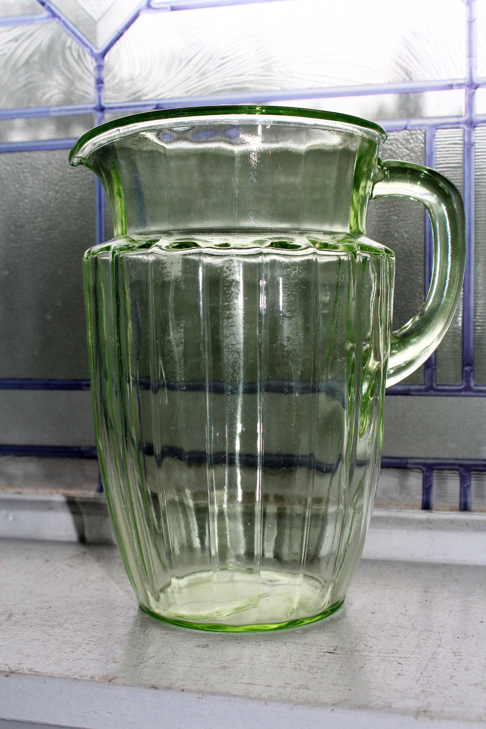 Vintage 1930s green depression glass ribbed pitcher with ice lip. The pitcher measures 8 1/8" high. No chips or cracks but it does show scuffing and age appropriate wear. Enjoy!