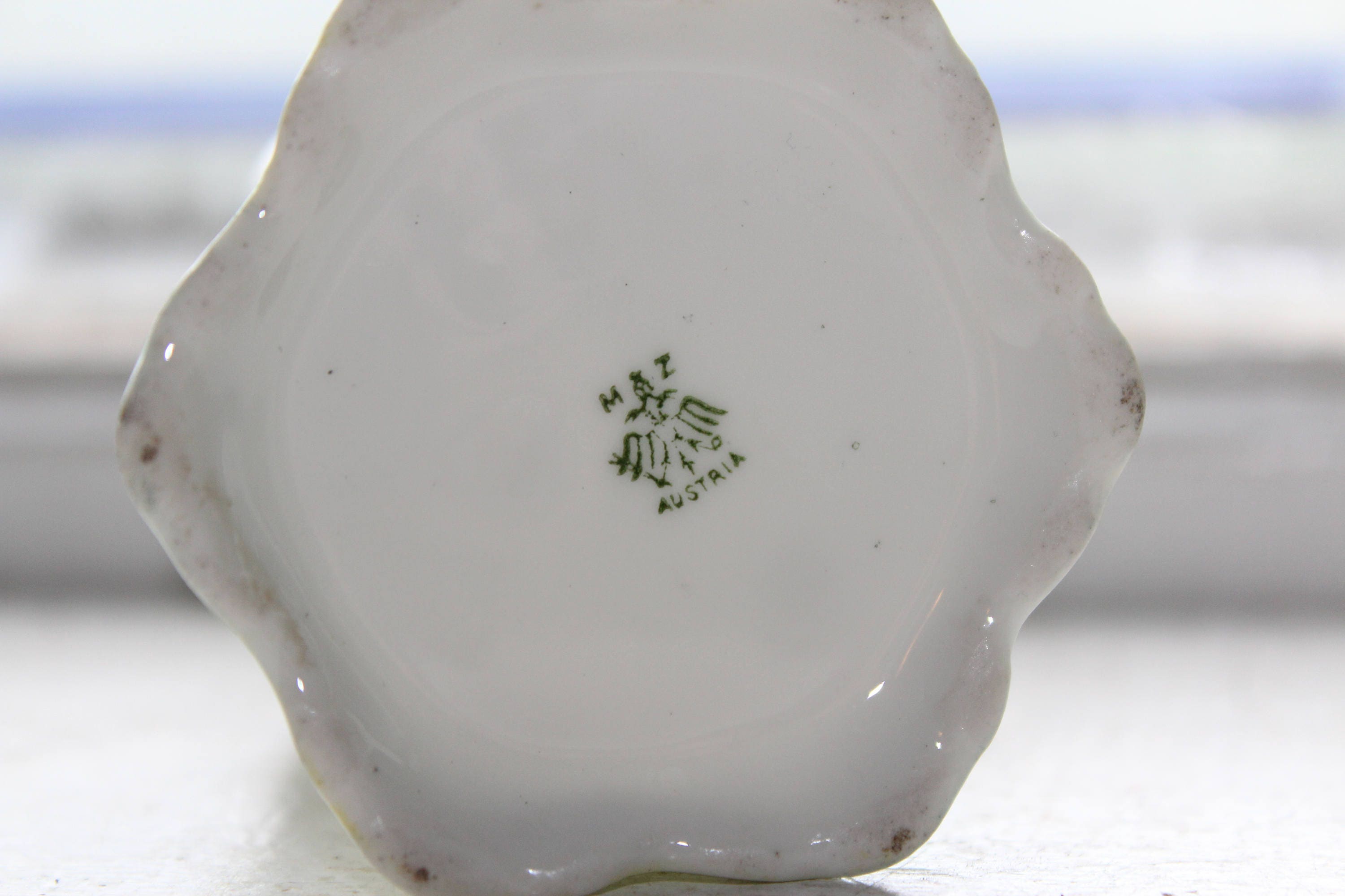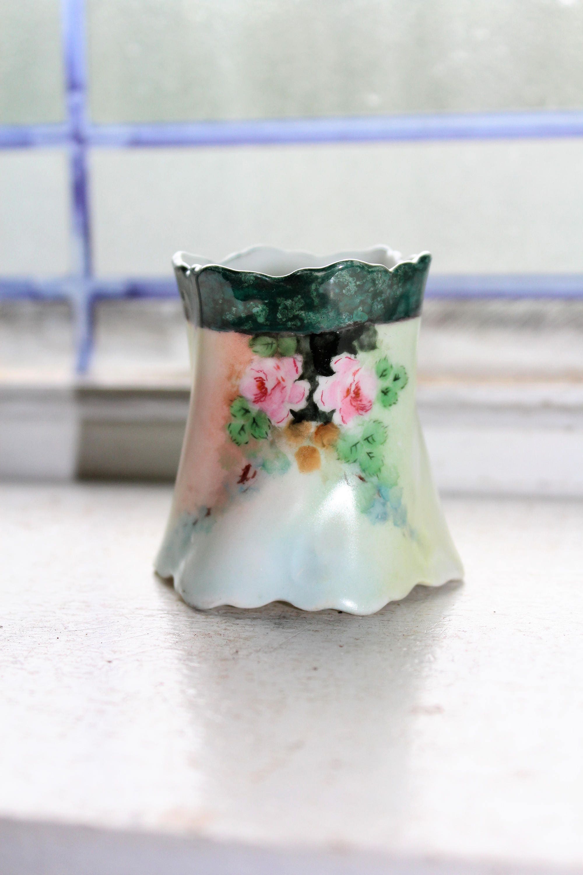 Antique early 1900s hand painted porcelain toothpick holder featuring delicate pink flowers and marked M & Z Austria. It measures 2 1/4" high x 1 7/8" wide at the top. No chips or cracks, perfect for use or display. Enjoy!