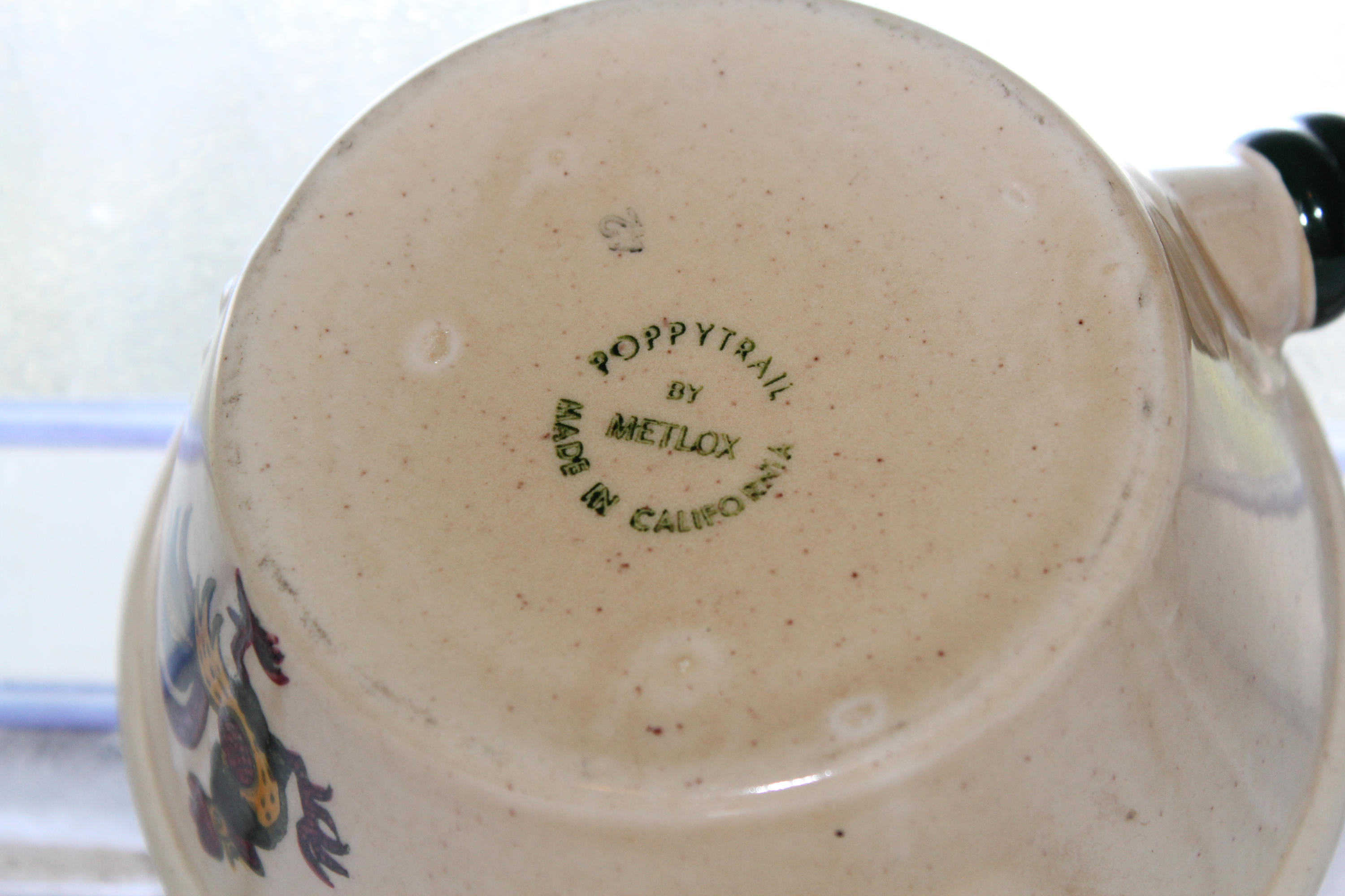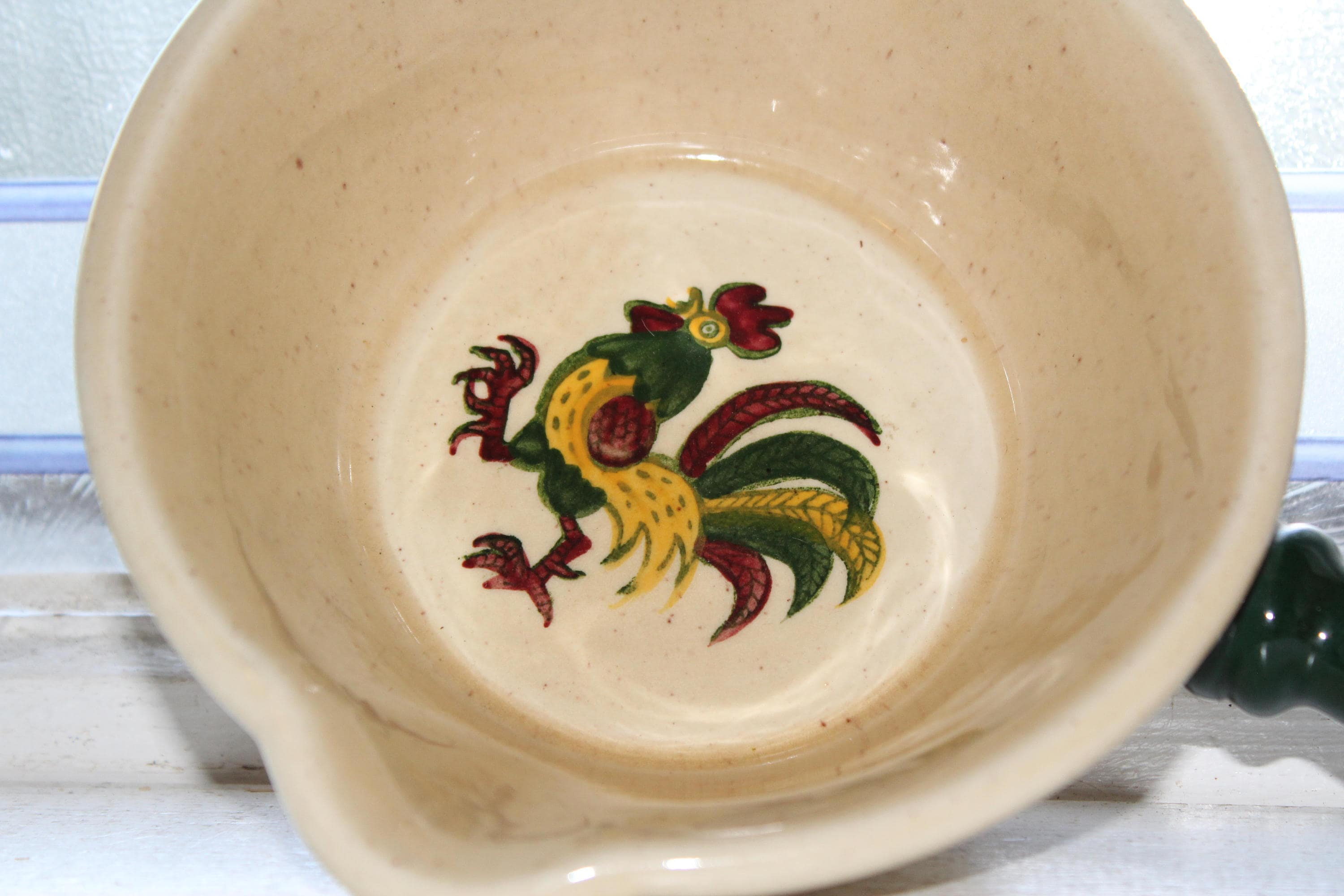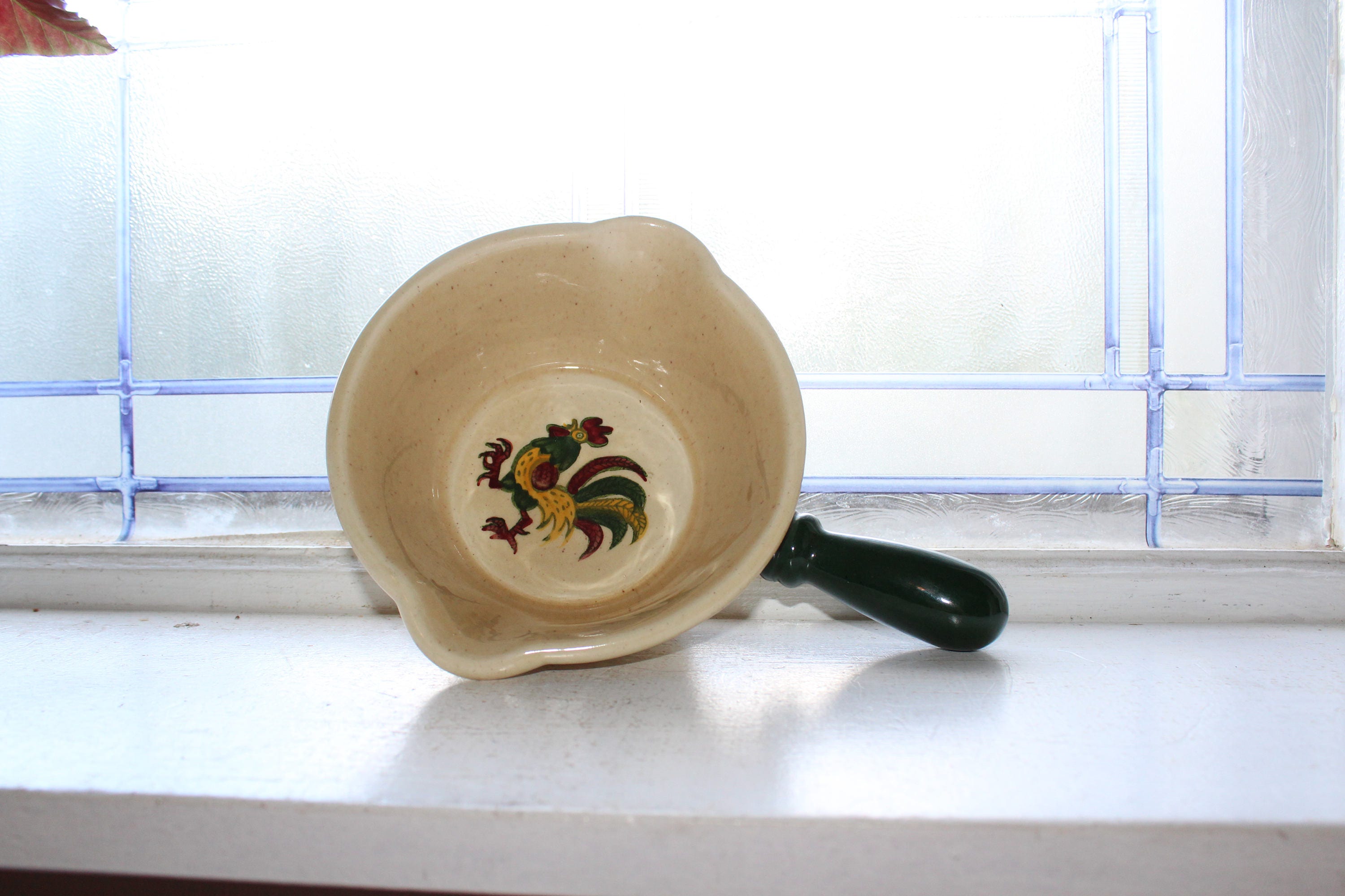 Vintage 1950s Metlox Poppytrail Rooster gravy boat with handle and double pour spouts, in excellent condition. This piece of California pottery measures 8 3/4" long. No chips or cracks, perfect for use or display. Enjoy!