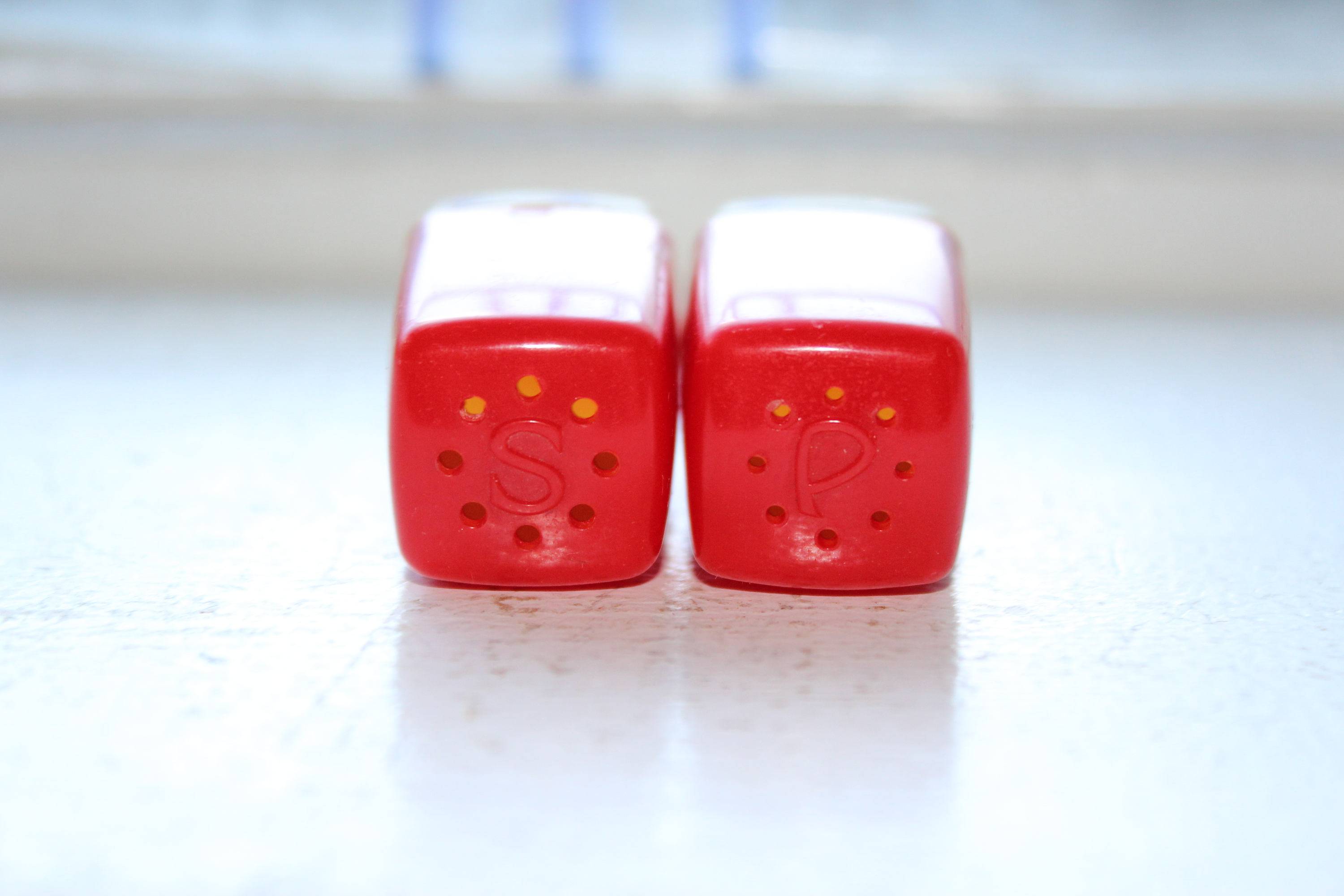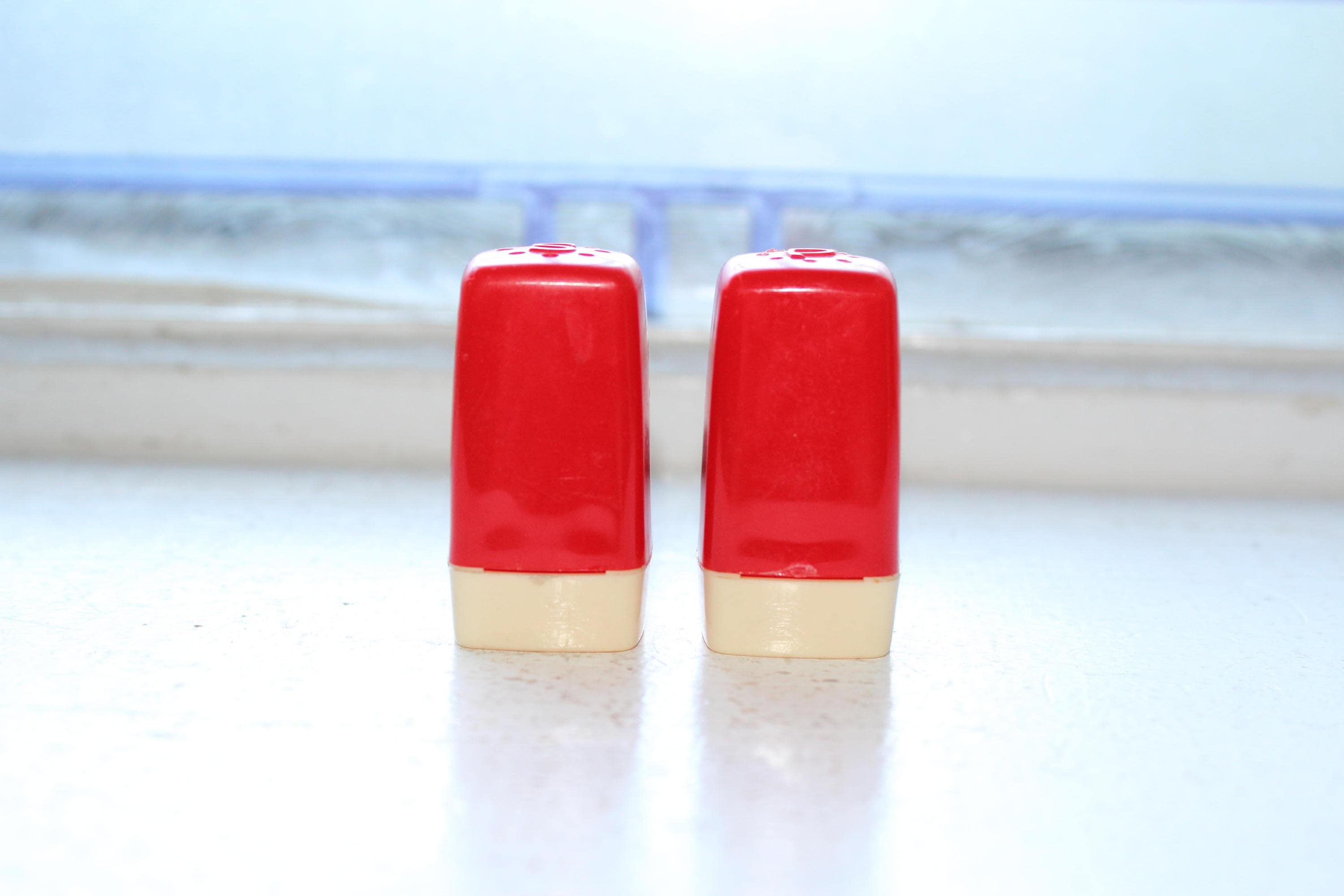 Vintage 1950s red and white plastic salt and pepper shakers, in good condition with age appropriate light wear, no chips or cracks. These are perfect for use and display in a Mid Century kitchen. They measure 1 3/4" high. Enjoy!