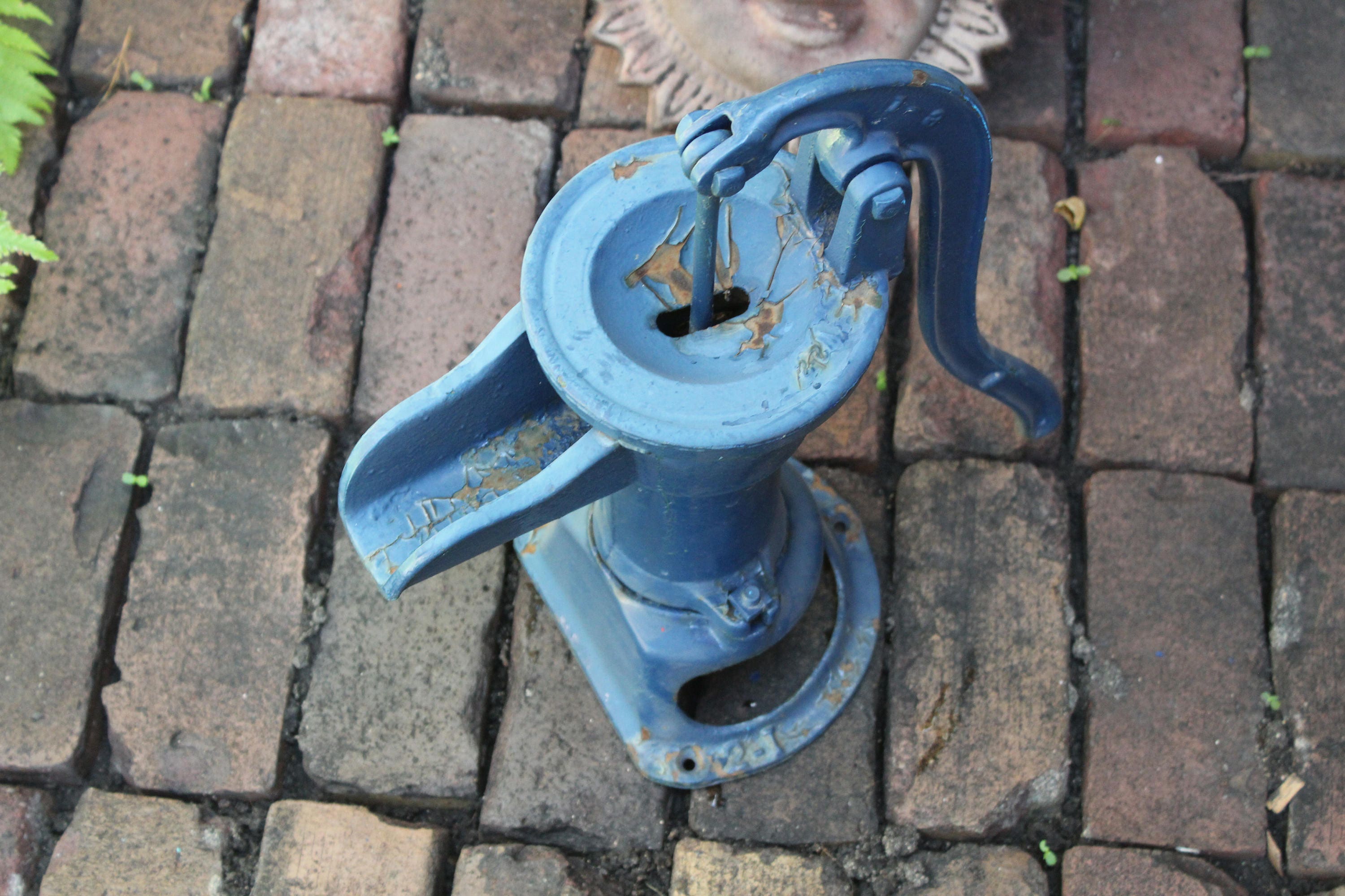 Working antique cast iron water pump, perfect for display in a country kitchen. The pump weighs 20 pounds and measures 18" high. No damage, just age appropriate rust and wear. Can be displayed as is, or easily painted another color. These old water cistern pumps look great sitting in a kitchen by the sink, and they also make great fountains. Enjoy!