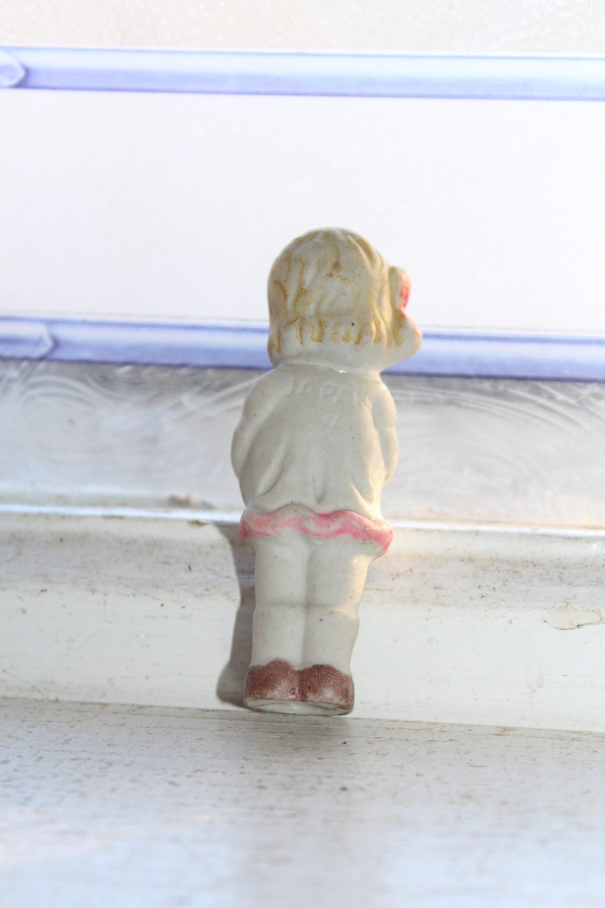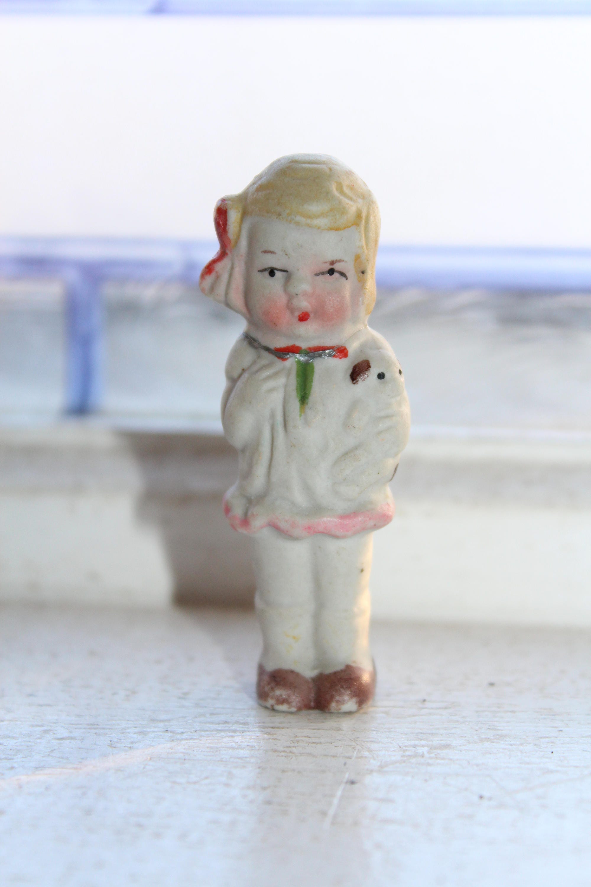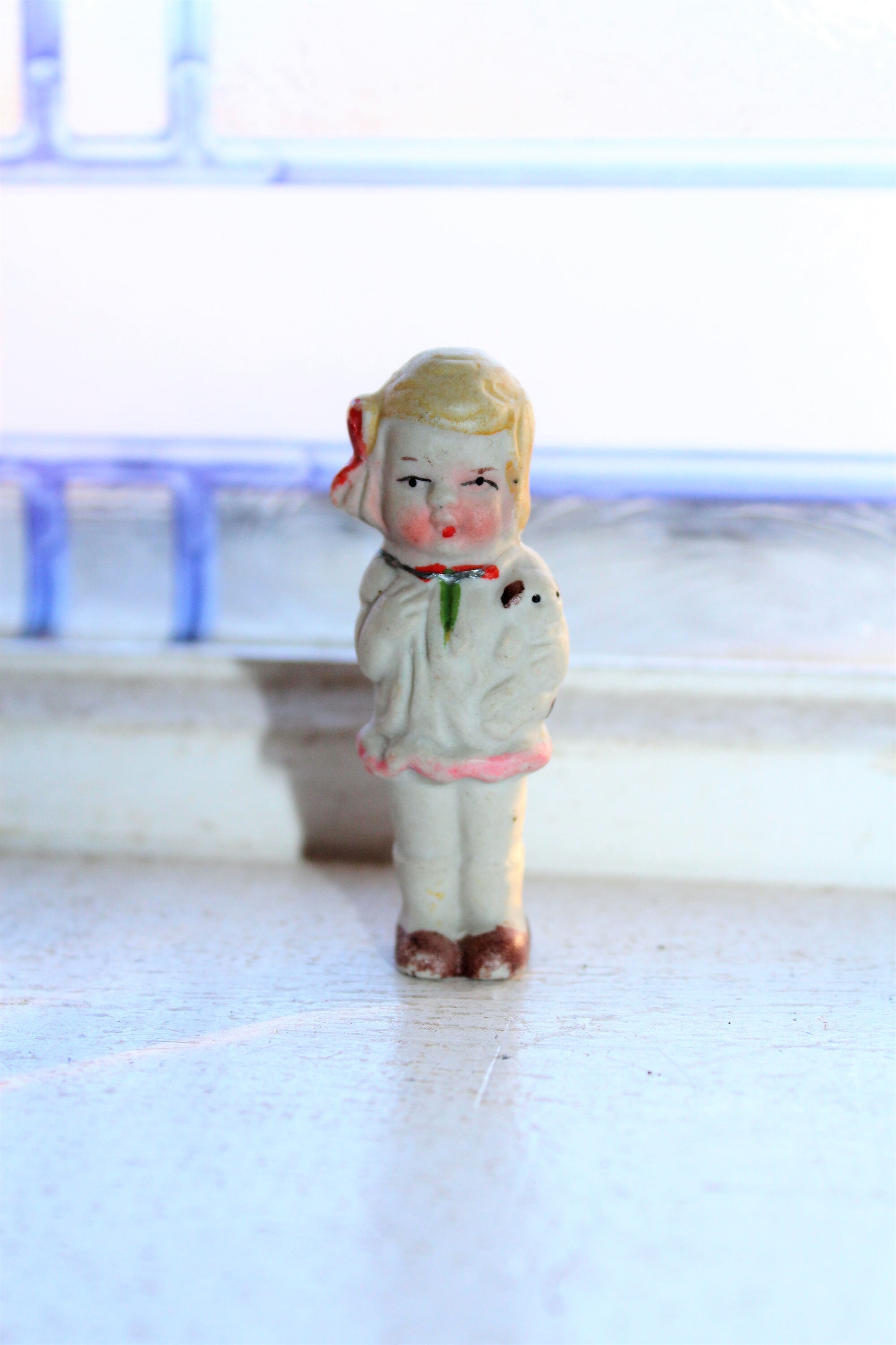 This little cutie is a 1920s Frozen Charlotte doll featuring a girl holder her puppy. She measures about 2 1/2" high and is in good condition. No chips or cracks, minor paint wear. I just think she is adorable with her chubby little cheeks!! Enjoy!