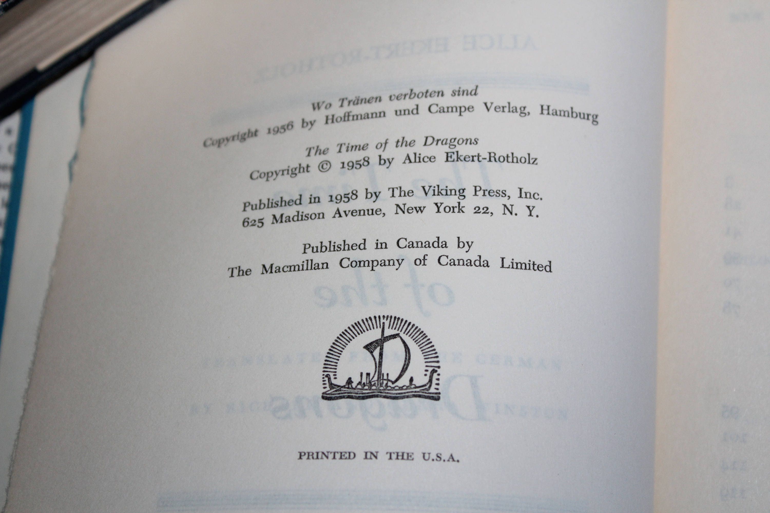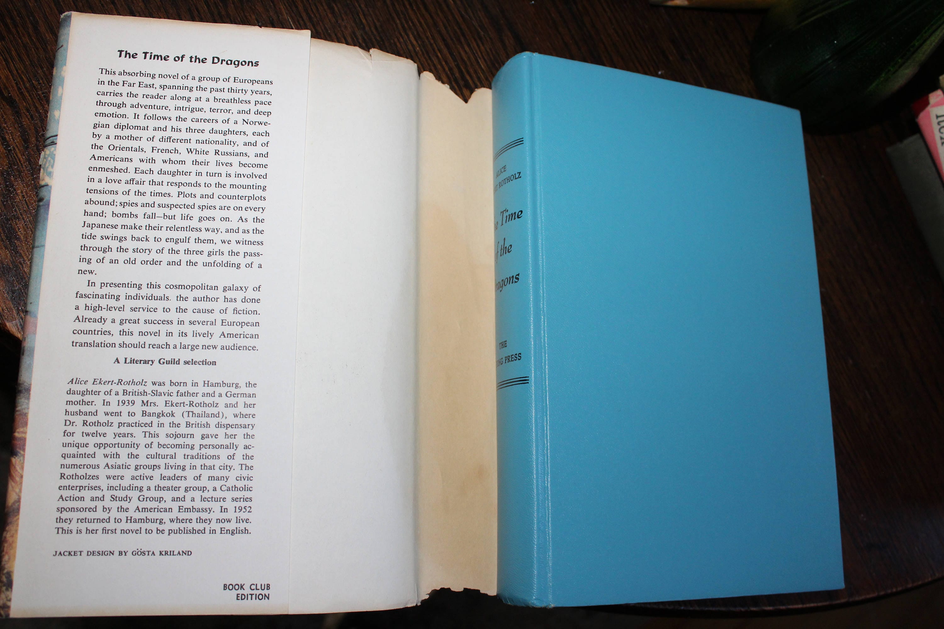 Vintage 1958 hardcover book with dust jacket, The Time of the Dragons by Alice Ekert-Rotholz, in good condition. The dust jacket shows minor edge wear, book is in good condition. It measures 8 1/2" x 5 3/4" and has 436 pages. Enjoy!
