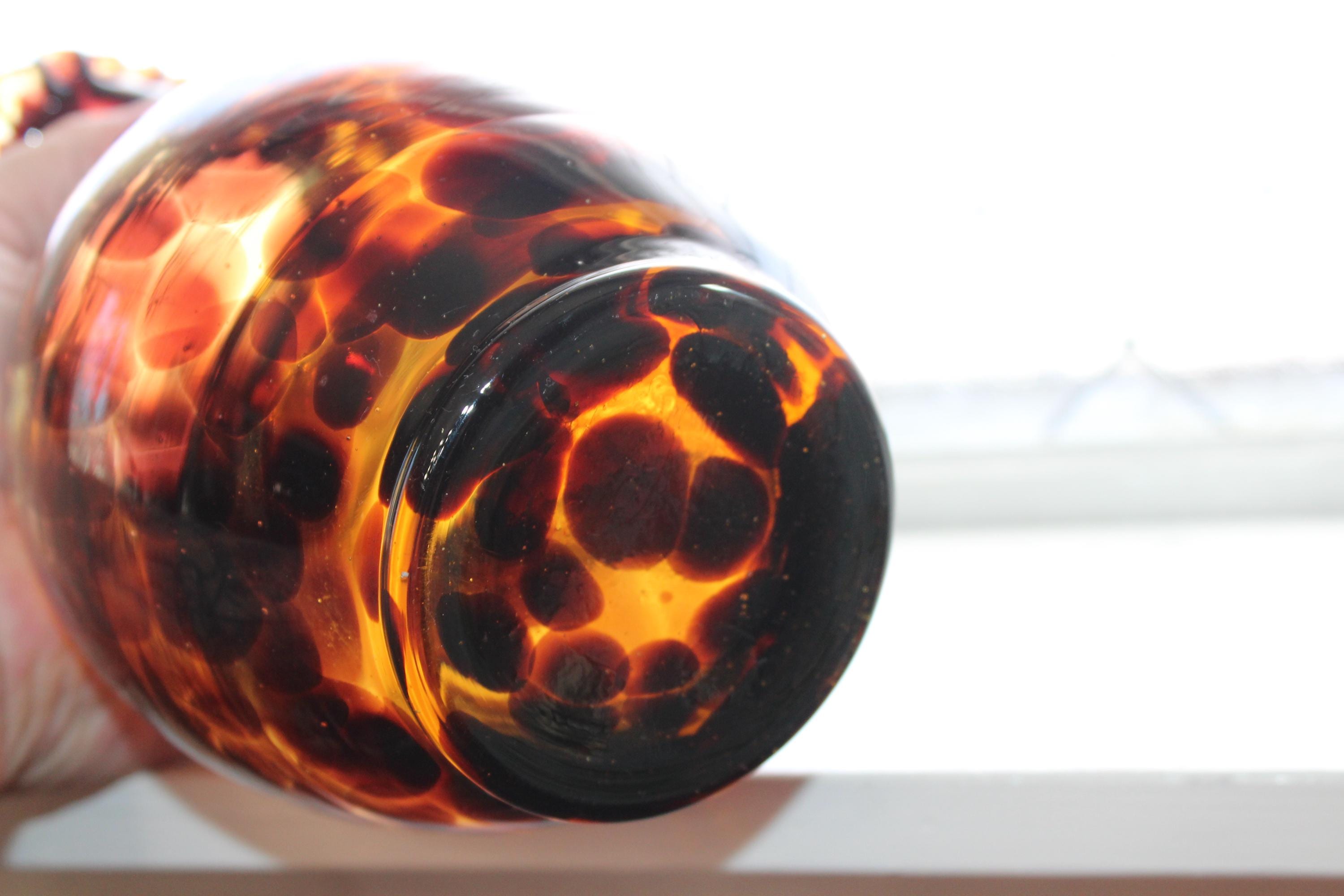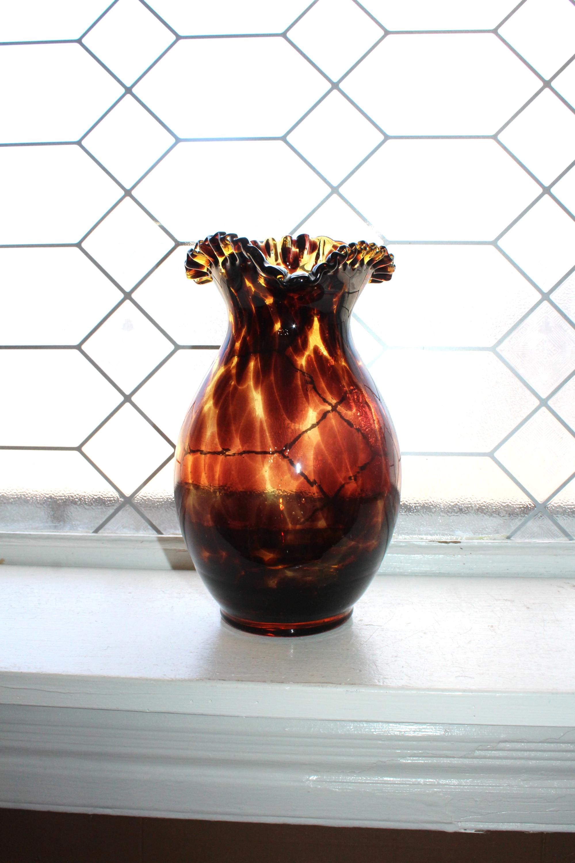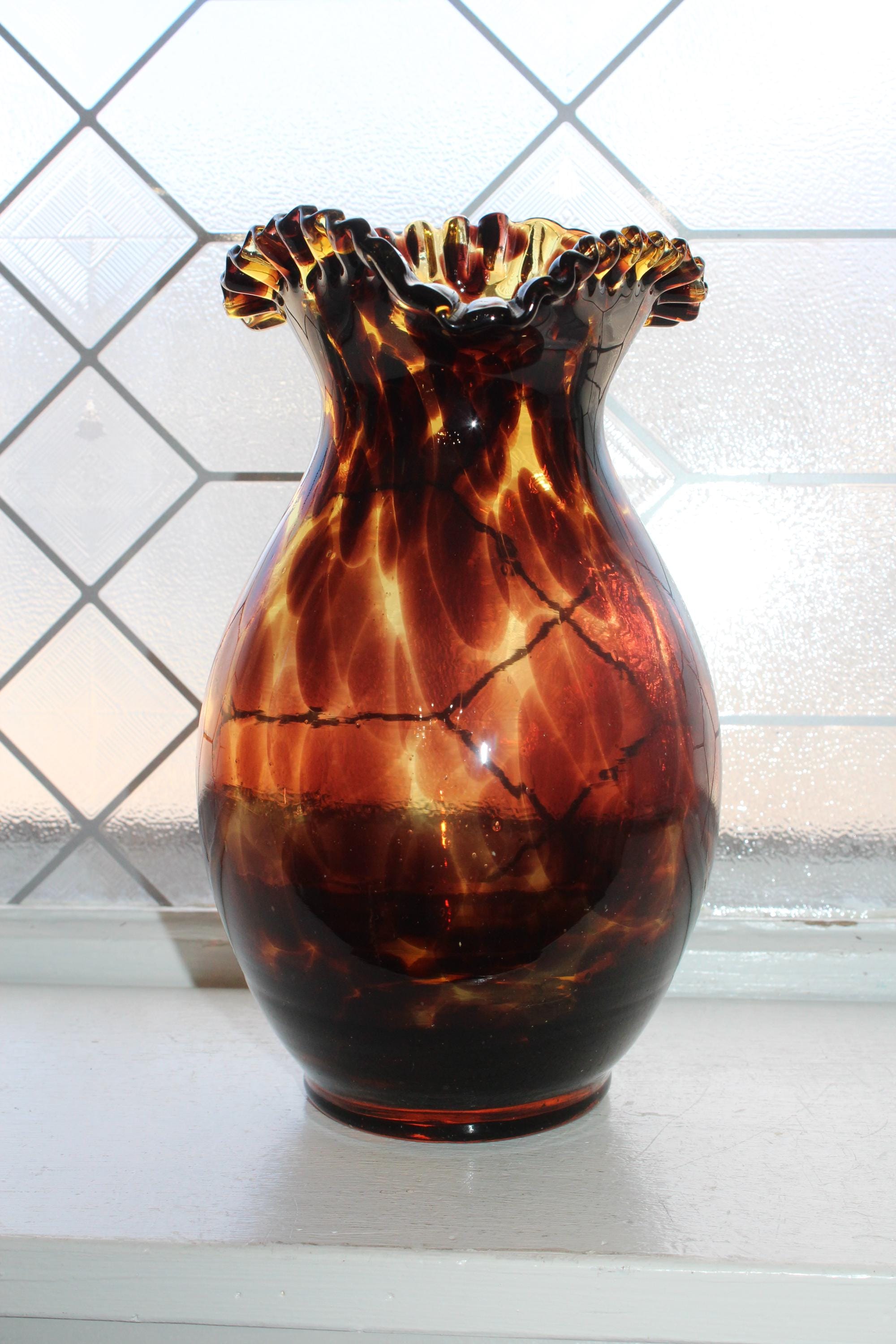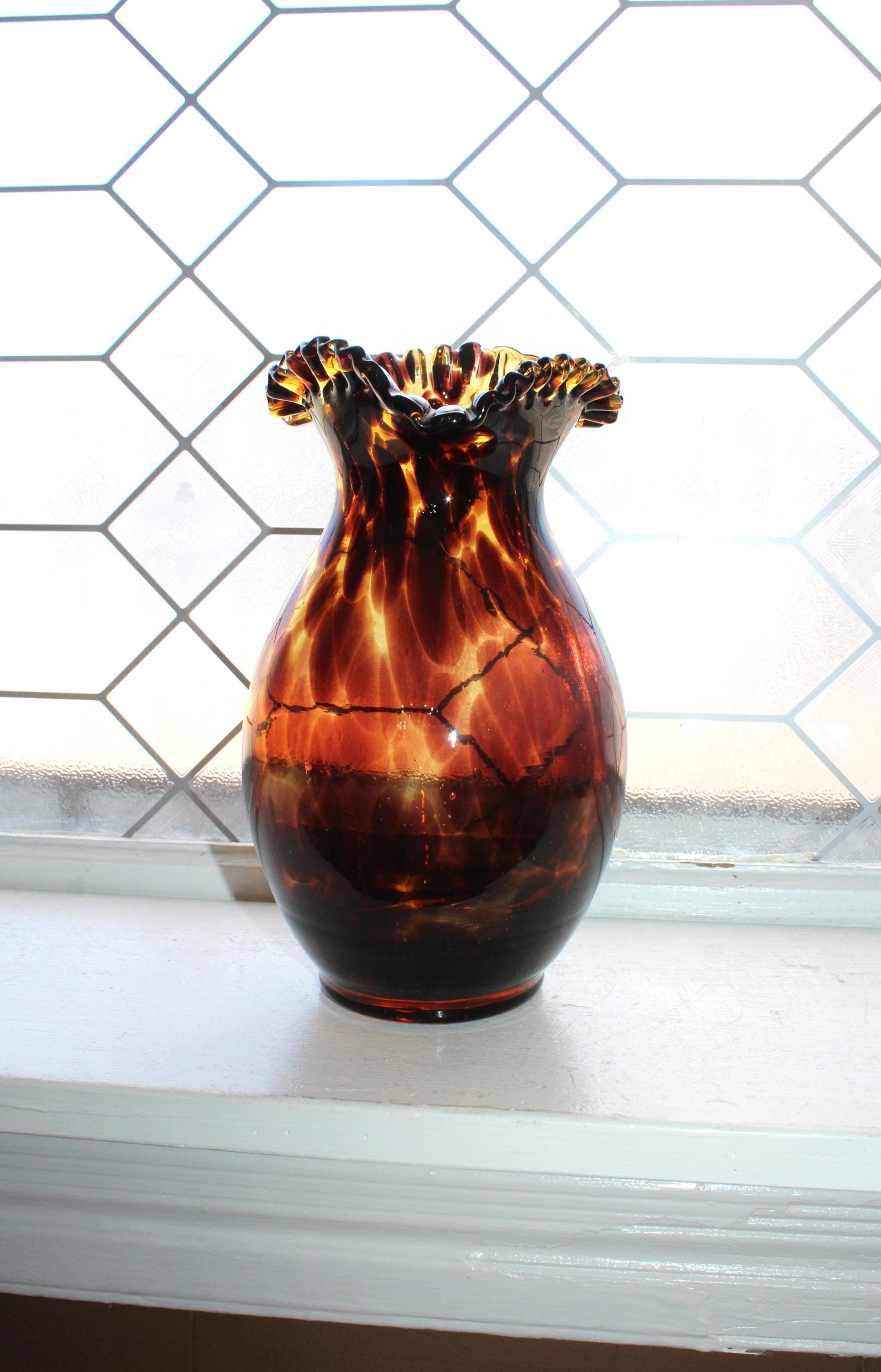 Vintage Mid Century tortoise shell art glass vase with crimped rim, in excellent condition. The vase measures 9" high and has no chips or cracks. Enjoy!