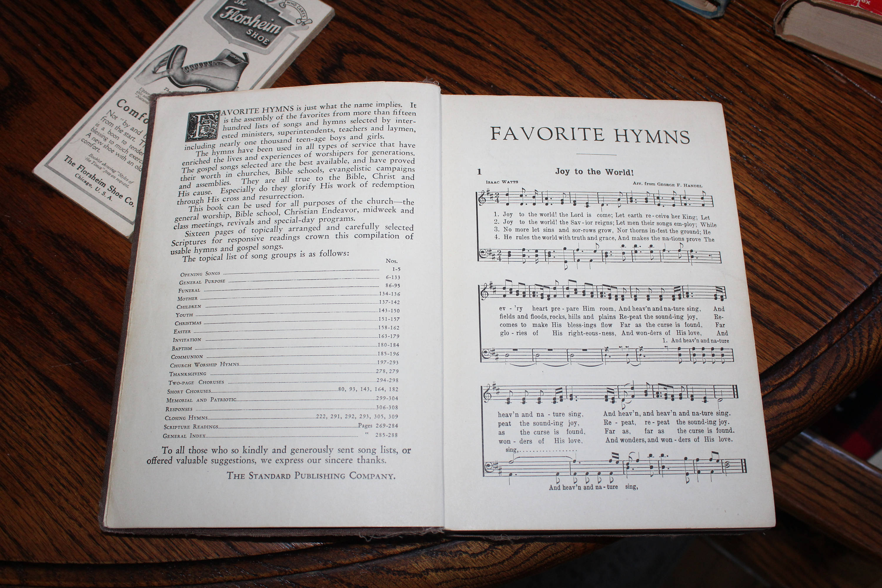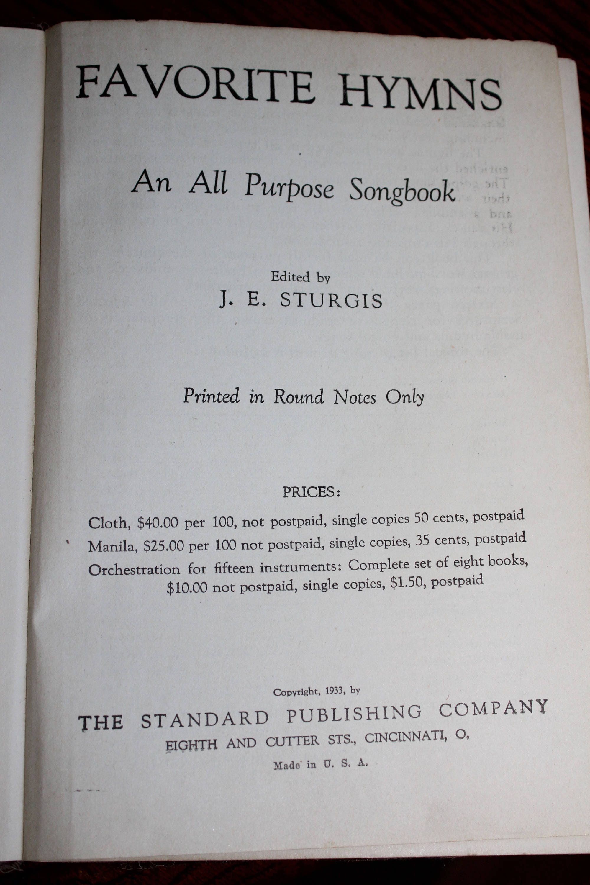 Vintage 1933 book, Favorite Hymns, part of a local Church of Christ's library that they sold off. The book measures 8 3/8" x 5 3/4" and has 288 pages. It has been well loved and used over the years but is still enjoyable and useful. Enjoy!