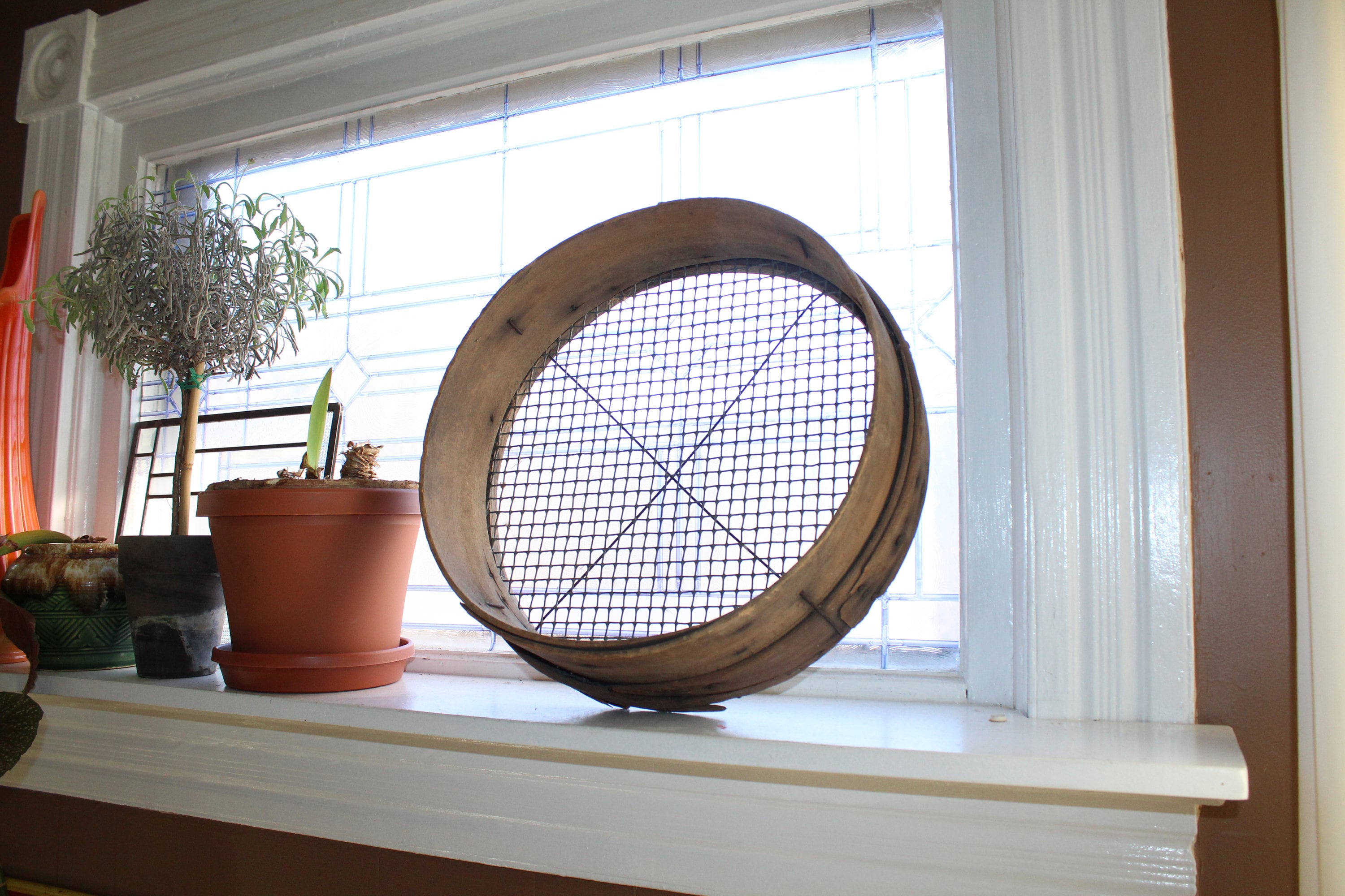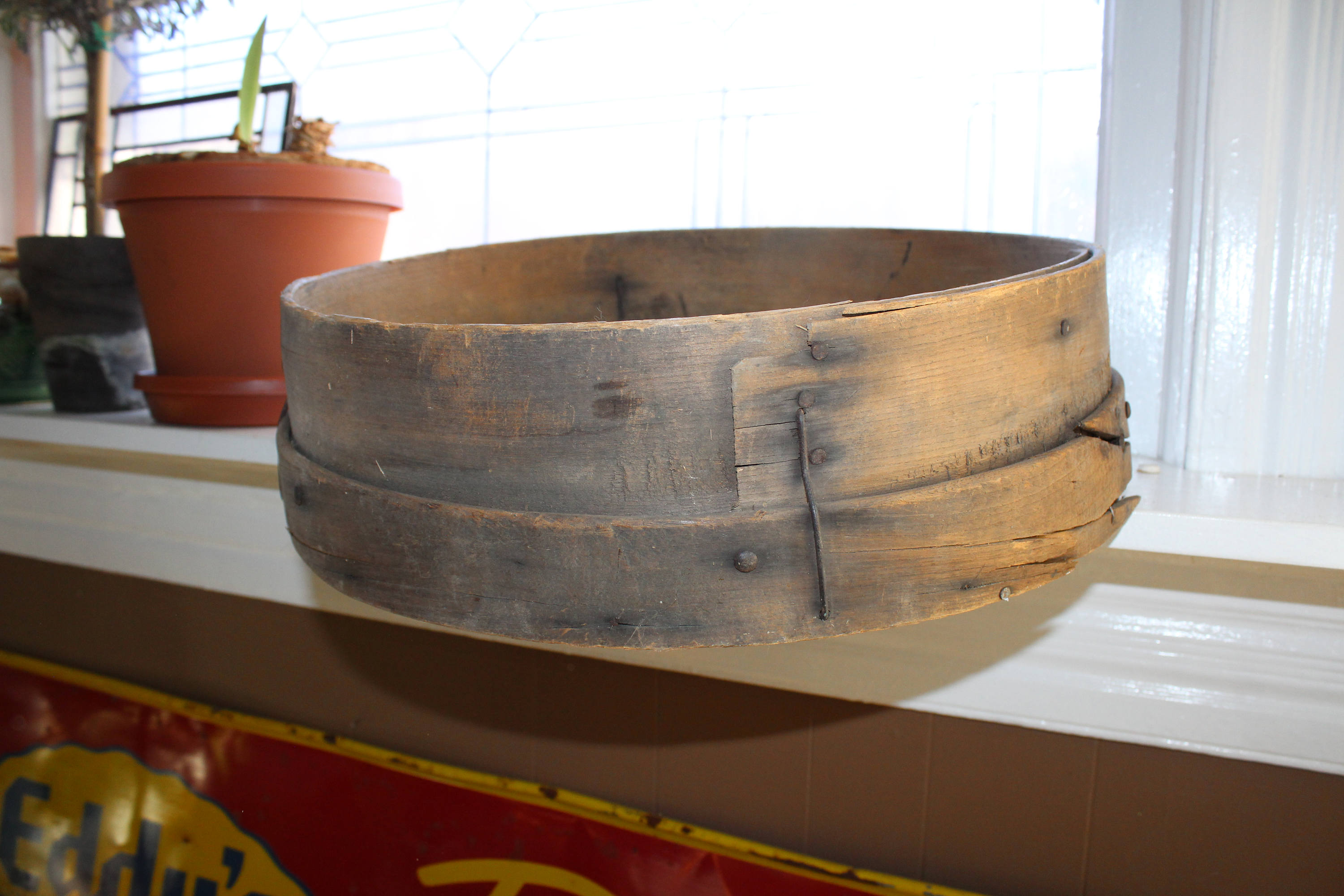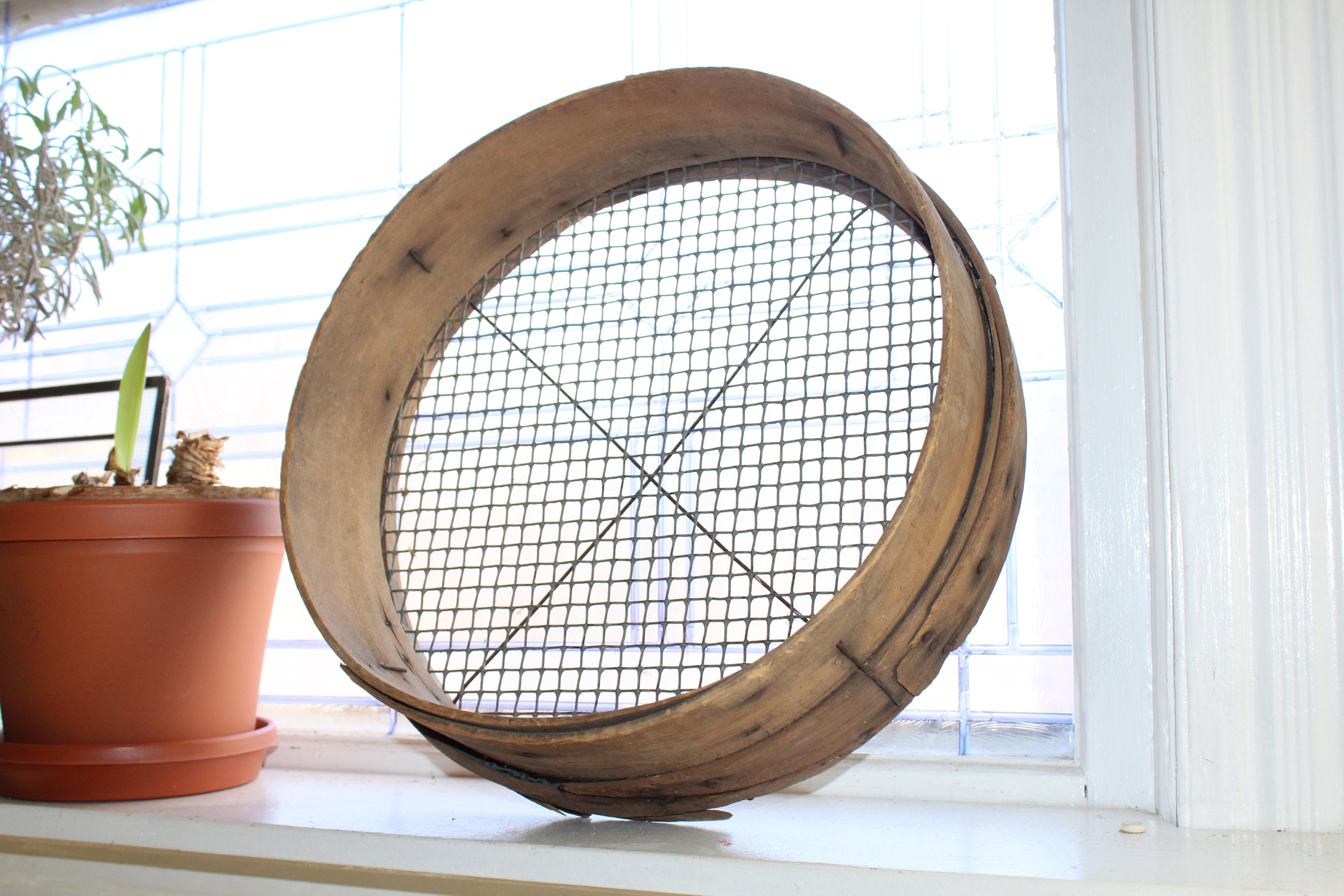 Large antique wood and mesh sieve/screen. The sieve measures 16 1/2" wide x 4 3/4" deep and is great for use and display in a country home. Enjoy!