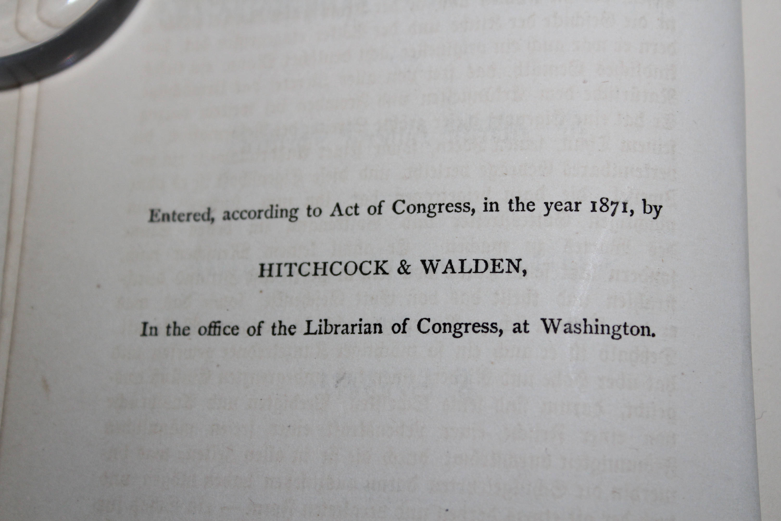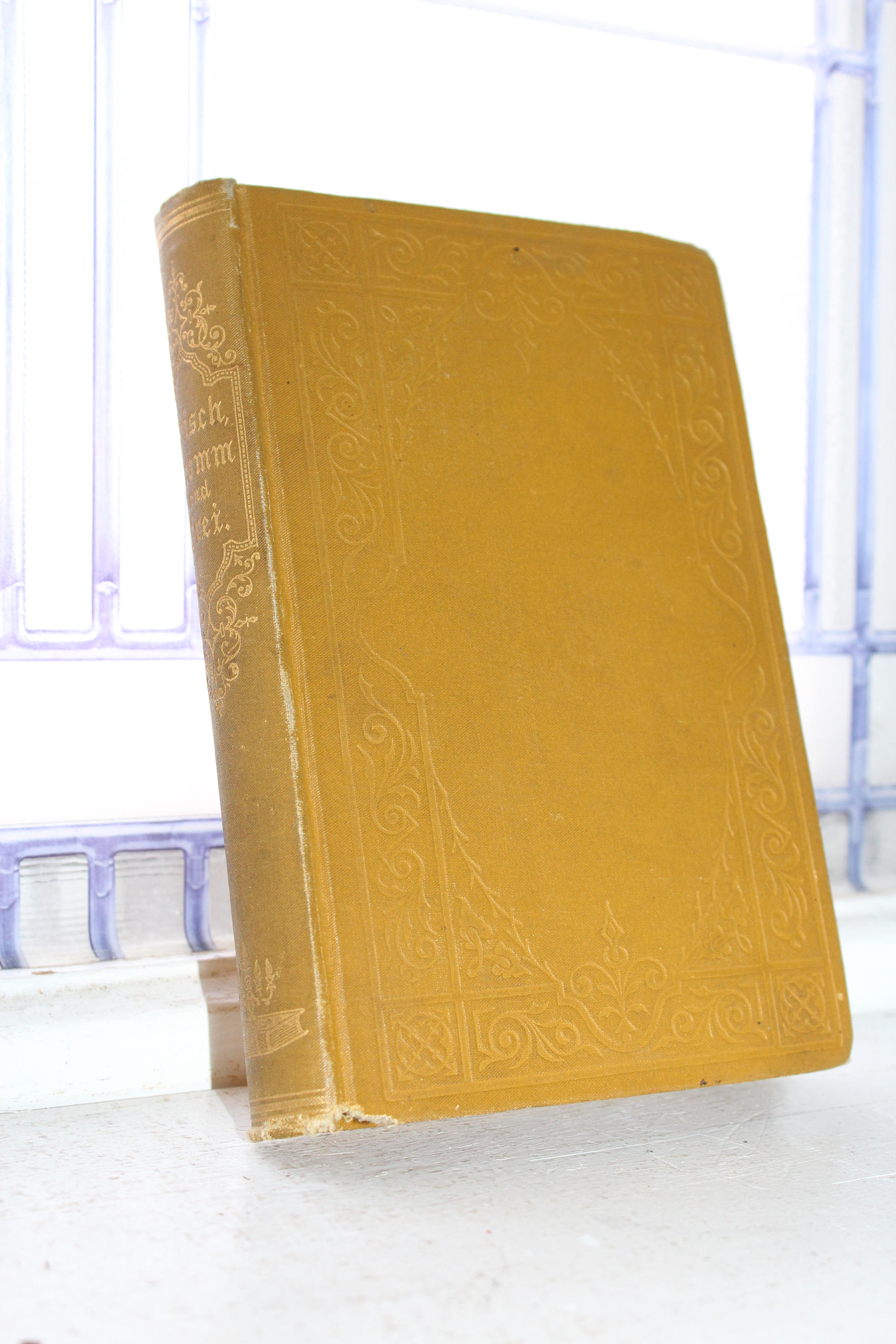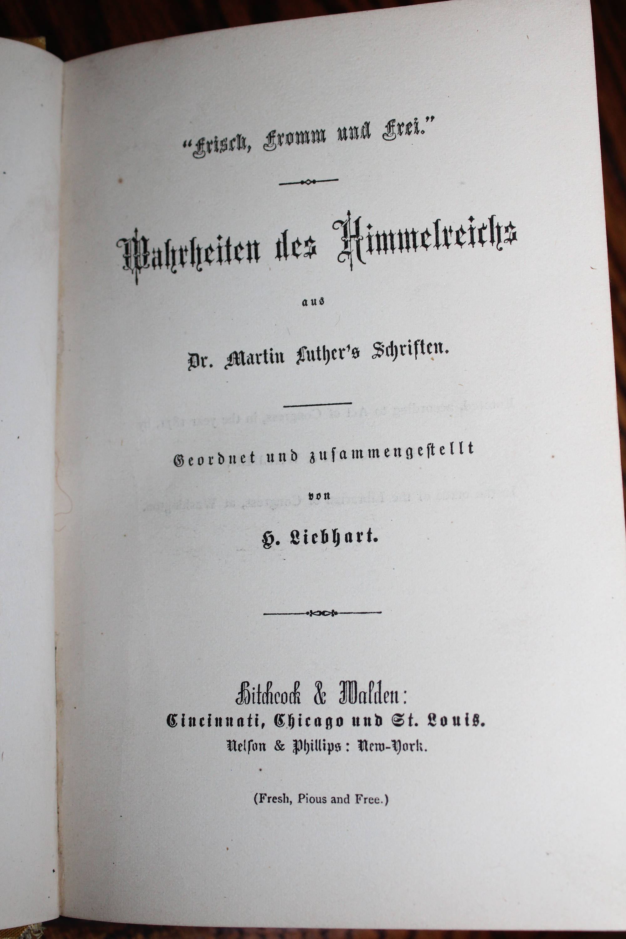 Antique 1871 German language Christian book,Frisch Fromm Und Frei, translated as Fresh Pius and Free, in good condition. The book measures 7" x 4 1/2" and has 256 pages. Cover shows wear to the lower spine. Enjoy!