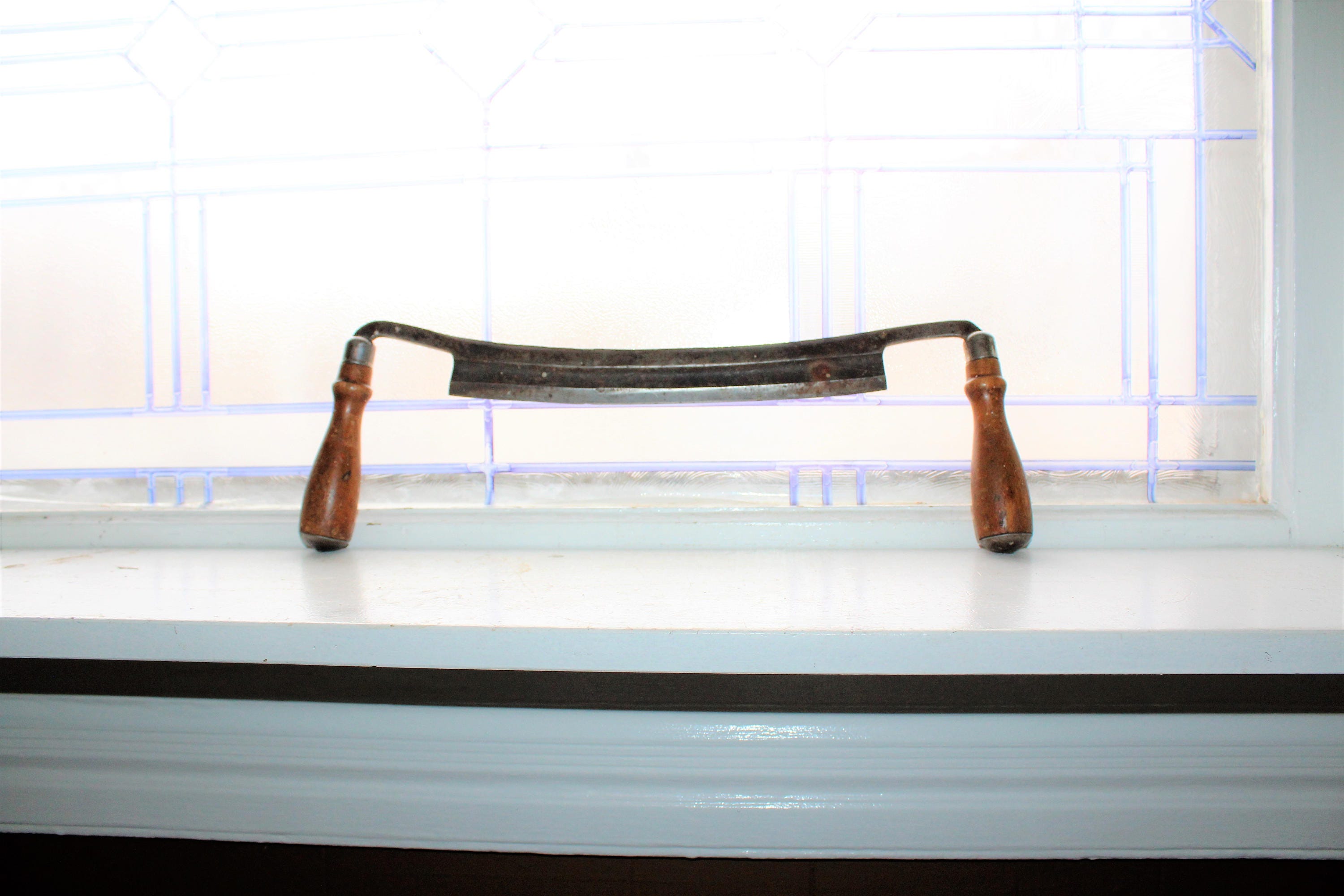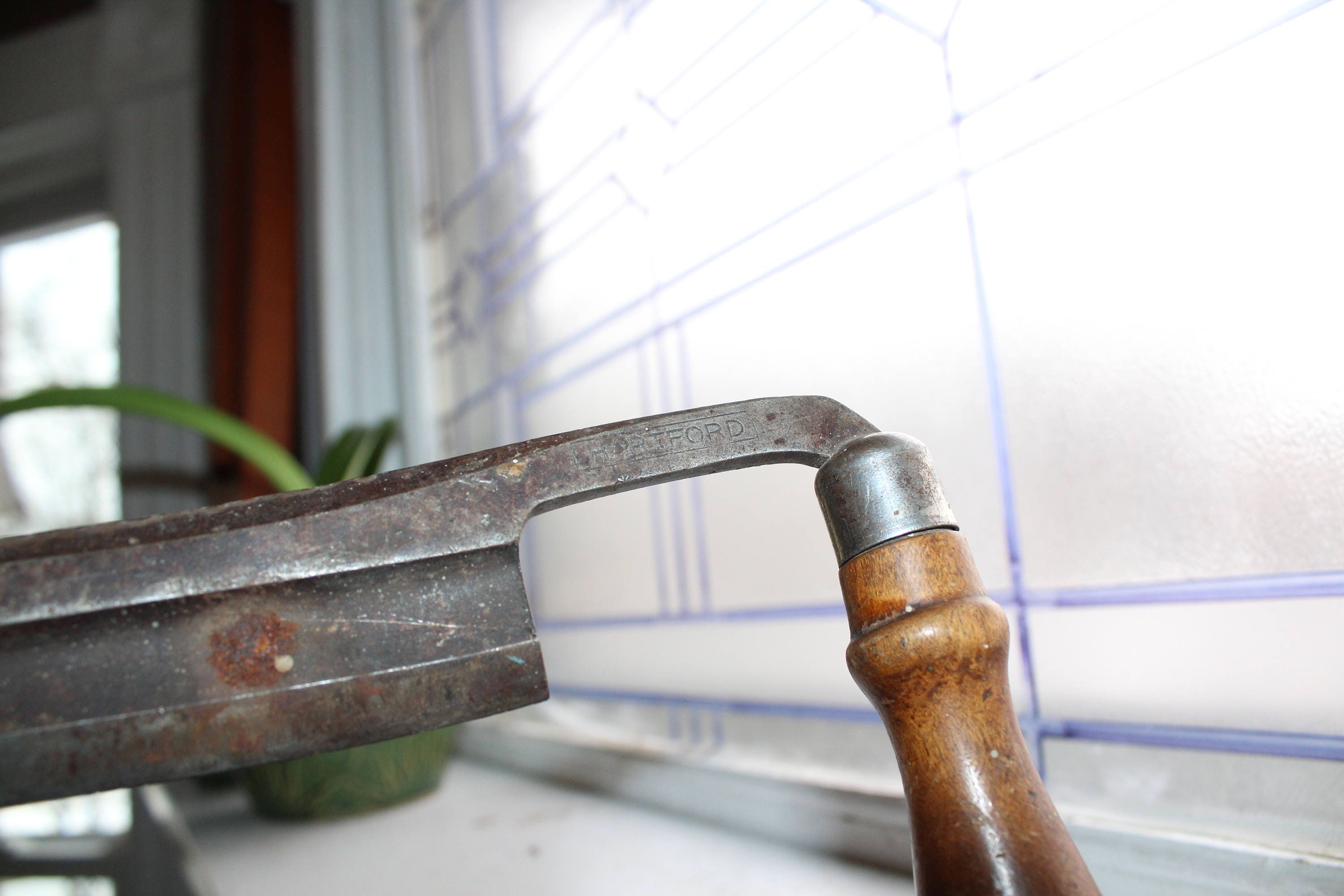 This antique Hartford draw knife display well in a country home and is in good condition. It measures 16" long and can be displayed as is or cleaned up just a bit for use. Enjoy!