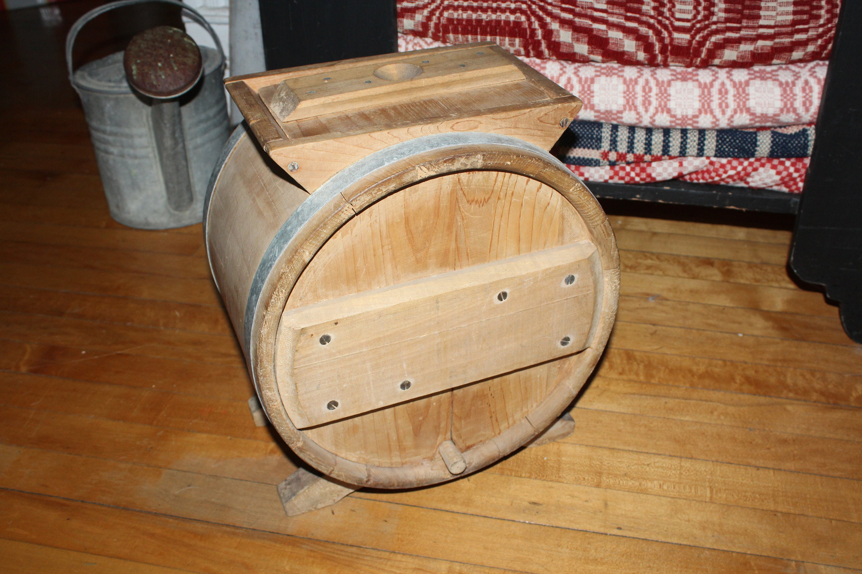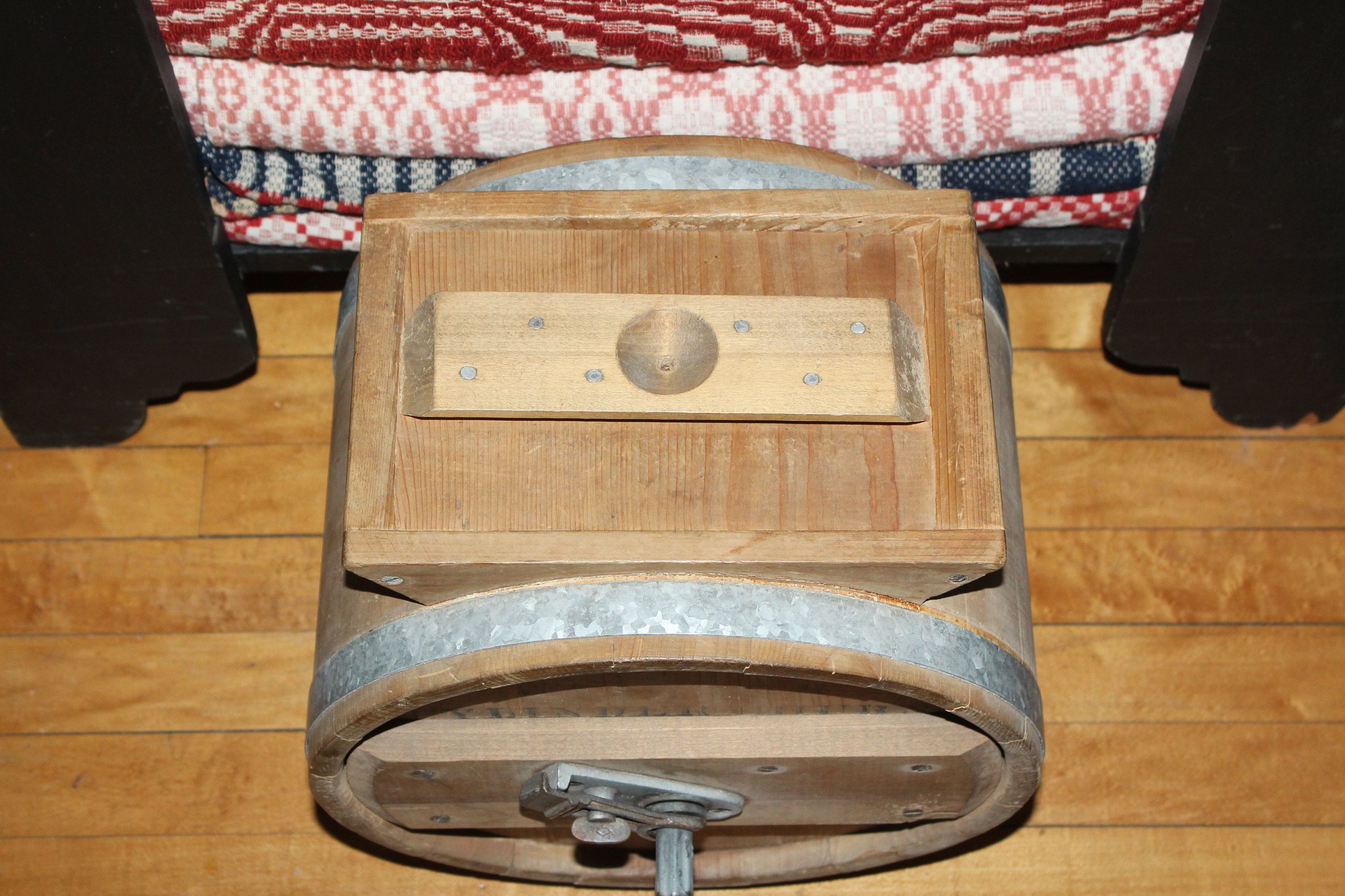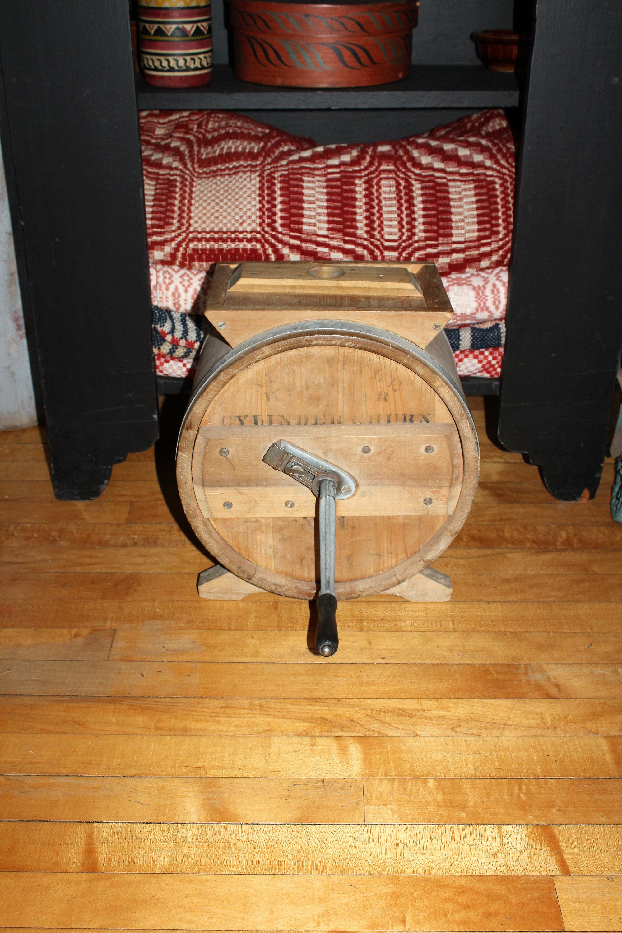 Antique wooden cylinder crank style butter churn, in very good working condition. The front reads "New Style White Cedar cylinder churn No. 1, 3 Gal.". This rustic churn dates from the early 1910s-20s and measures 14 3/4" high x 13" wide. The inside paddle is intact. Age appropriate light wear, and a crack in the back panel. Perfect for display in a country kitchen. Enjoy!