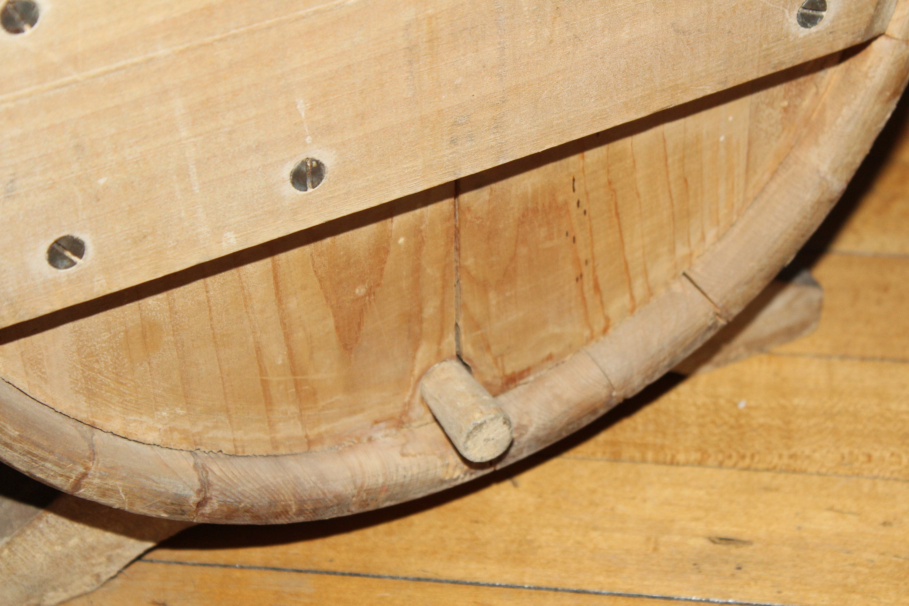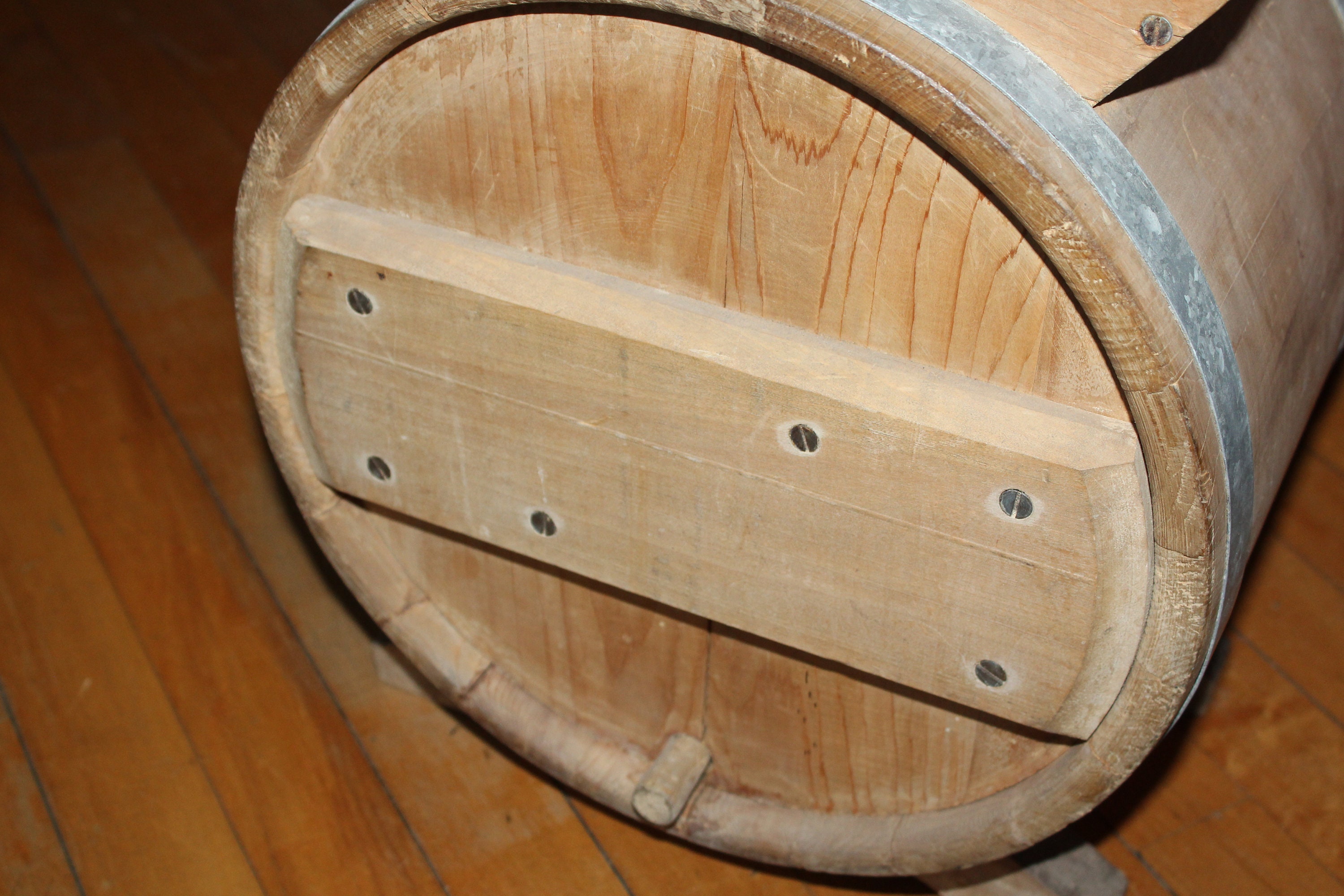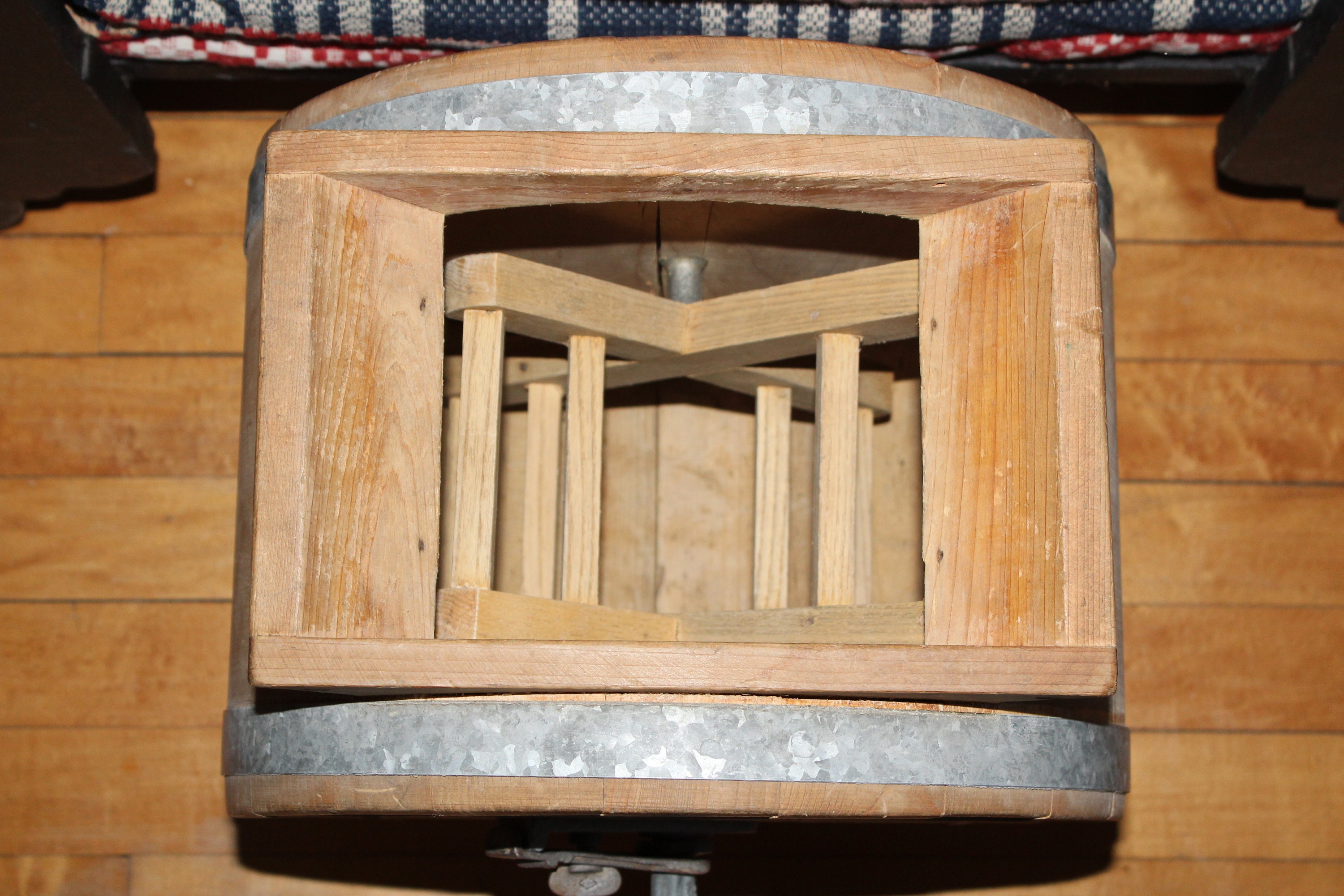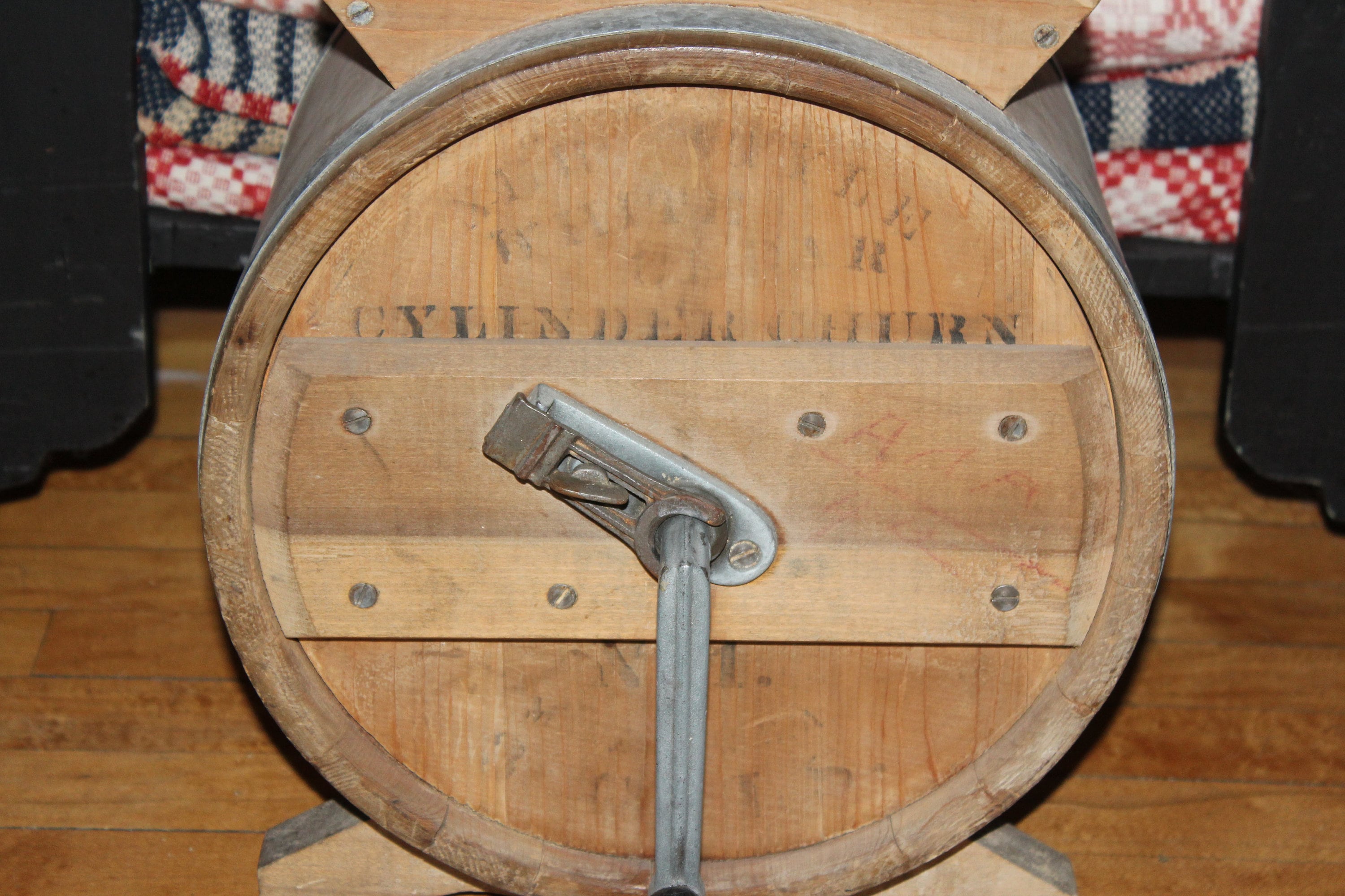 Antique wooden cylinder crank style butter churn, in very good working condition. The front reads "New Style White Cedar cylinder churn No. 1, 3 Gal.". This rustic churn dates from the early 1910s-20s and measures 14 3/4" high x 13" wide. The inside paddle is intact. Age appropriate light wear, and a crack in the back panel. Perfect for display in a country kitchen. Enjoy!