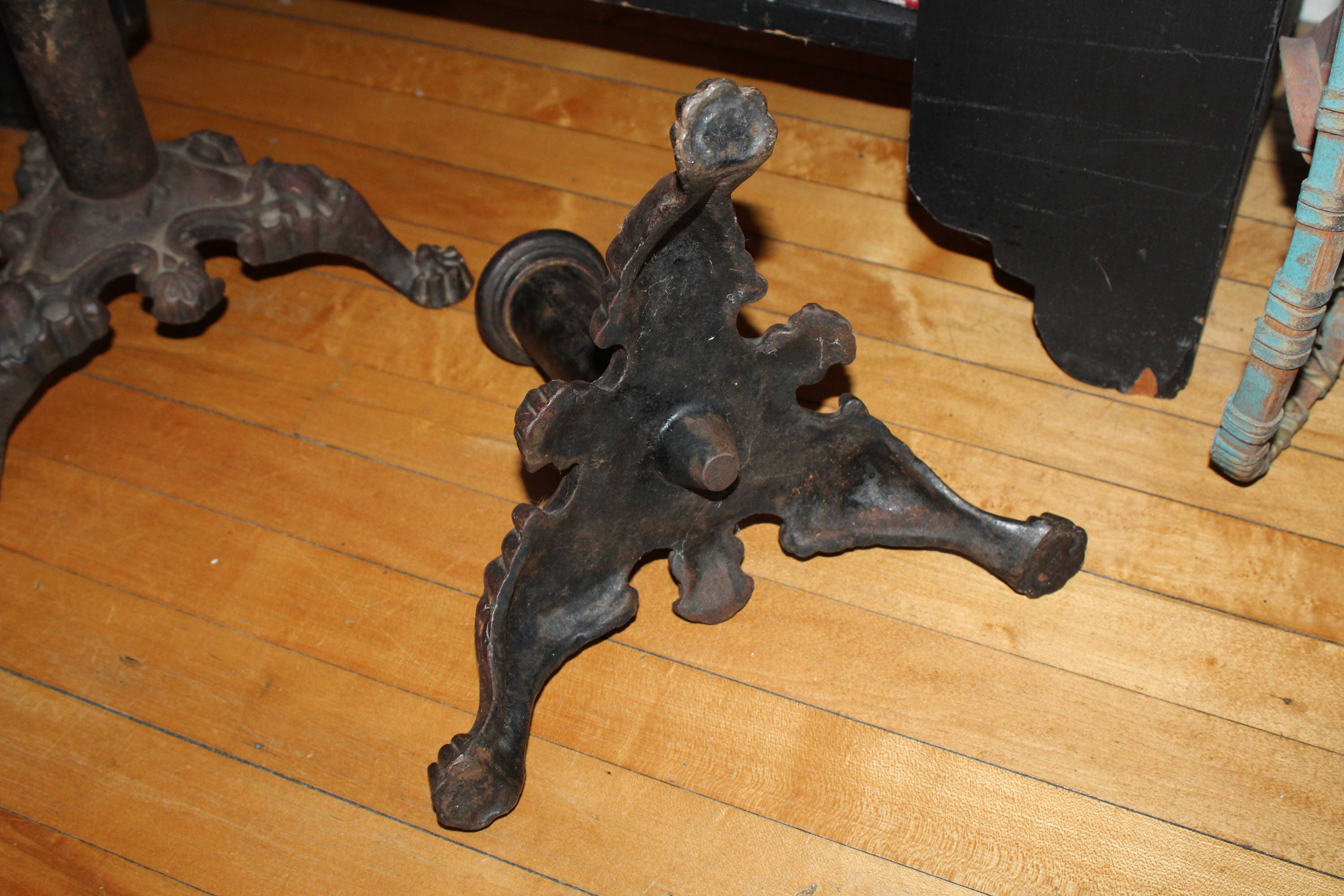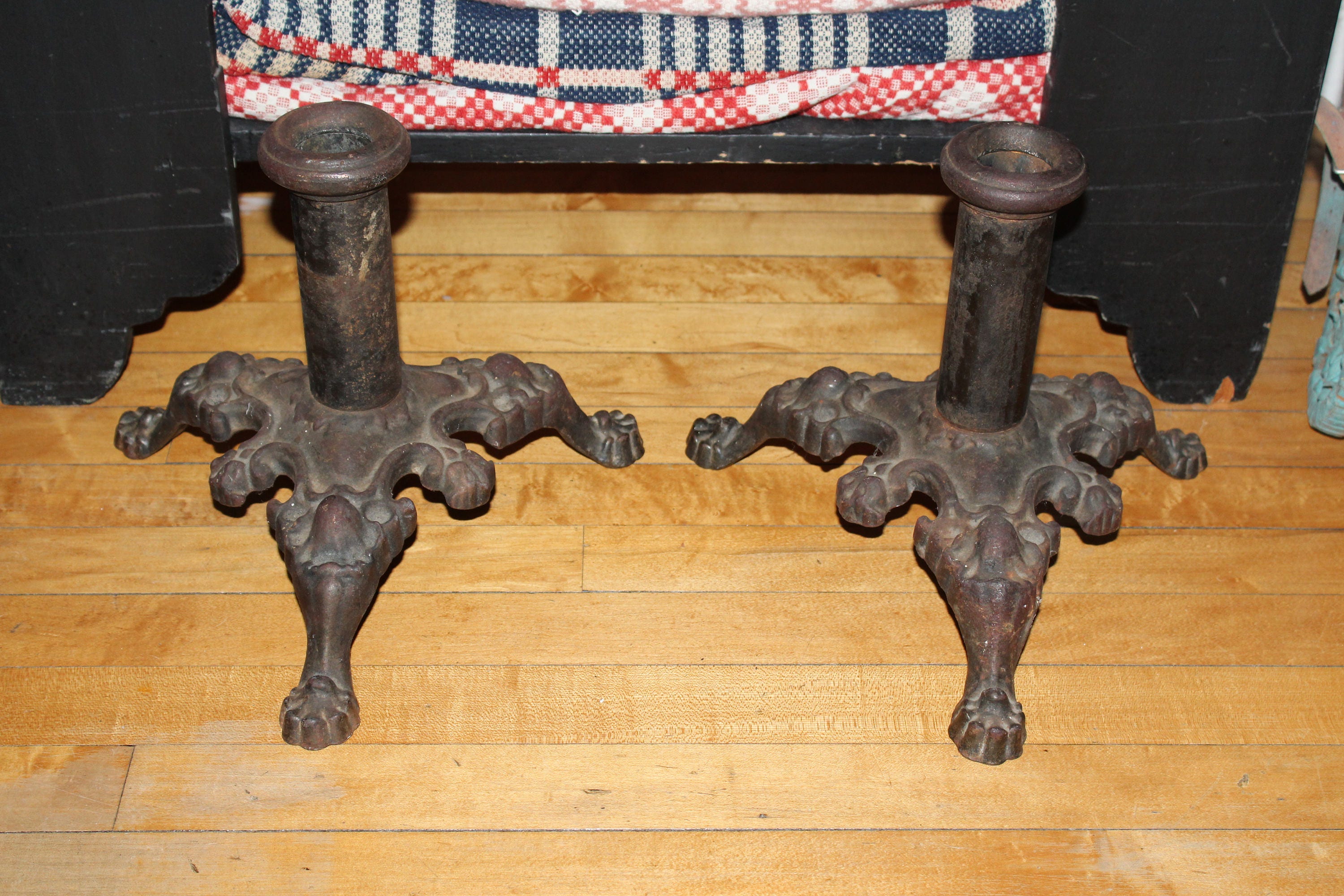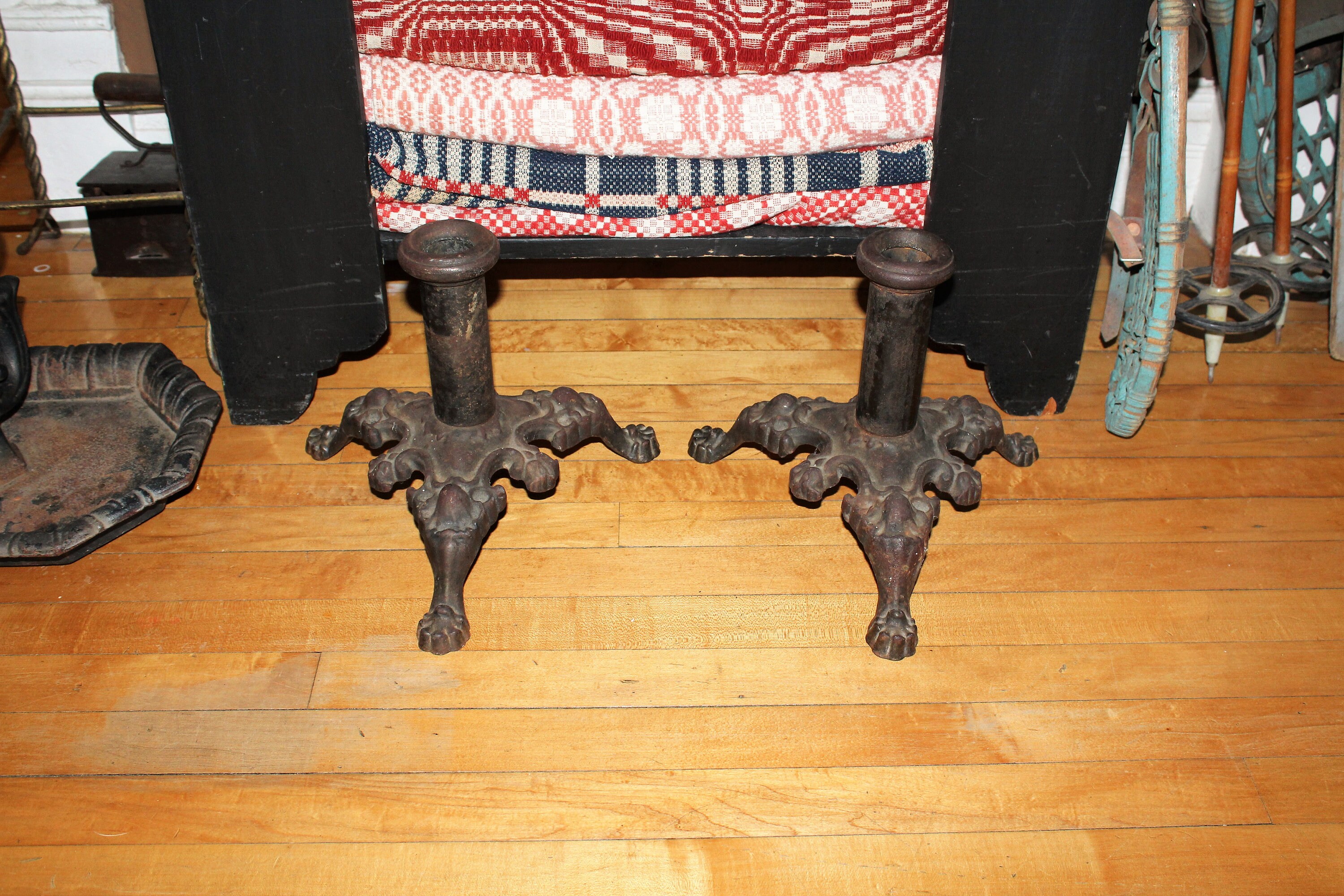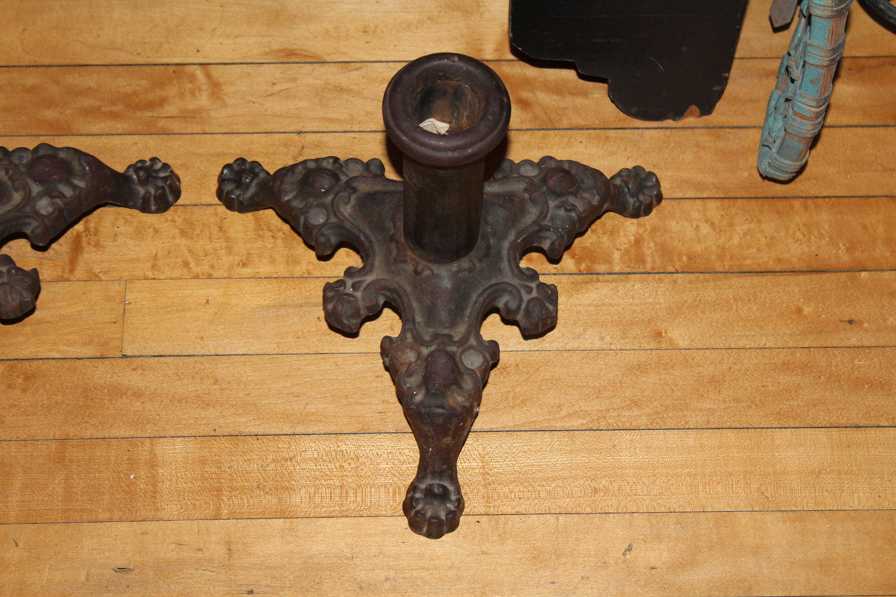 Pair of antique Victorian flag pole stand made of ornate cast iron, perfect for use or display in a vintage home! They're heavy cast iron, weighing roughly 10 lbs. each. They measure 10" high. Age appropriate rust, no damage and display very well. Enjoy!