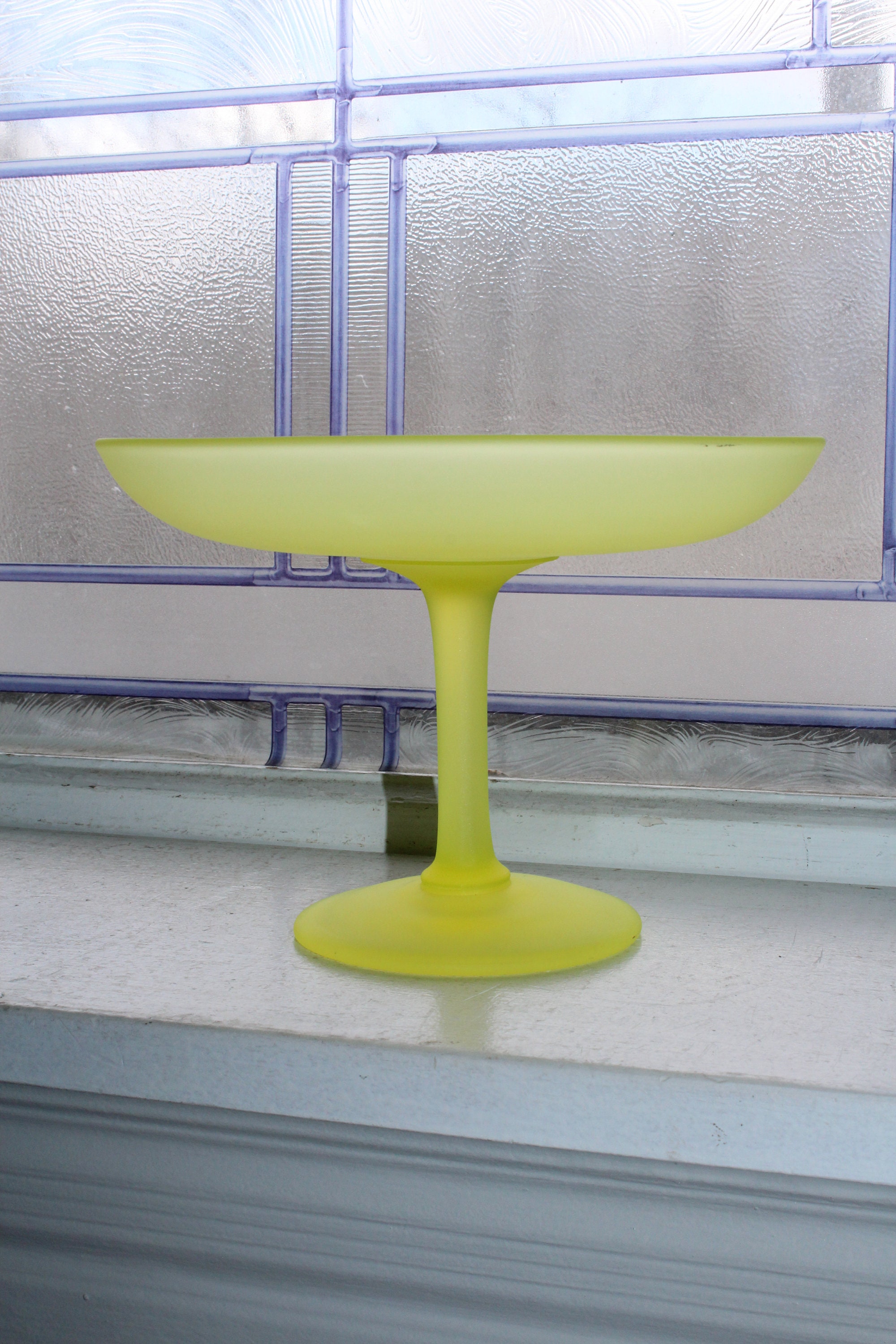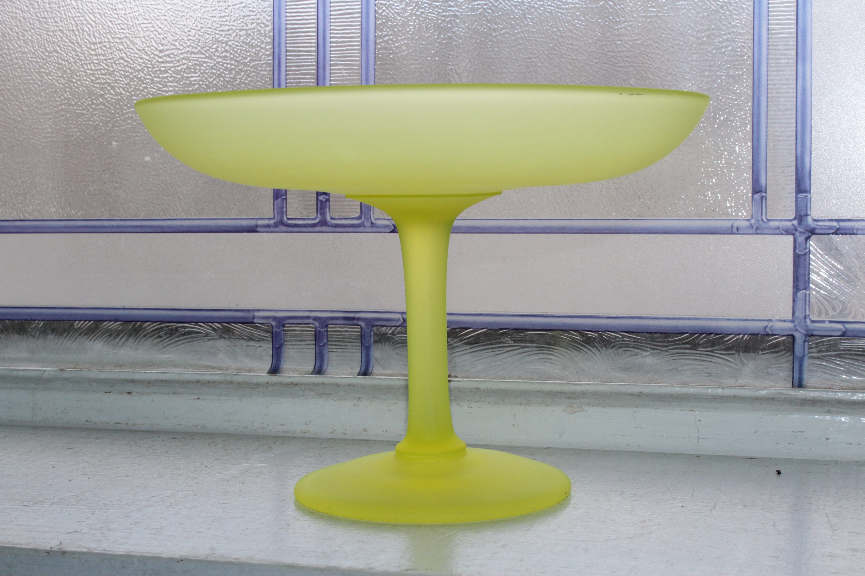 Vintage Tiffin yellow satin vaseline glass compote or candy dish, in excellent condition. The dish measures 5" high x 7 1/4" wide and has no chips or cracks. Perfect for use or display. Enjoy!