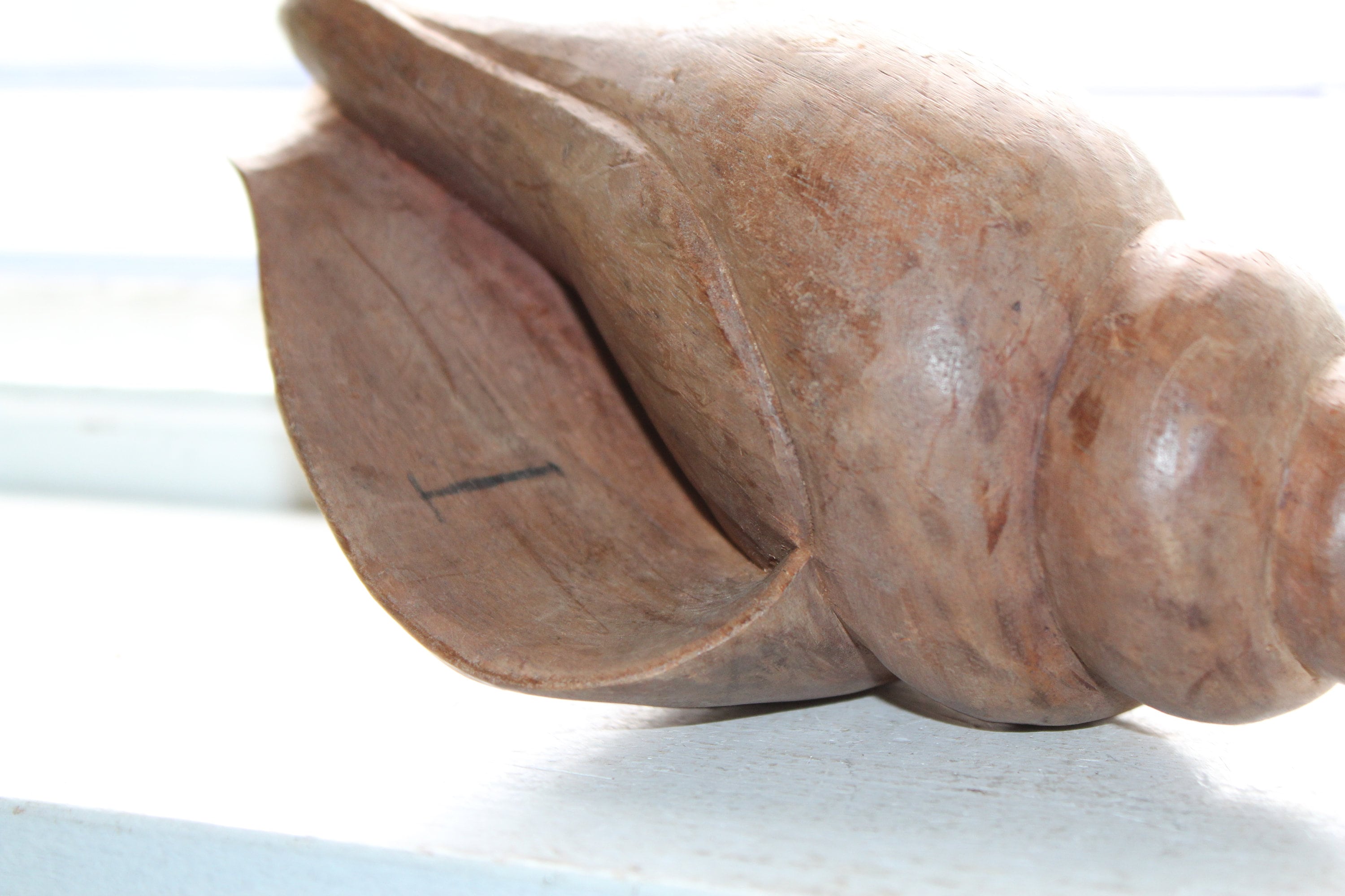Large hand carved wooden folk art sea shell, in very good condition and perfect for use and display in a beach home or nautical theme. It is marked with an I, measures 8 1/2" wide and weighs 3/4 lbs. Enjoy!