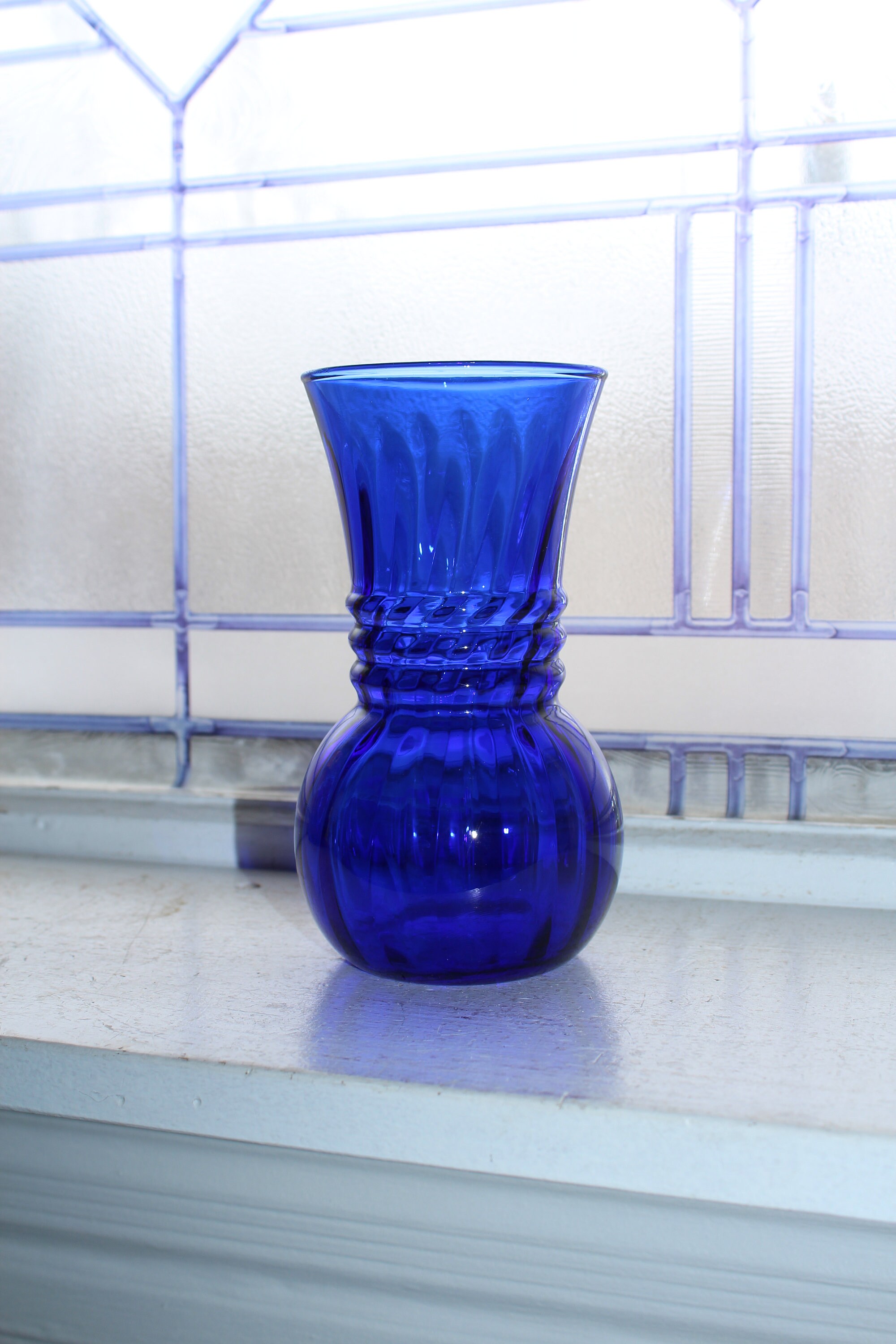 Vintage Art Deco cobalt blue glass ribbed vase, in excellent condition. The vase measures 6 3/8" high x 3 1/4" wide at the top. No chips or cracks, perfect for use or display. Enjoy!