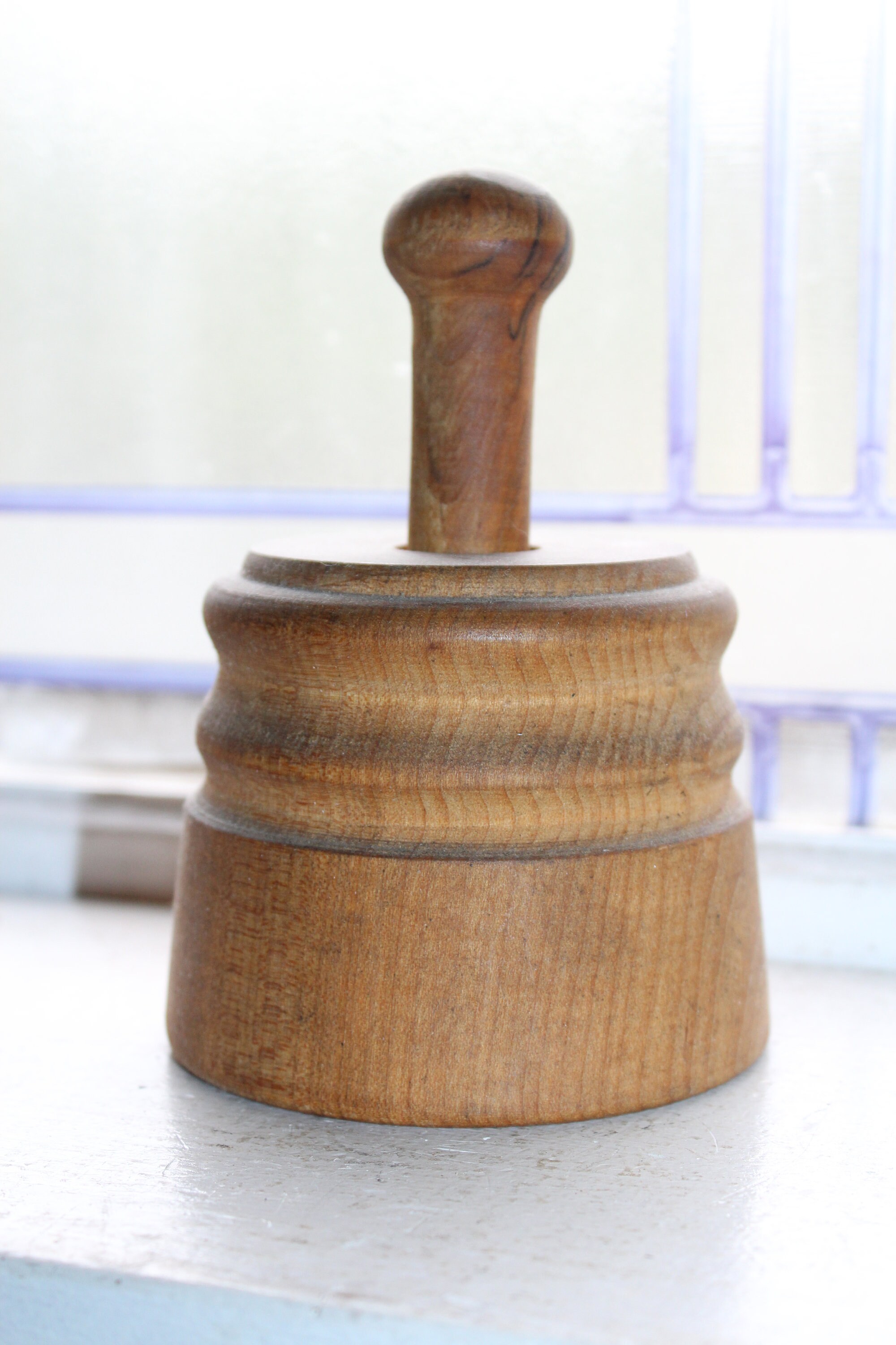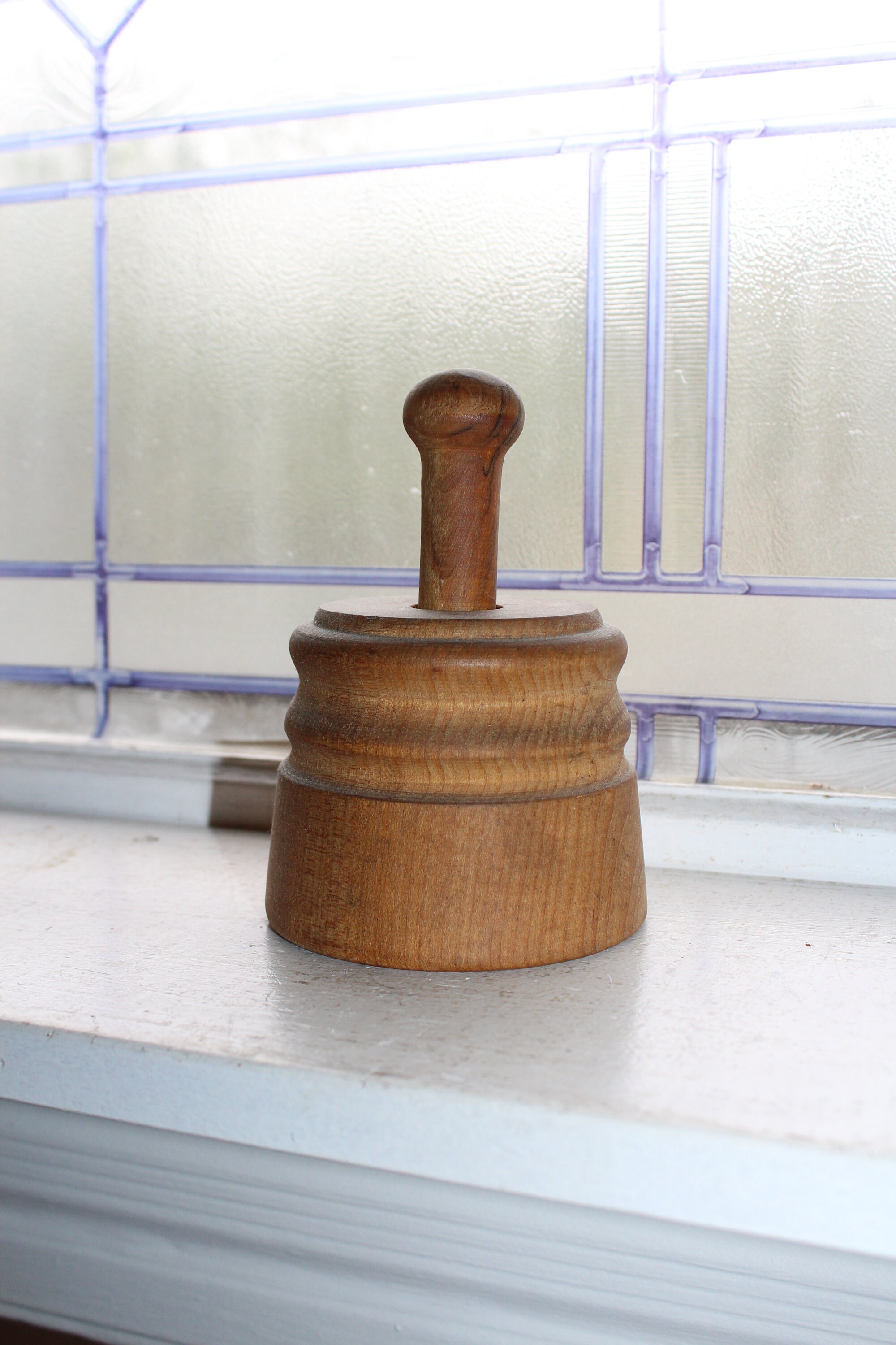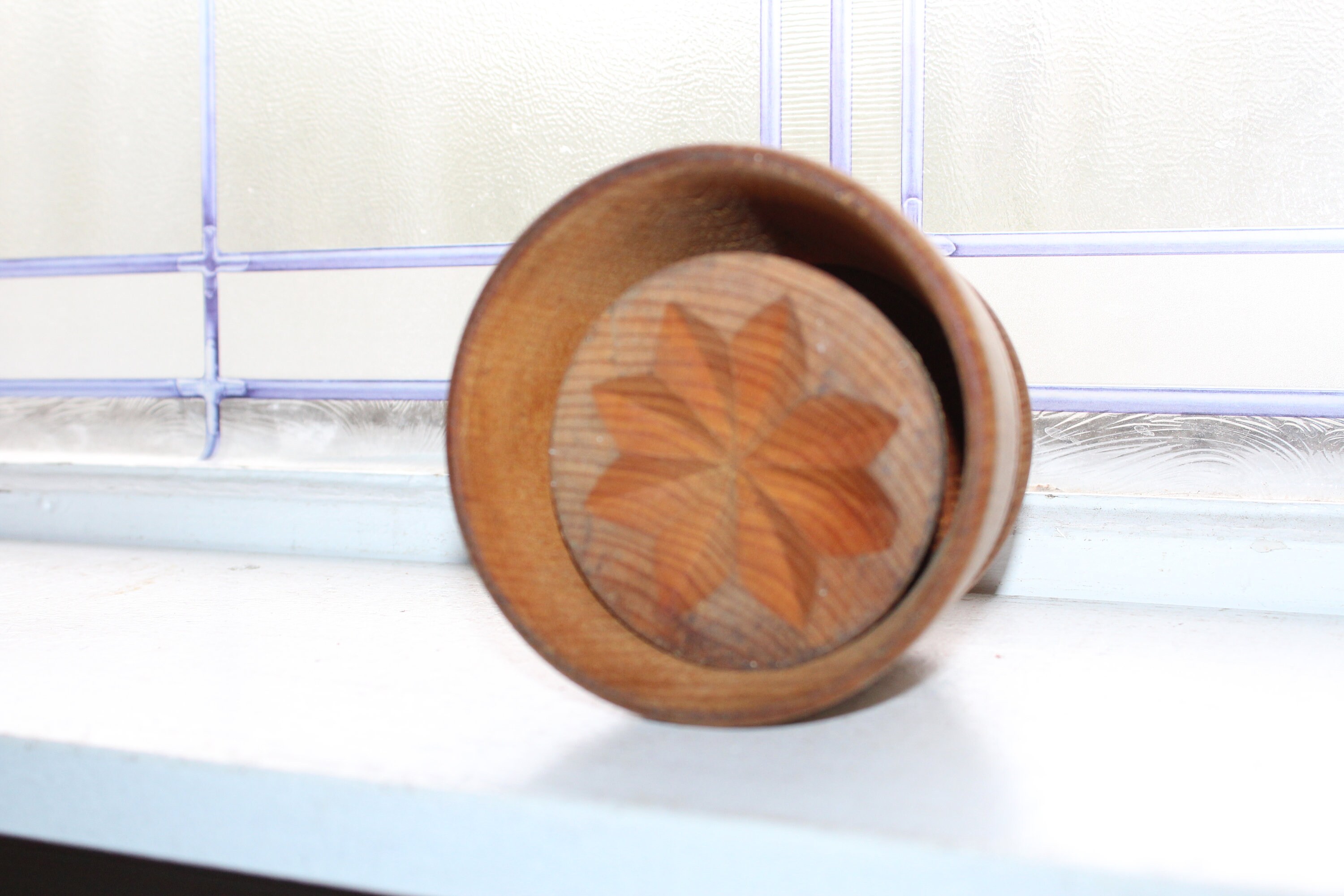 Antique 1800s wood butter mold with a geometric flower pattern, in good condition. The mold measures 3 1/4" high not including the handle, and 4" wide. Perfect for display in a country home. Age appropriate wear and cracking, still usable. Enjoy!