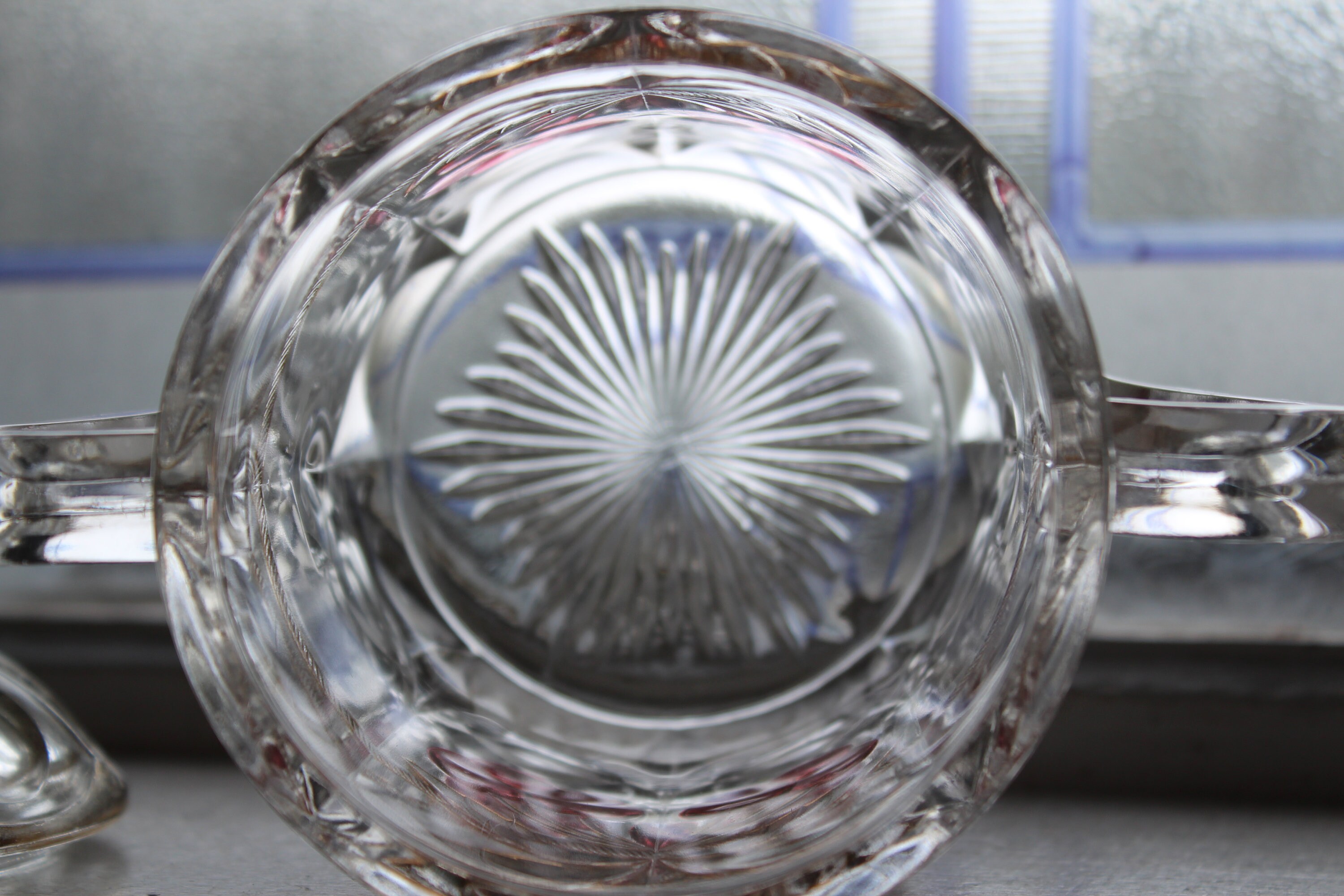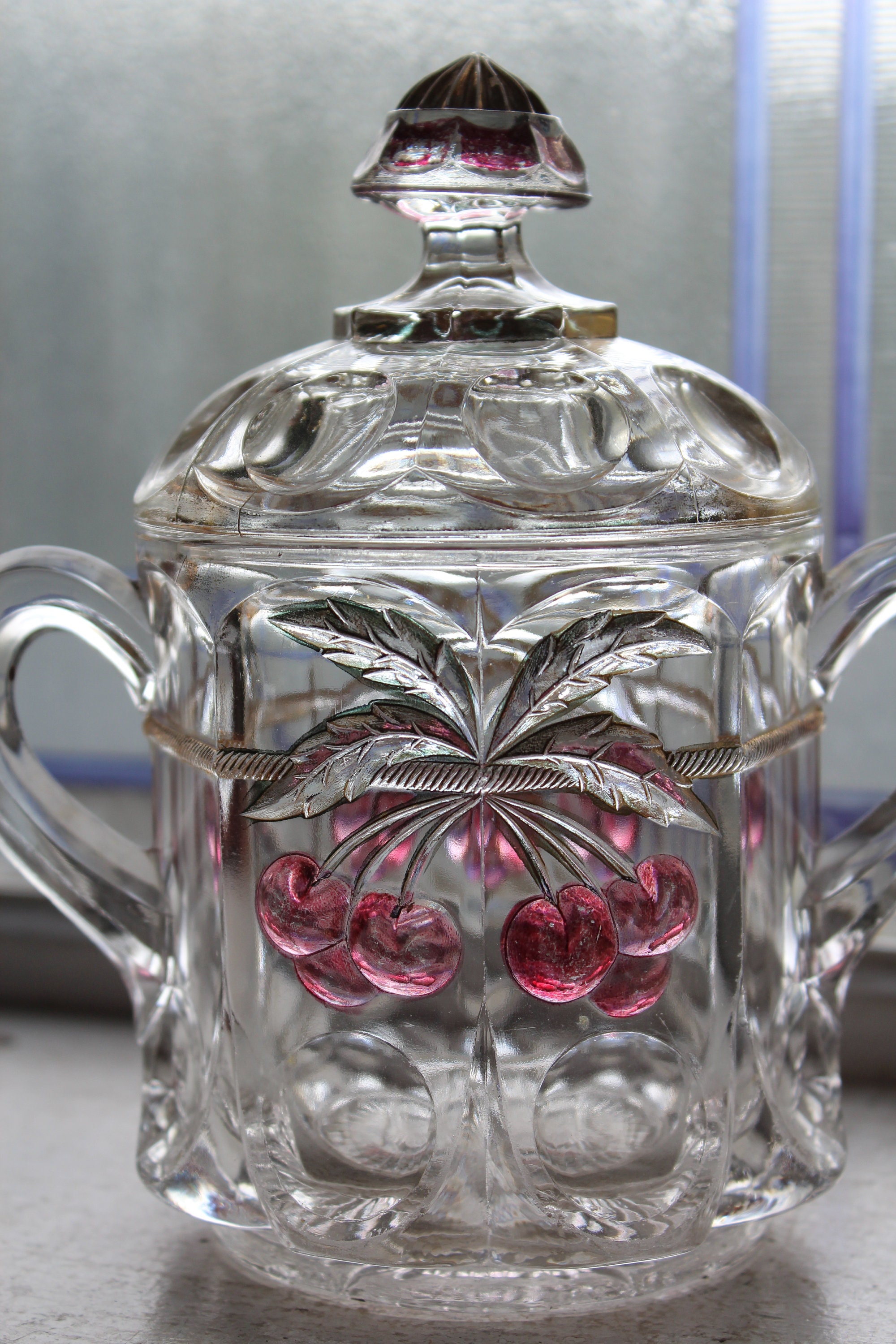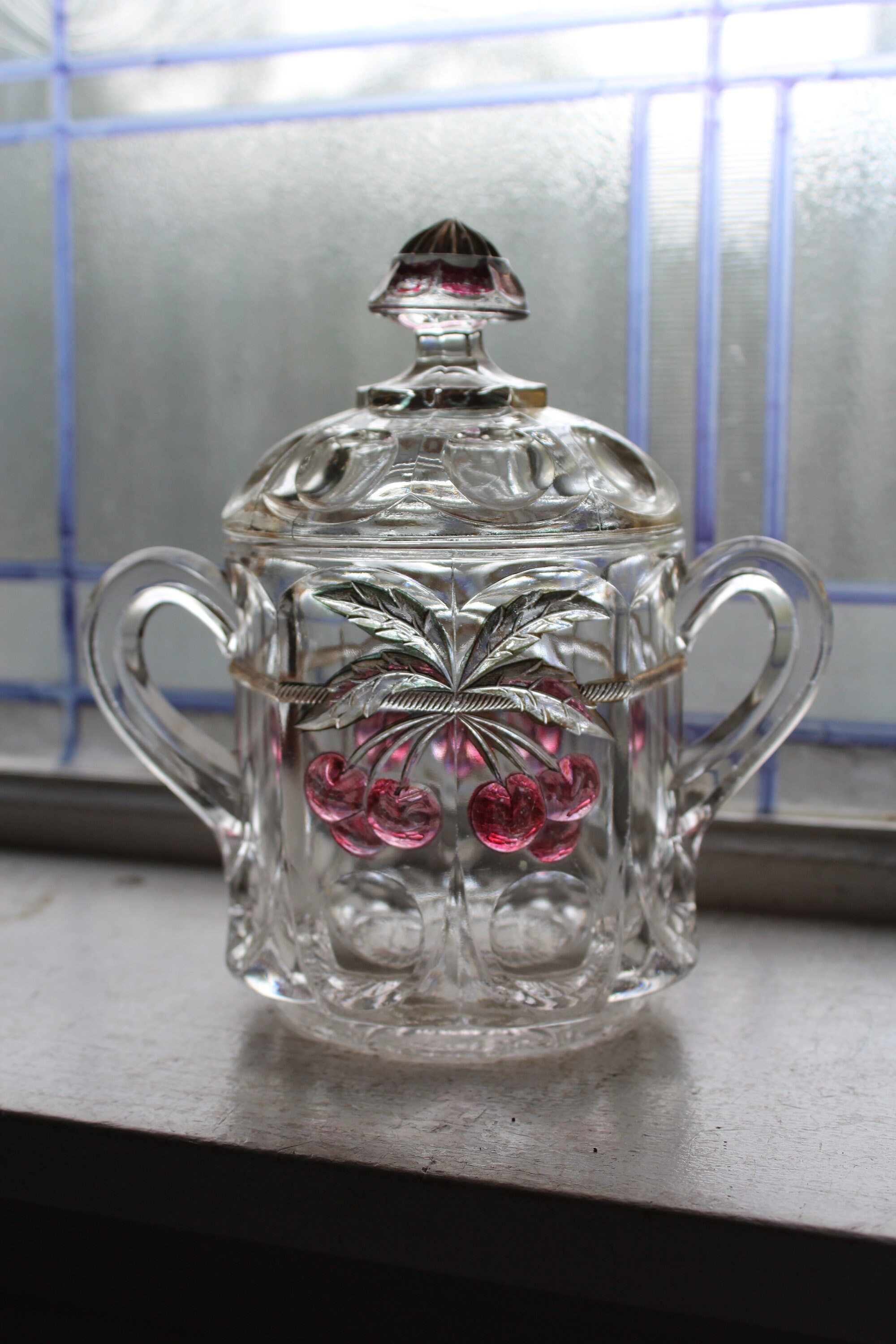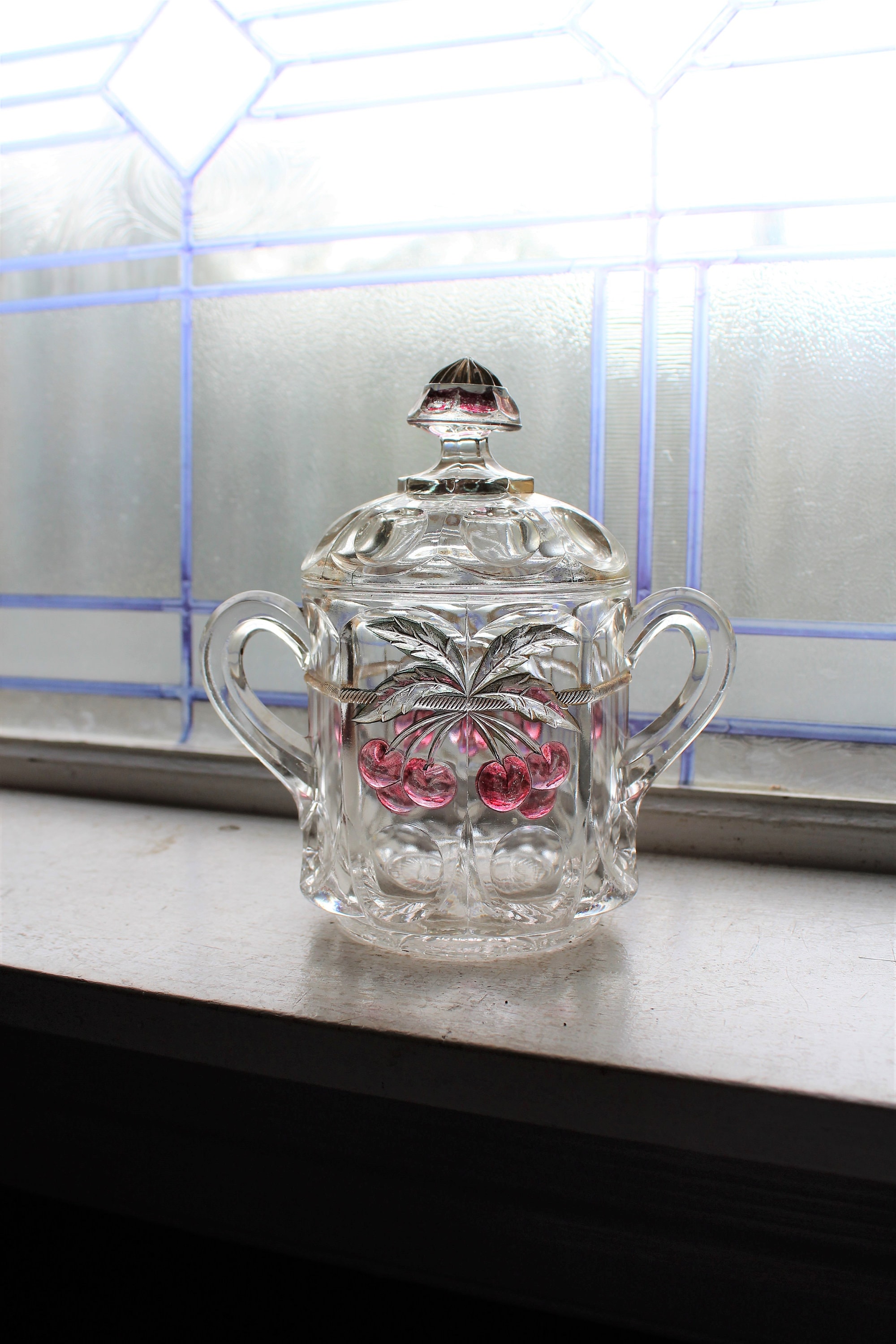 Antique early 1900s Northwood glass Cherry and Cable EAPG large covered sugar bowl or candy dish. Overall condition is very good with no chips or cracks. It measures 7 1/4" high to the top of the lid knob and displays very well. Enjoy!