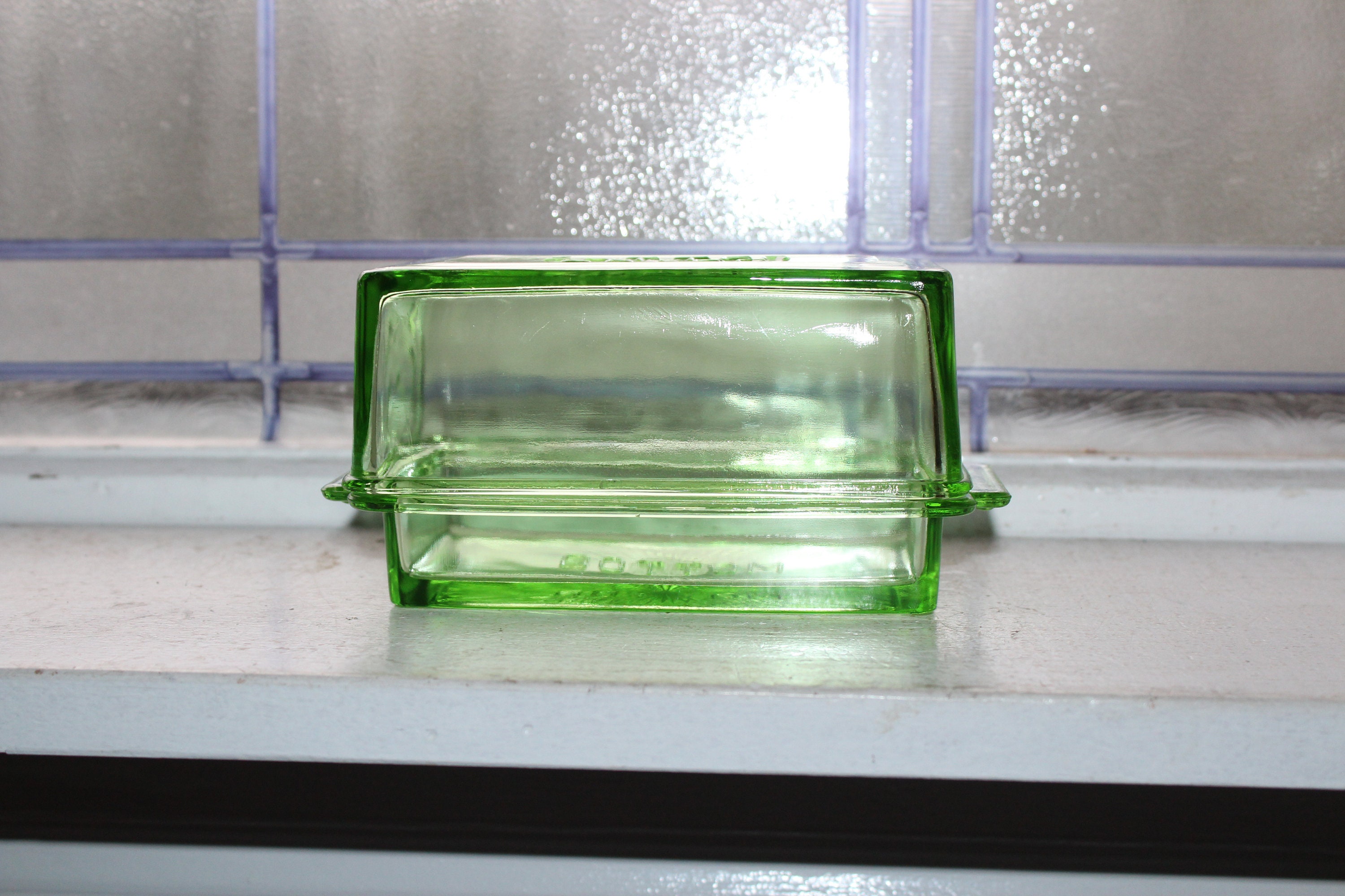 Vintage 1930s green depression glass 1 lb. size butter dish, in very good condition. The base measures 6 3/4" wide from handle to handle and the entire dish measures 3 1/4" high. No chips or cracks, perfect for use or display. Enjoy!