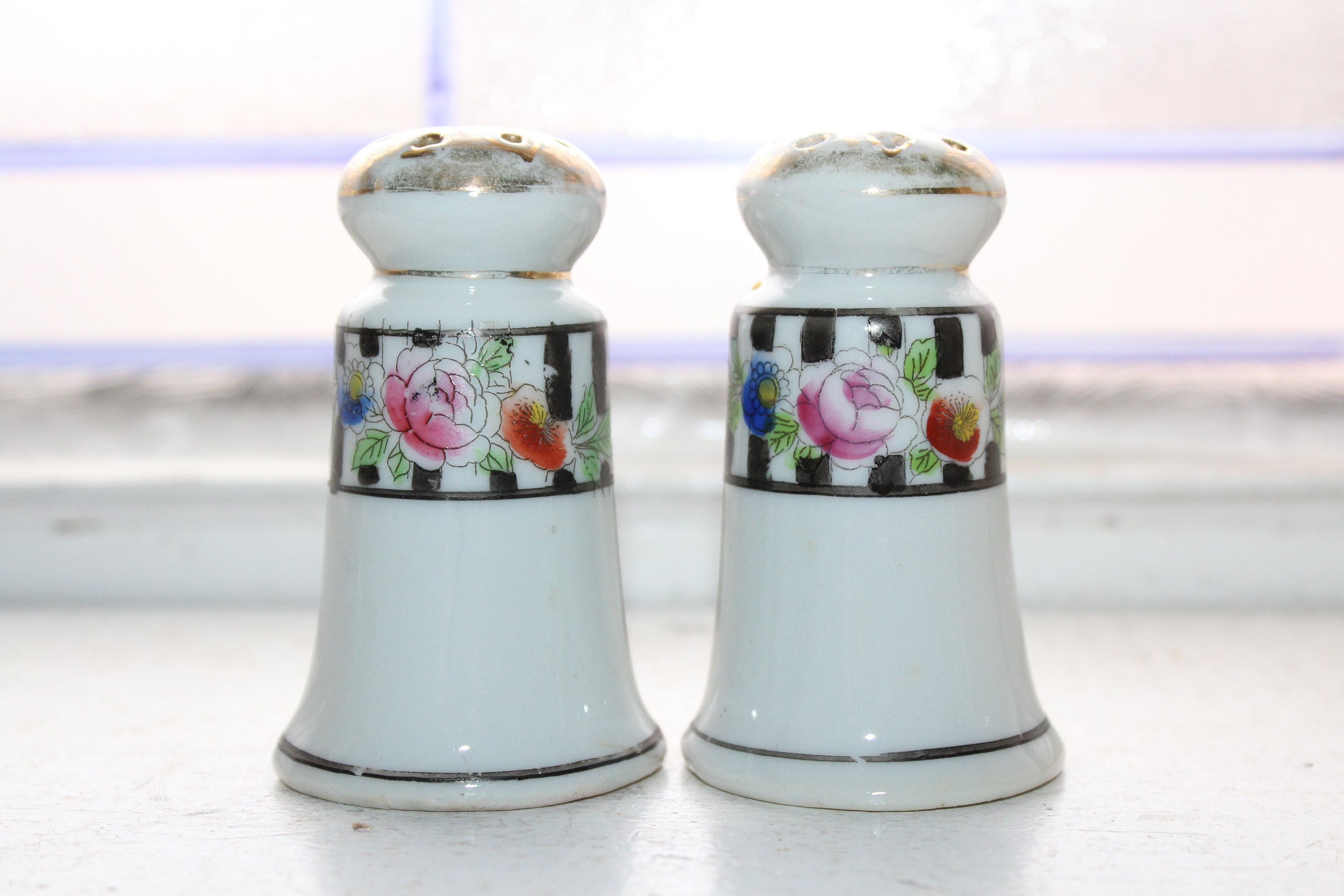 Pair of antique 100 year old hand painted Nippon salt and pepper shakers, in good condition. The shakers feature hand painted flowers with black and gold trim, and they measure 3 3/8" high. No chips or cracks, some wear to the gold trim. Enjoy!