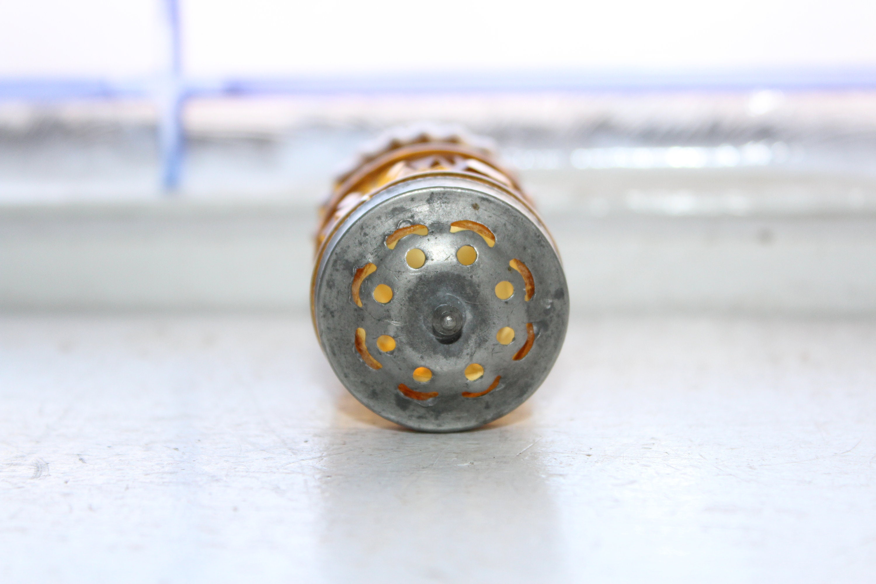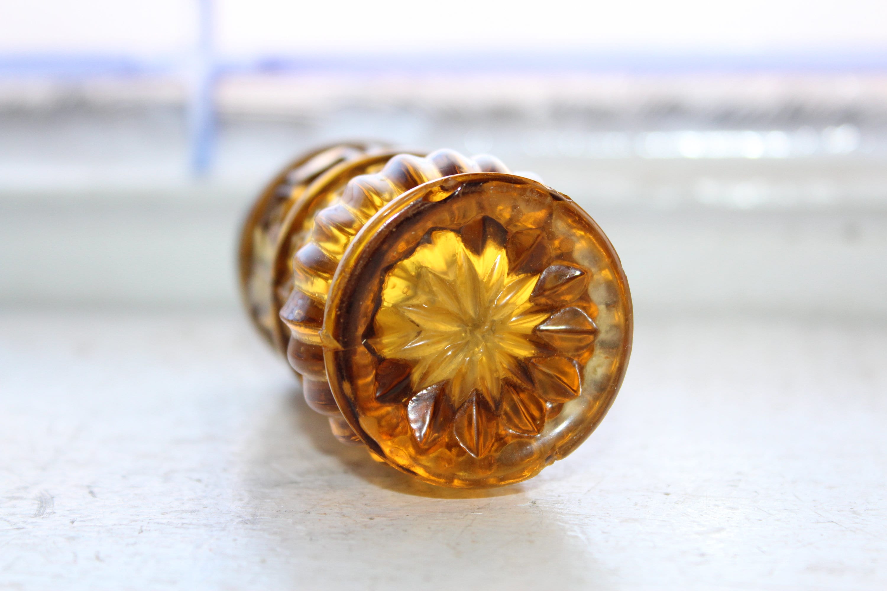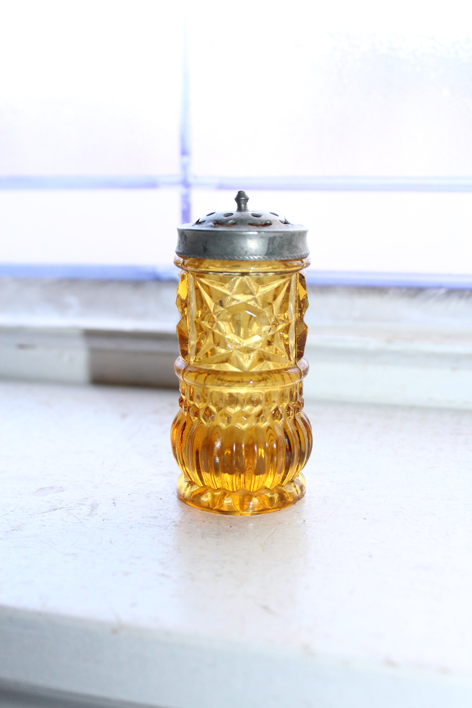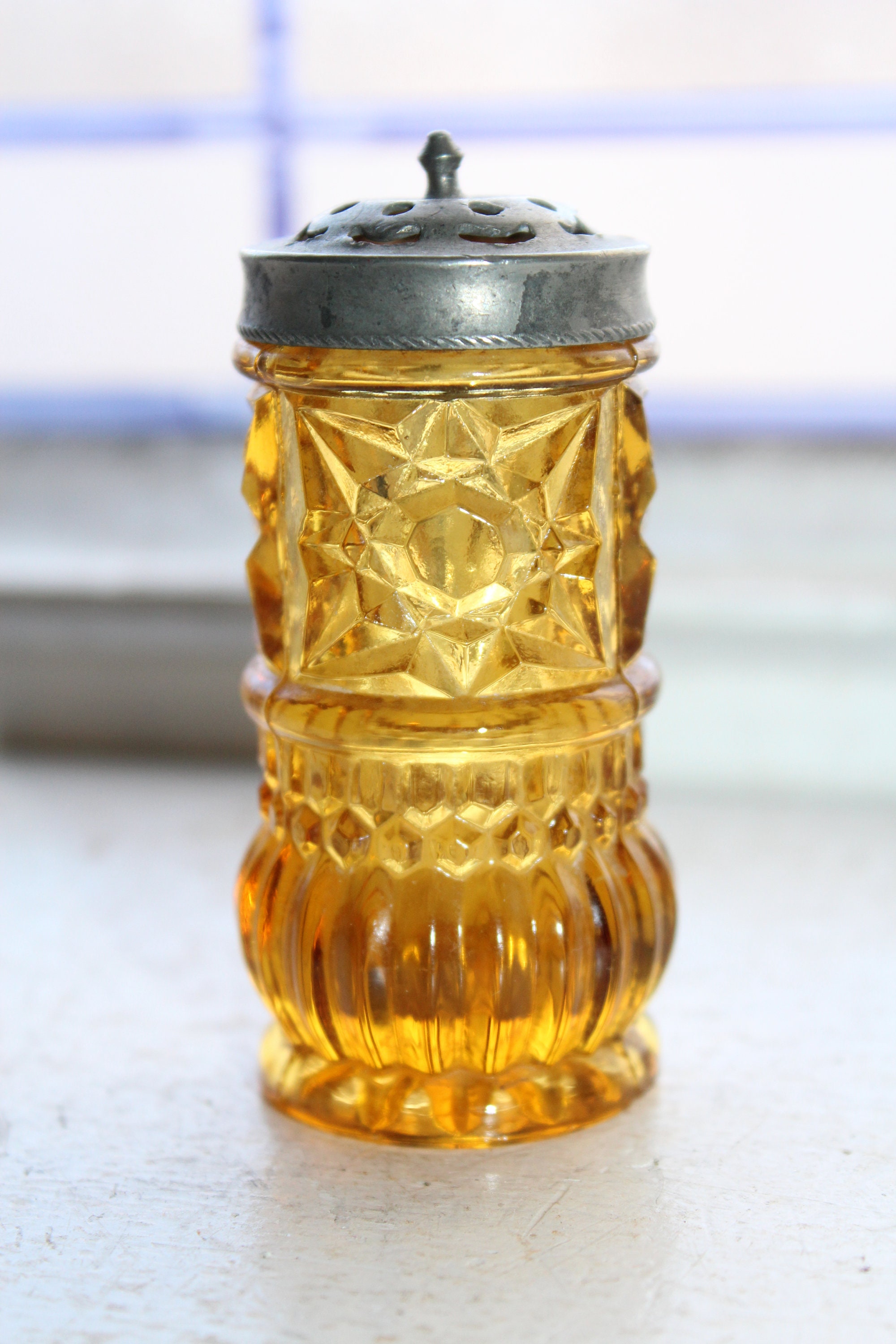 Antique Victorian EAPG amber glass salt shaker with ornate lid, in fairly good condition. The shaker measures 3" high. There are a couple of small chips on the underside rim, still displays very well. Enjoy!