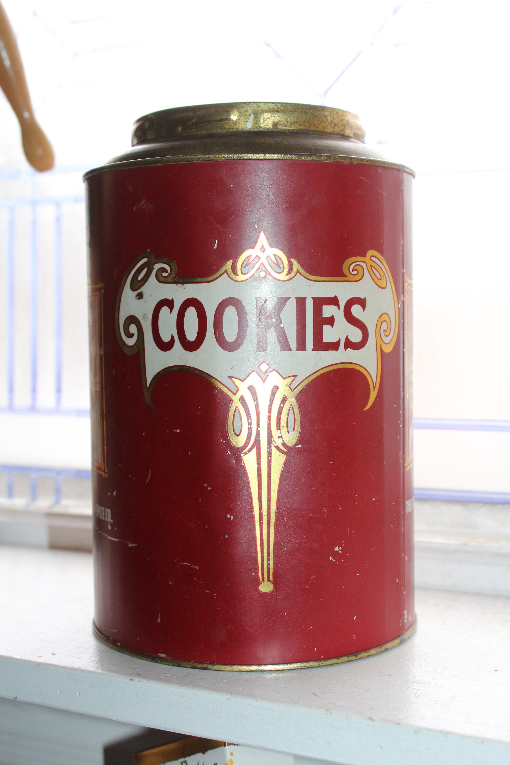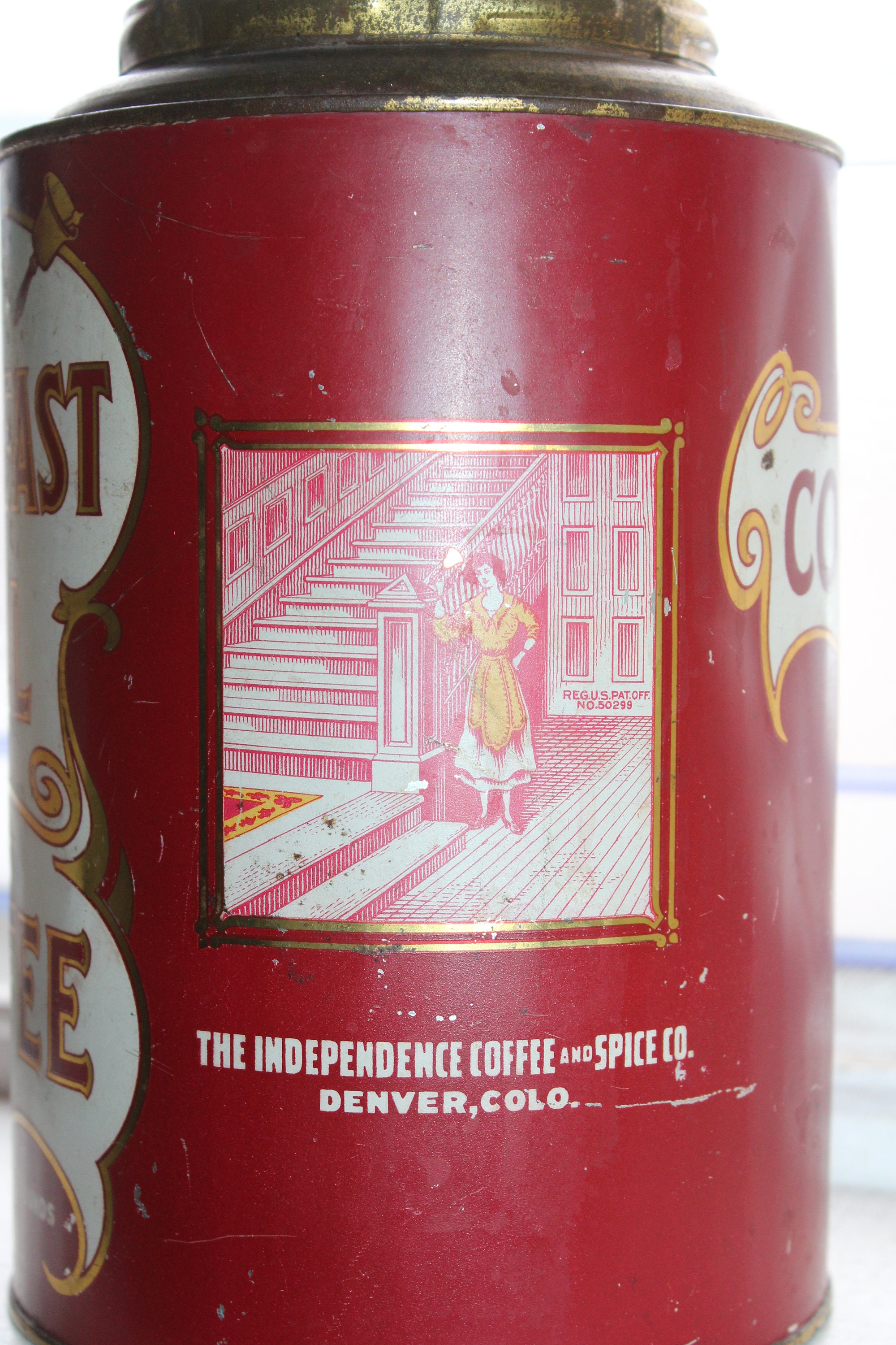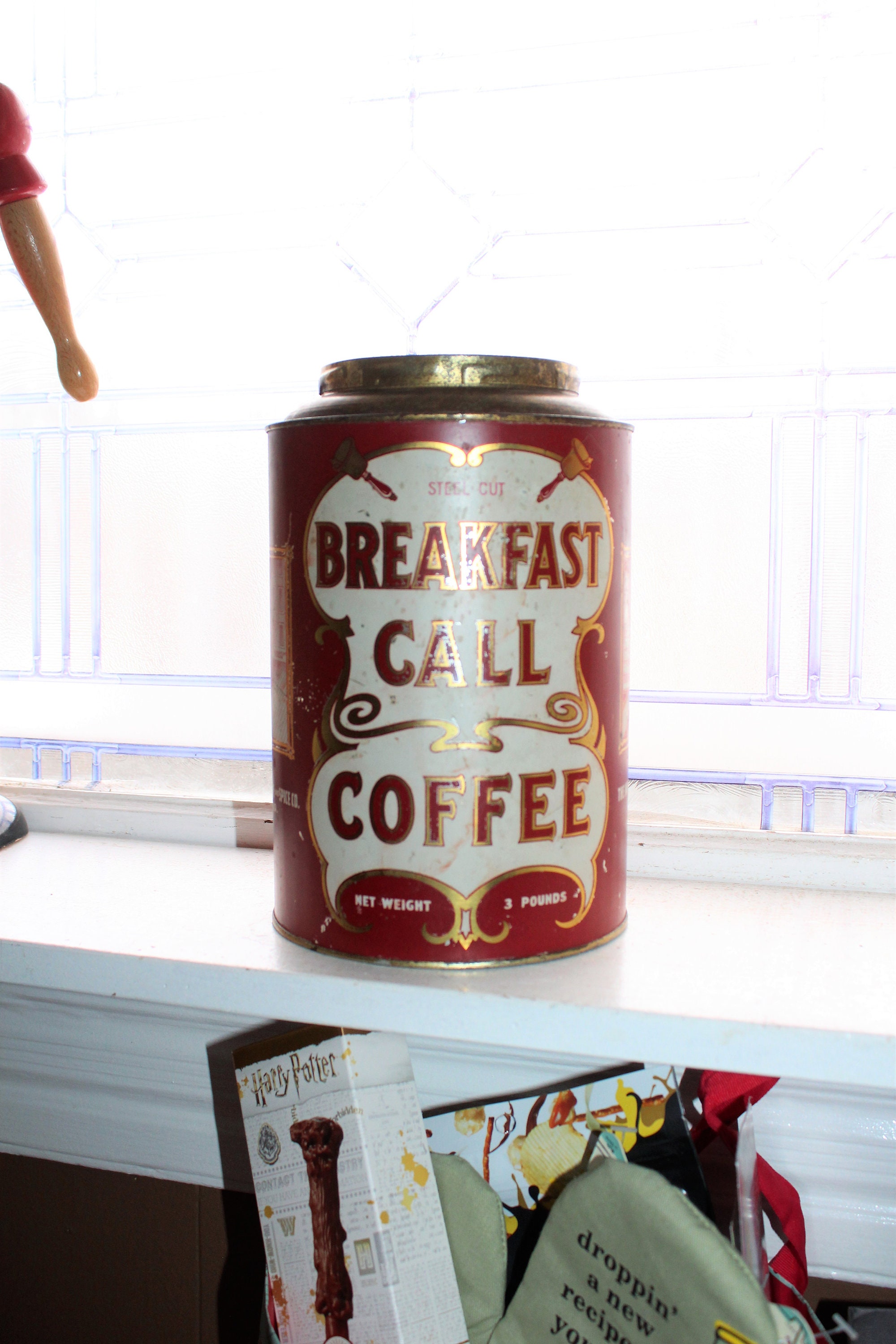 Antique 3 pound Breakfast Call Coffee tin, perfect for use or display in a country kitchen. Please excuse the camera flash! The tin measures 9" high x 6" wide. Age appropriate wear, displays very well. These were made to be reused and are marked on the back with other kitchen staples. This one has the hard to find COOKIES mark. Made by the Independence Coffee and Spice Co., Denver, CO. Enjoy!