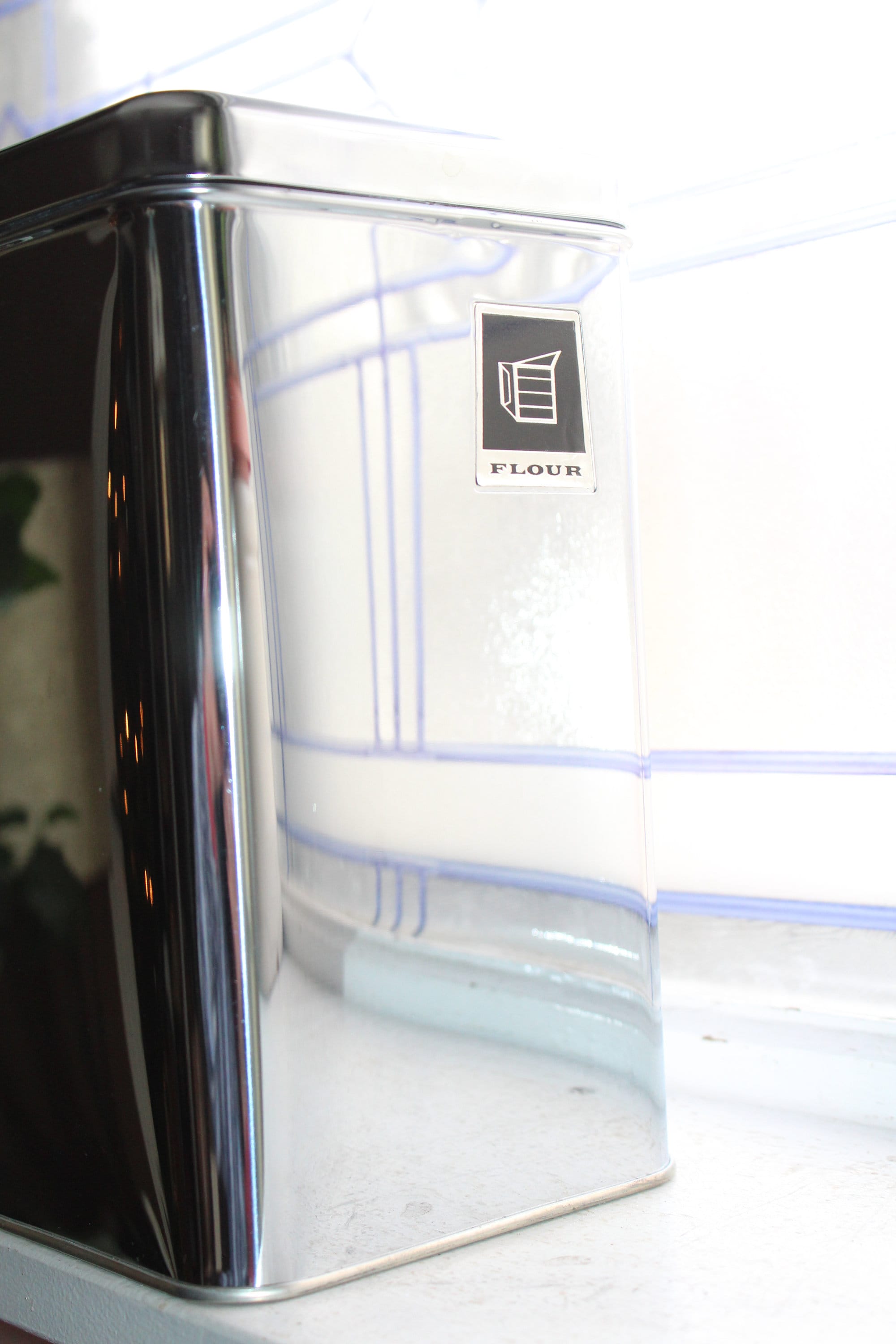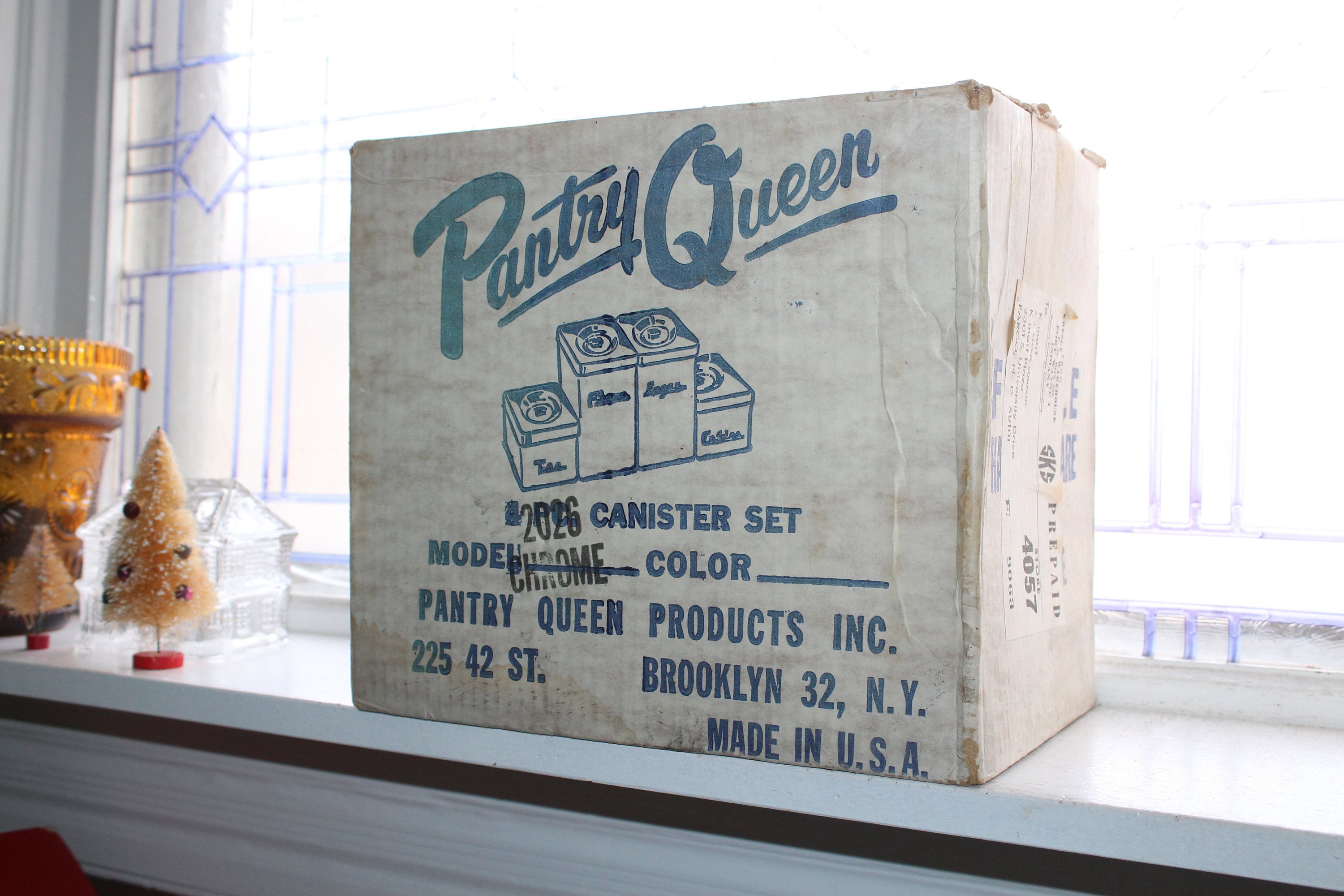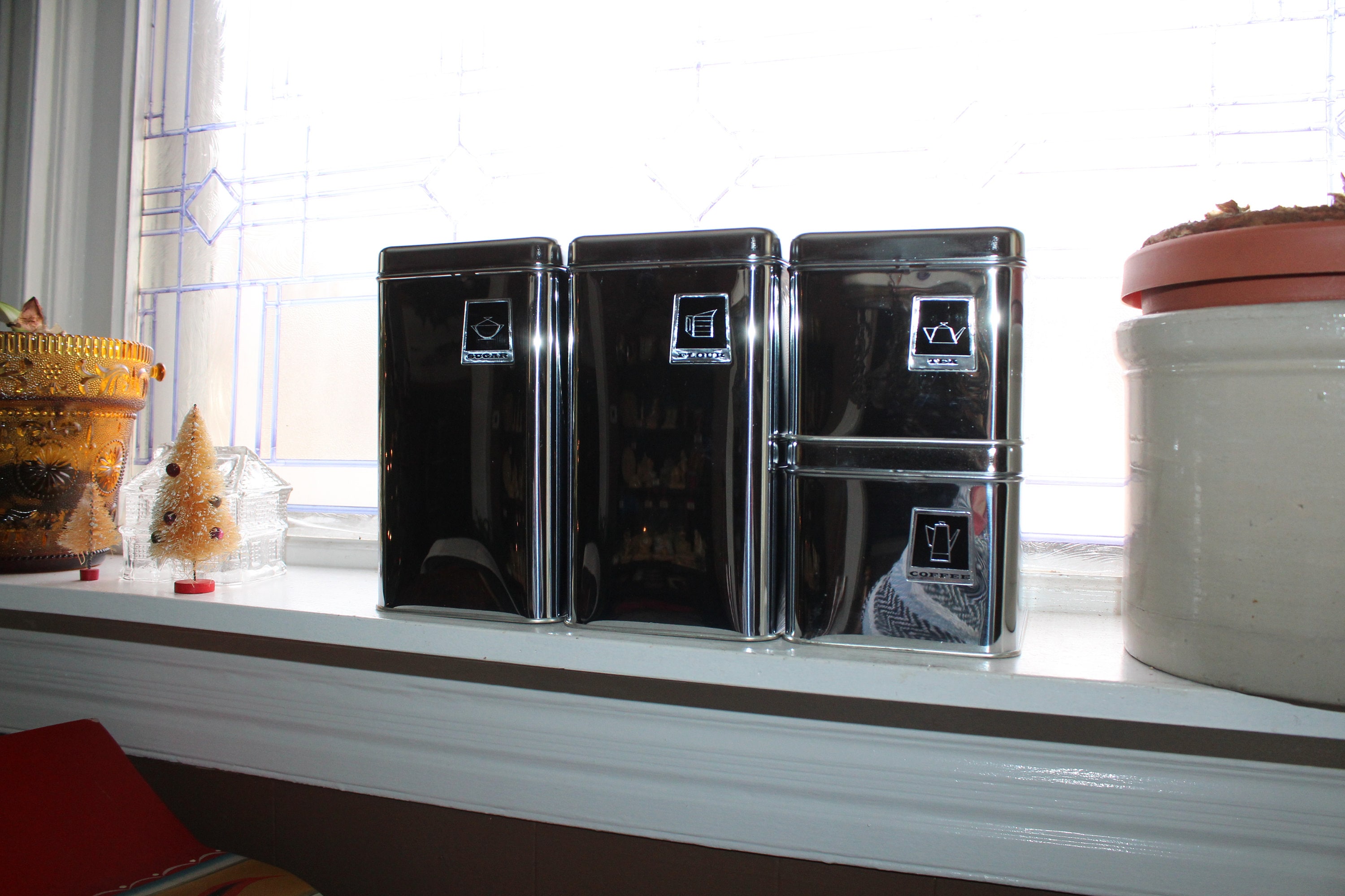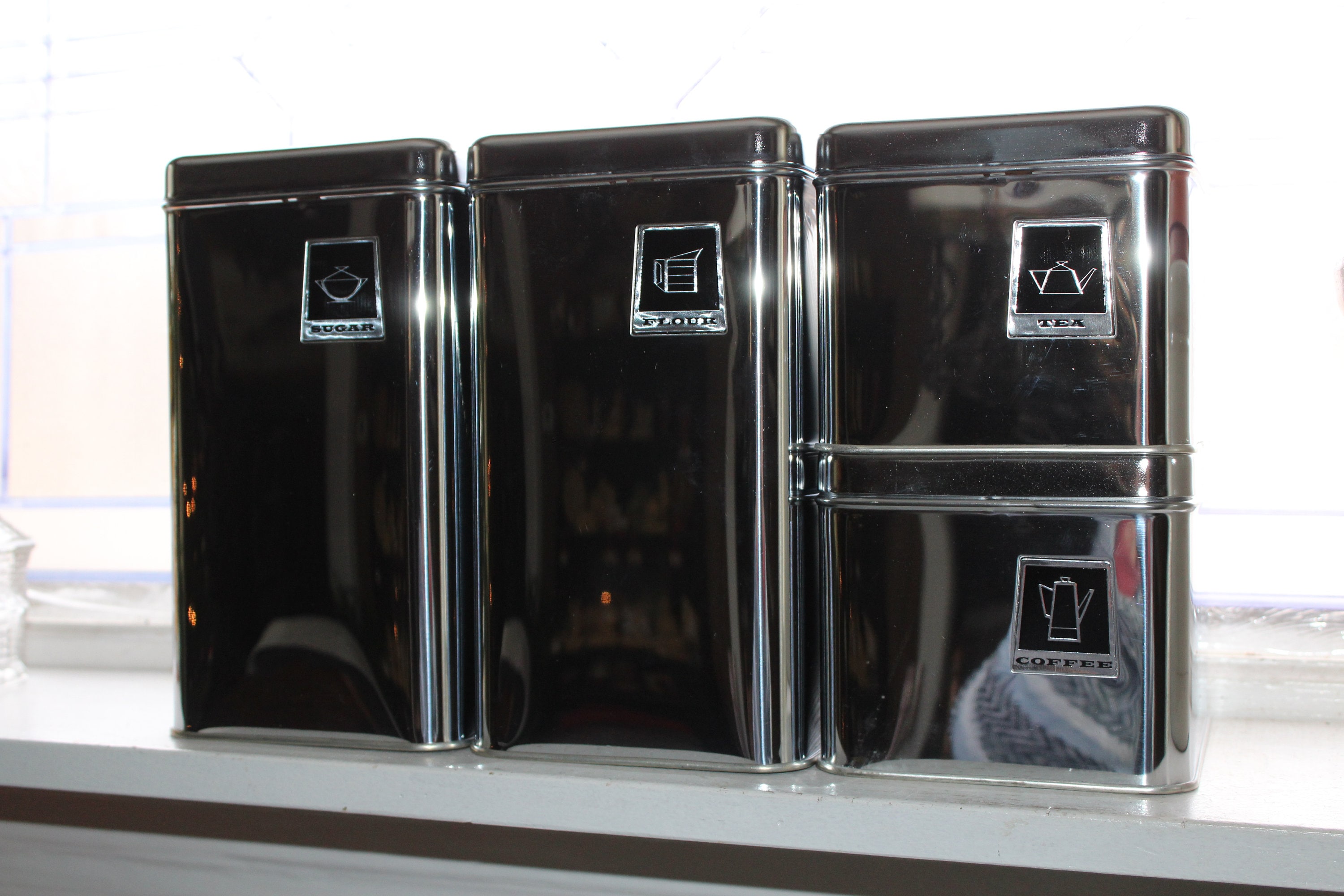 New in the box, circa 1950s and never been used! Vintage set of Mid Century Pantry Queen chrome kitchen canisters with lids, in excellent condition. Included are 4 canisters with lids and the original box. Each canister is stackable or sets by itself. Enjoy!