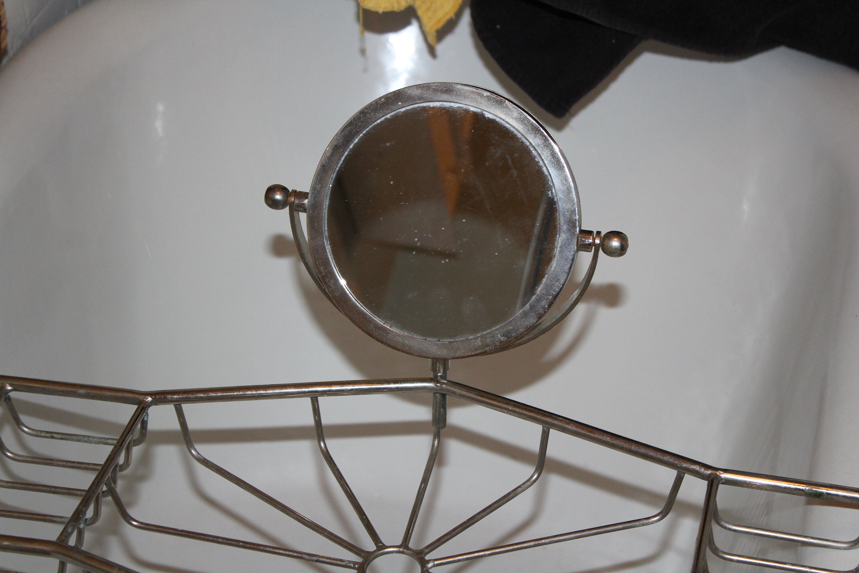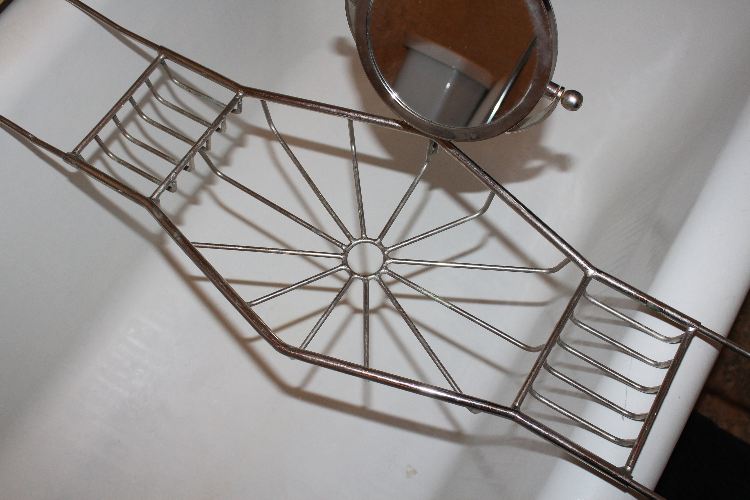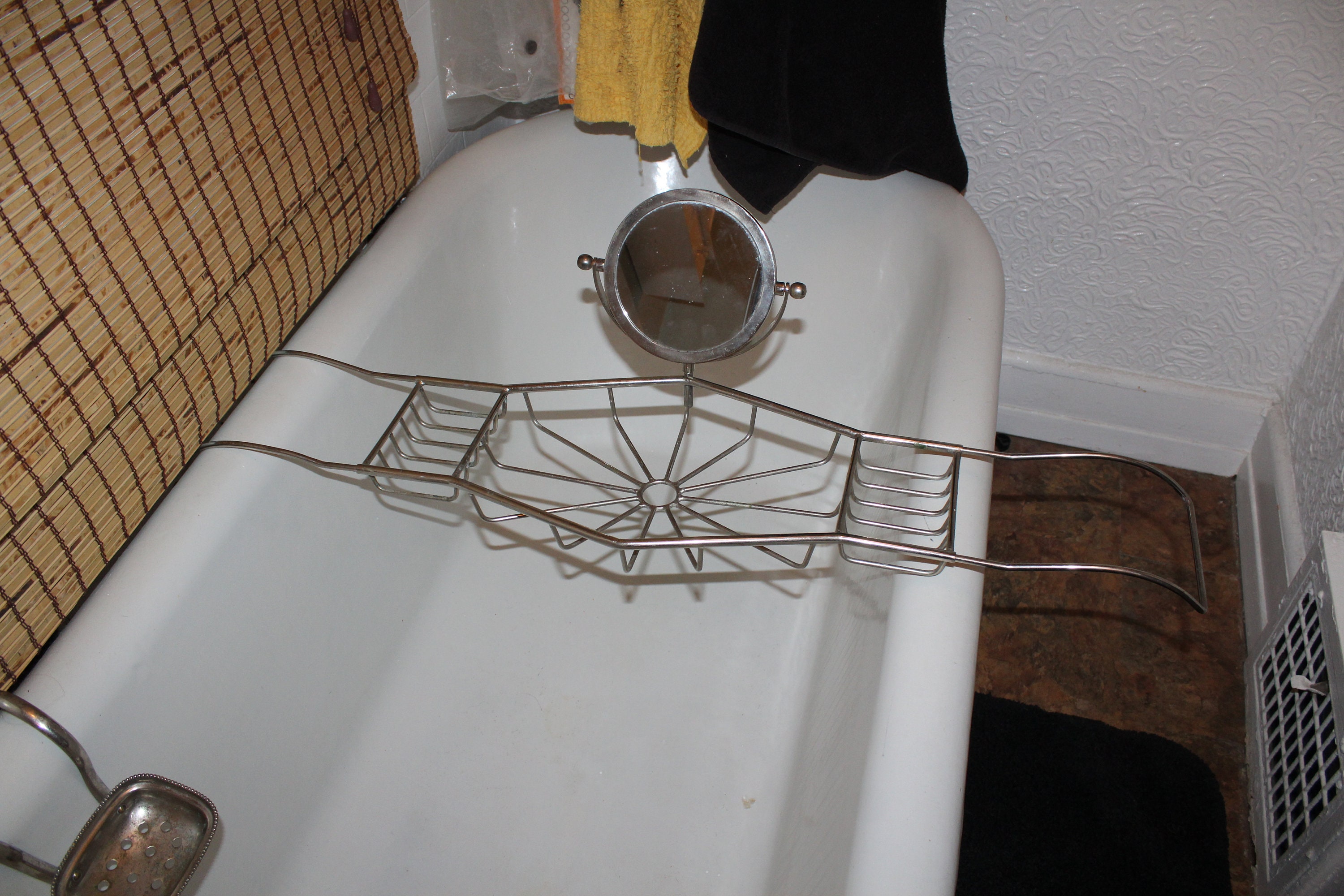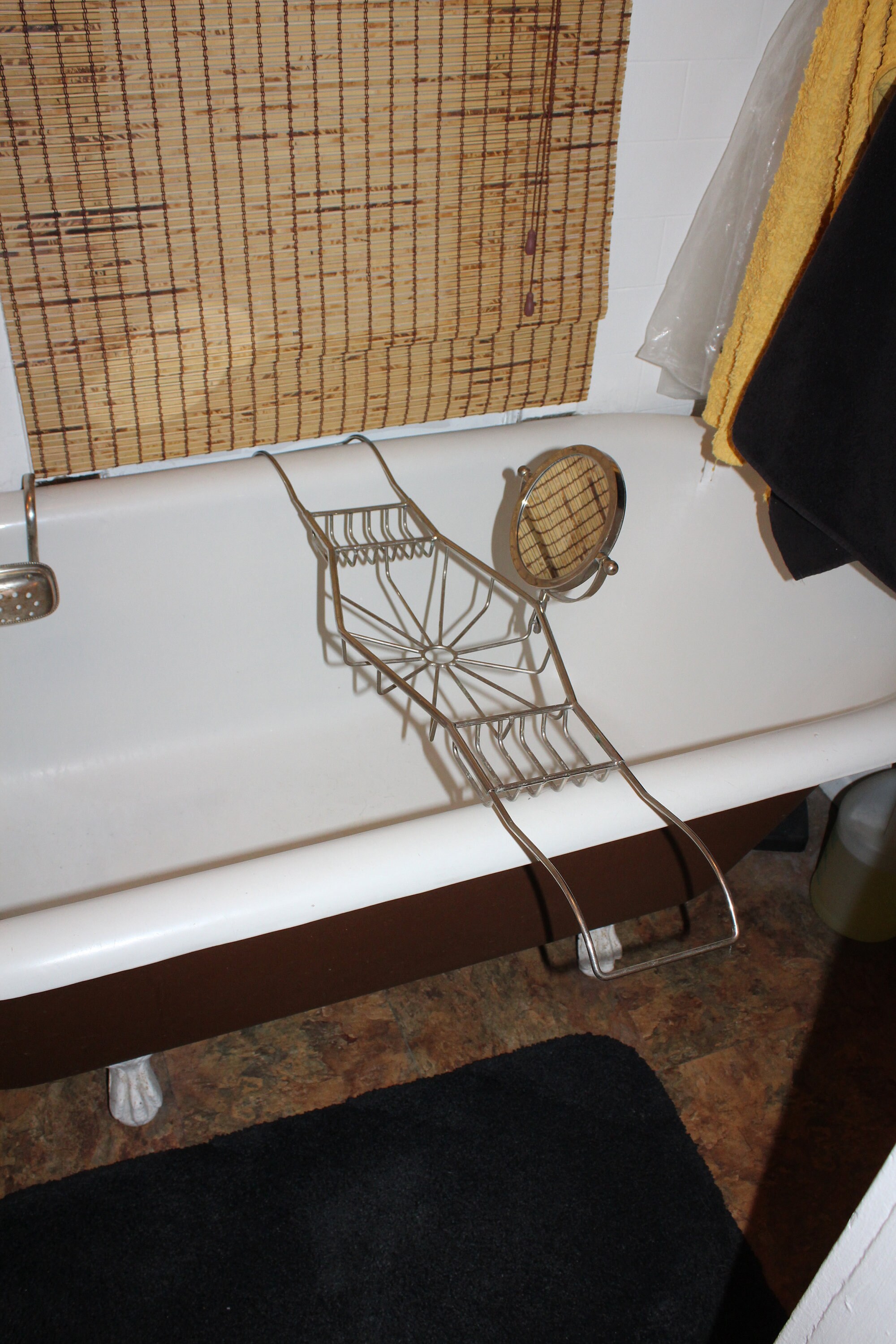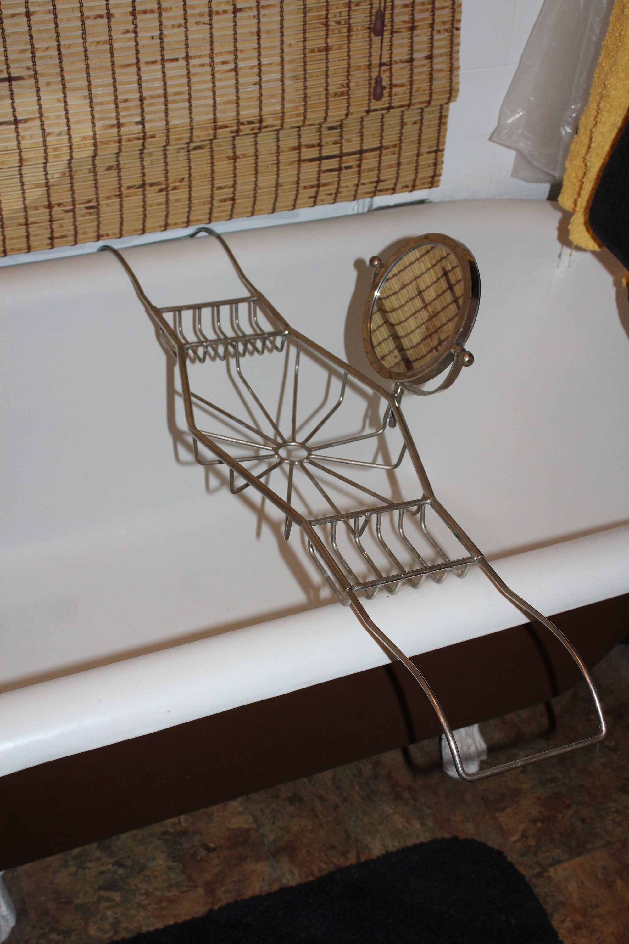 Vintage metal clawfoot bathtub caddy/vanity shelf with mirror, in very good condition and perfect for use or display in a vintage bath. It is adjustable and fits a free standing (not against a wall) tub from 30" wide and larger. It's smallest length is 38" wide. It would fit a tub standing against a wall but will stick out a bit on one side. I display it at an angle on my spare bath tub. Enjoy!