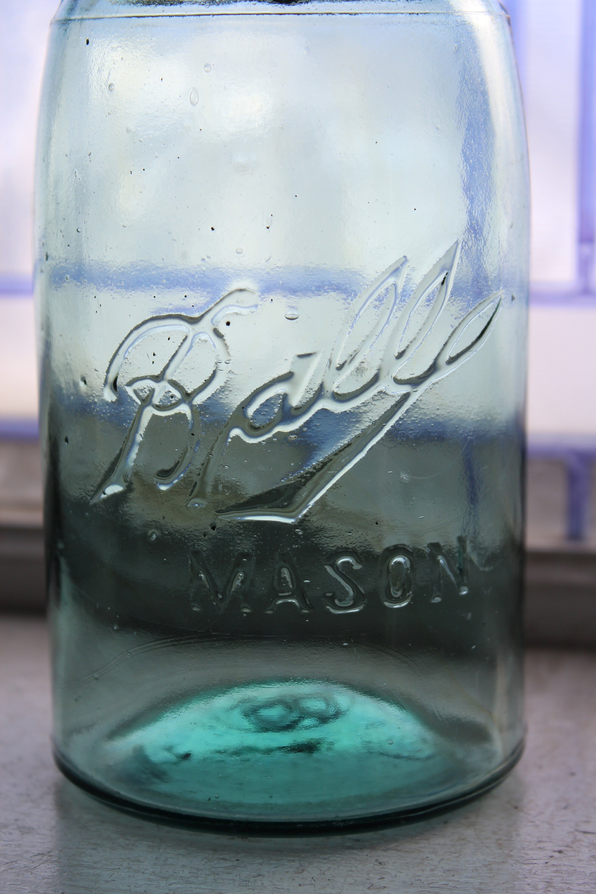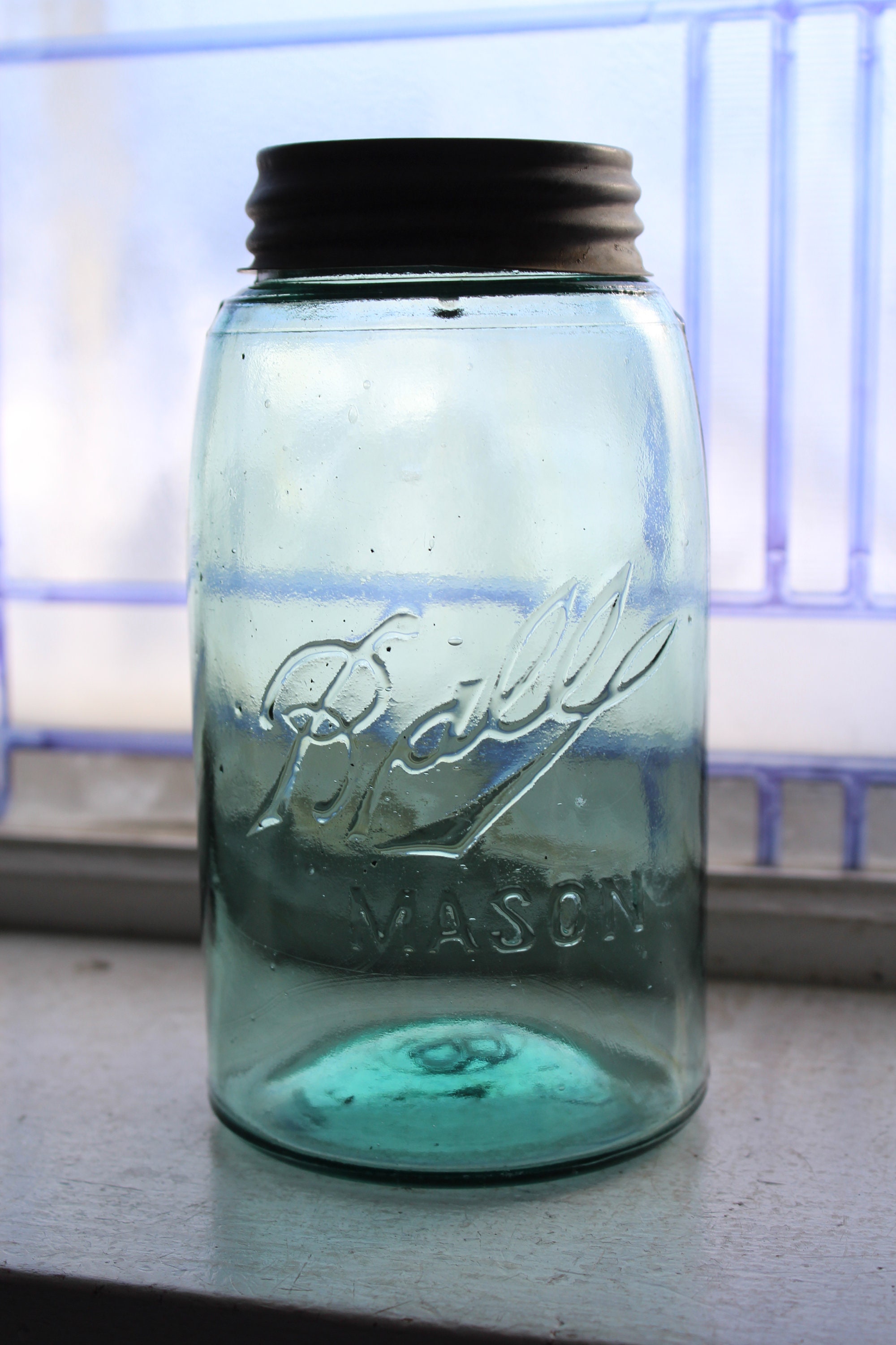 Antique 1896 to 1910 blue Ball Mason jar, quart size, with a bit of amber swirl on the base and rim, the hard to find three L logo and a zinc lid, in very good condition. The jar measures 7" high, is marked with a B on the bottom, and has no chips or cracks. Perfect for use or display in a country kitchen. Enjoy!