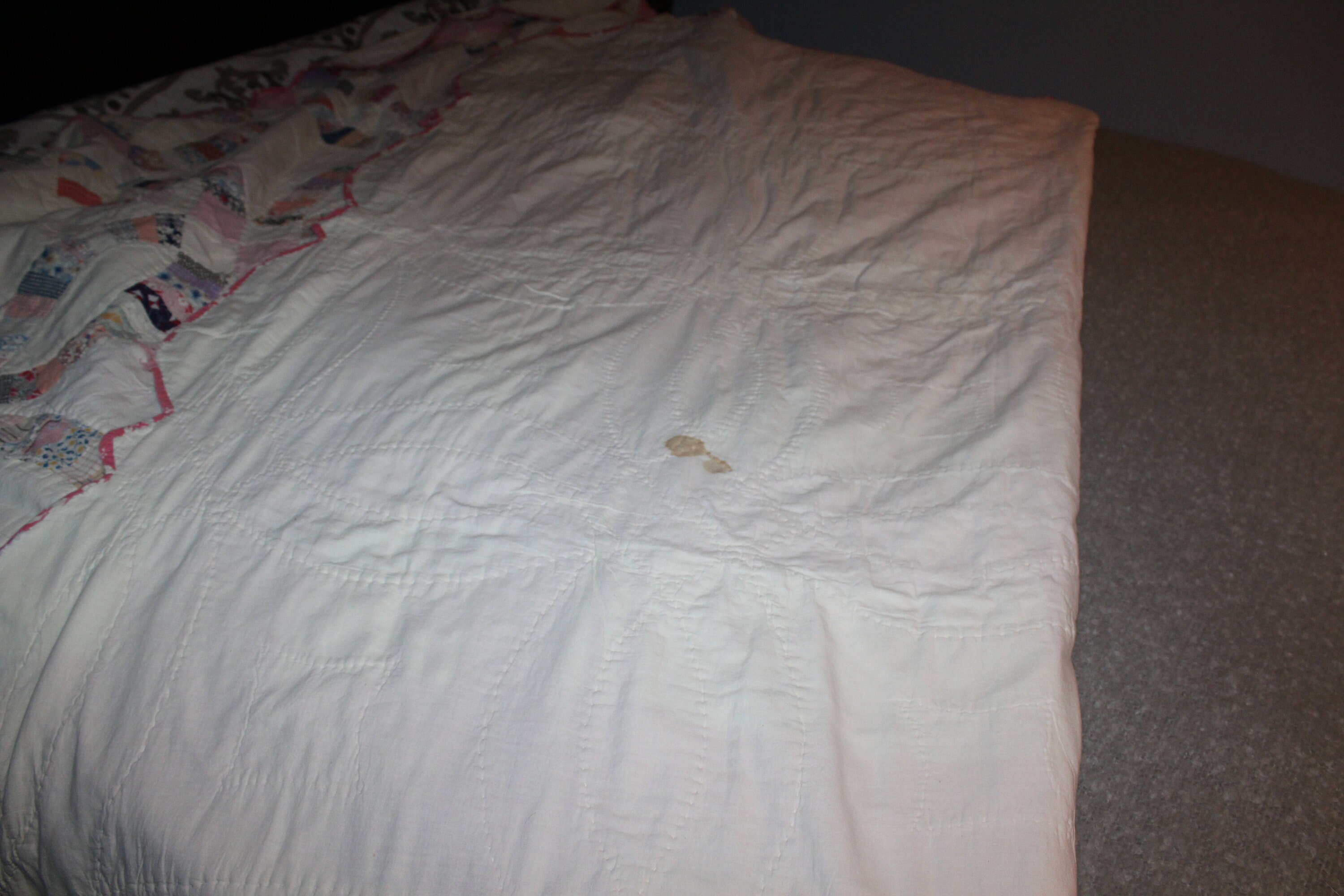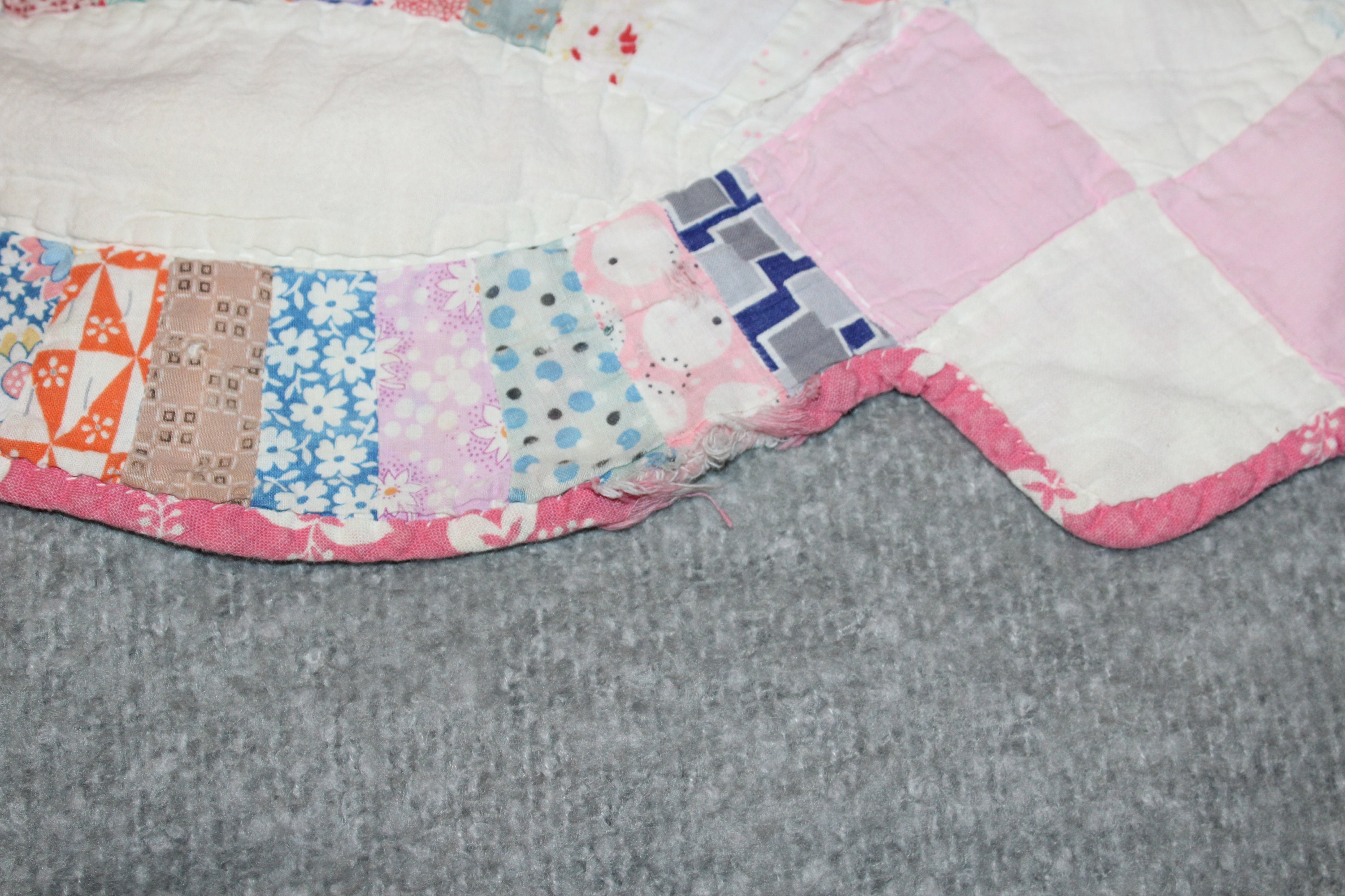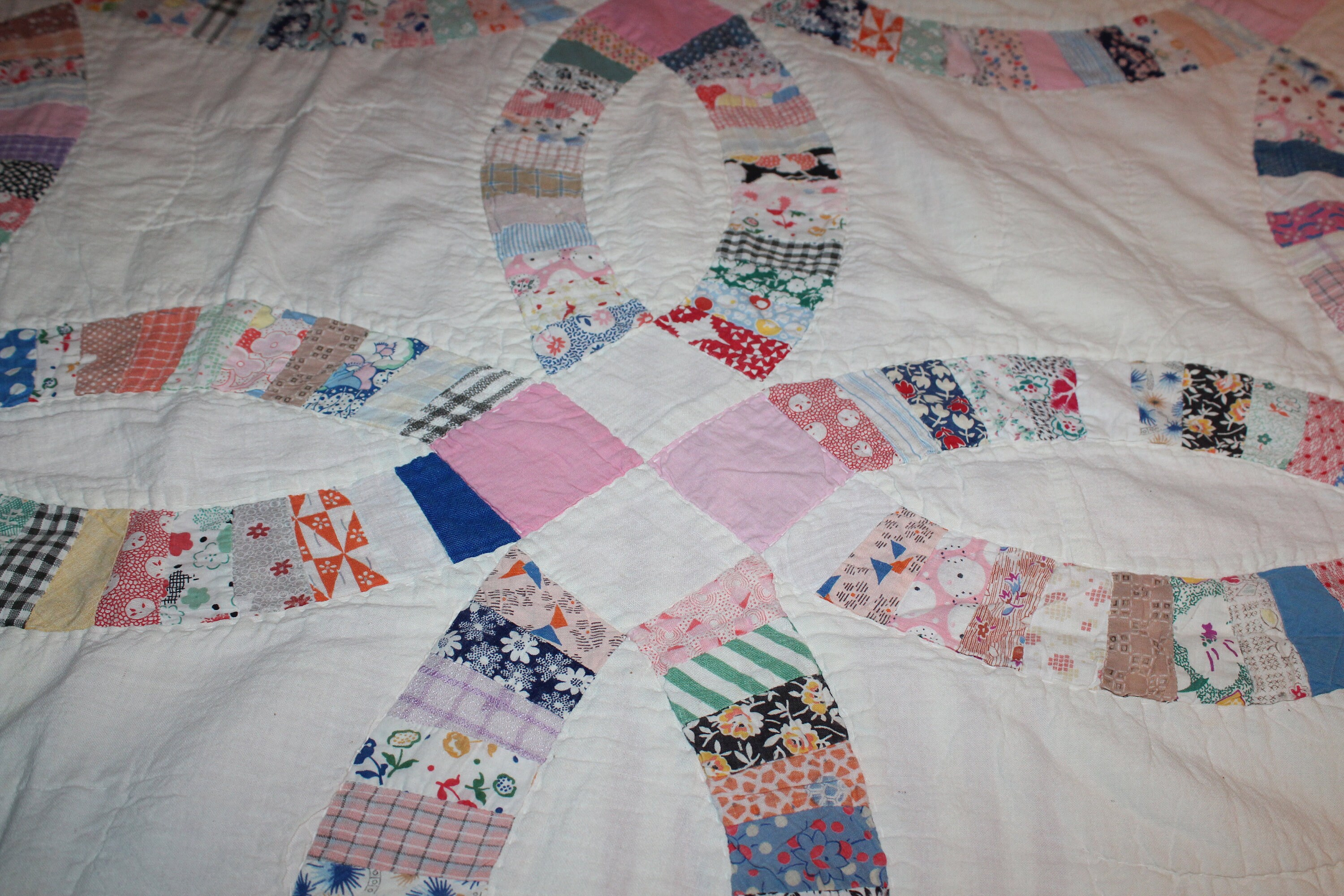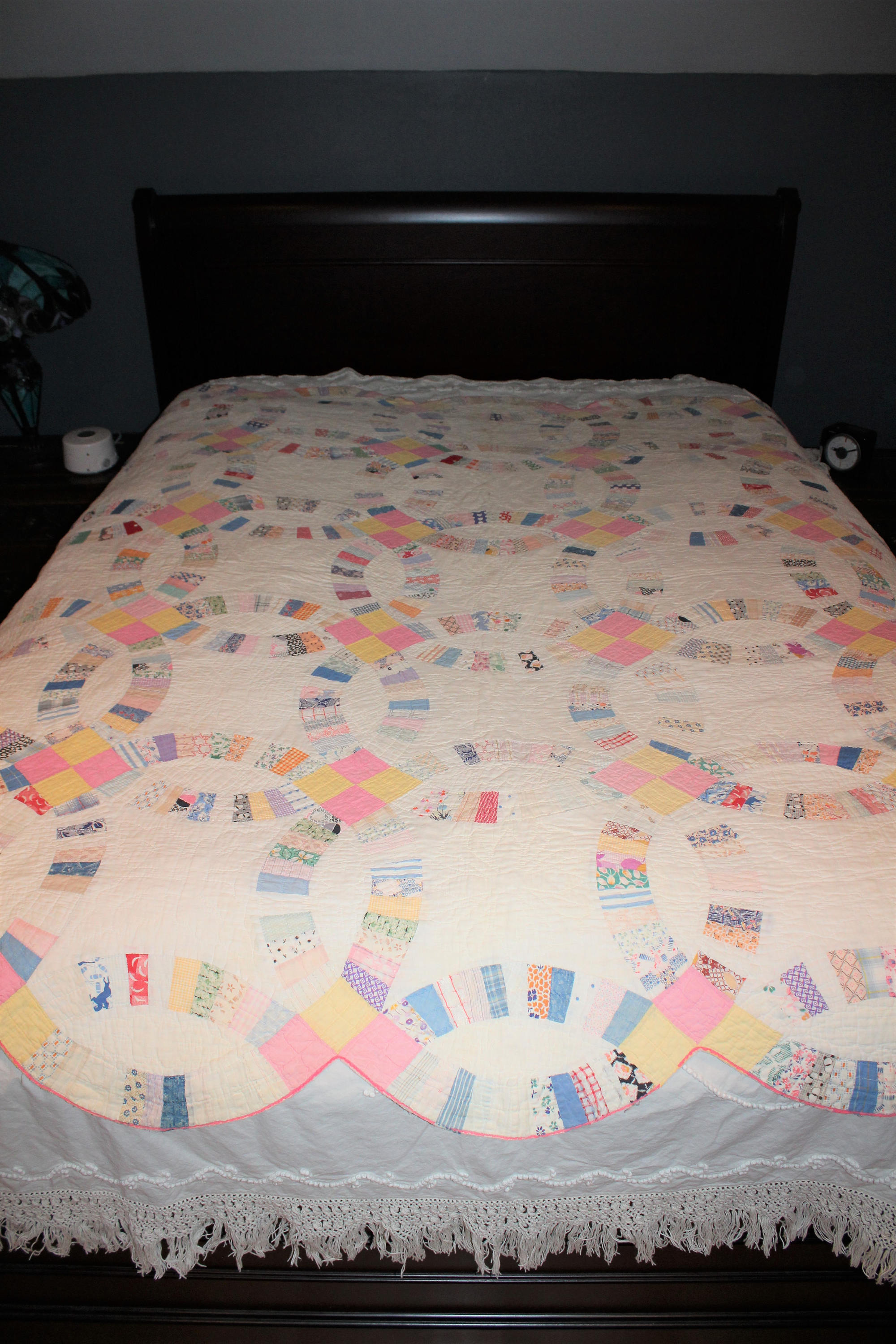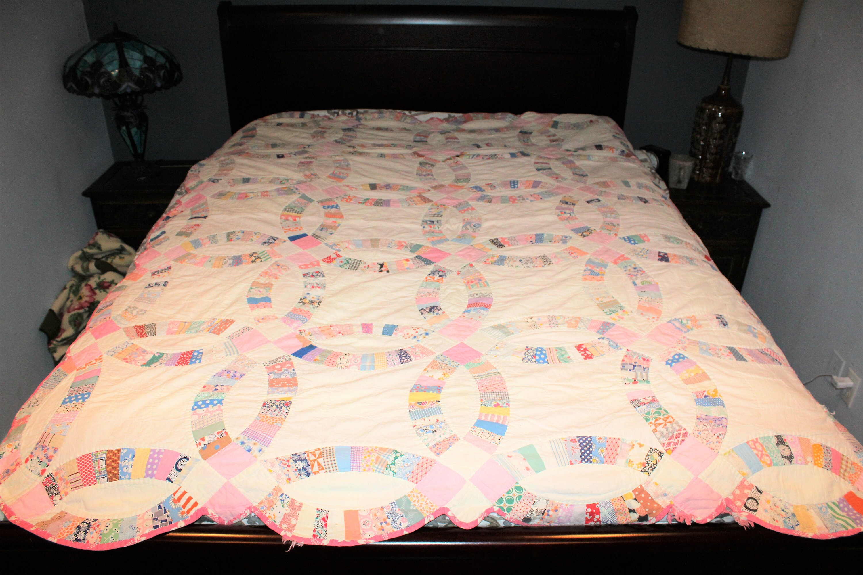 Vintage 1930s Double Wedding Ring pattern quilt, hand stitched and sewn, in fairly good condition. The quilt measures 80" x 65" and weighs 3 3/4 lbs. There is some age appropriate edge wear and one small stain as shown in the photos, but it still displays well and could easily be repaired. It is shown in the photos on a queen size bed. Perfect for use or display in a country home. Enjoy!