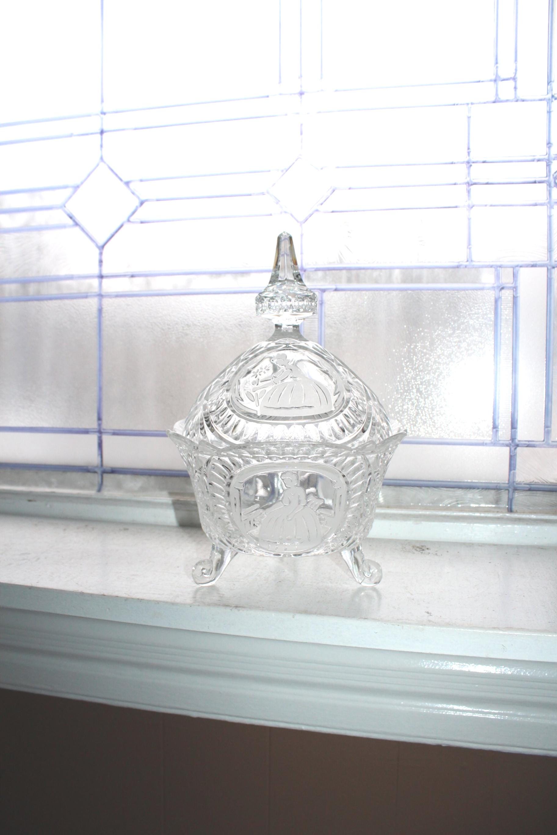 Pressed glass footed compote with lid and featuring frosted Southern Belle medallions on the sides, in very good condition. The compote measures 9 3/4" high to the top of the lid handle and weighs 4 1/4 lbs. There are no chips or cracks, perfect for use or display. Enjoy!