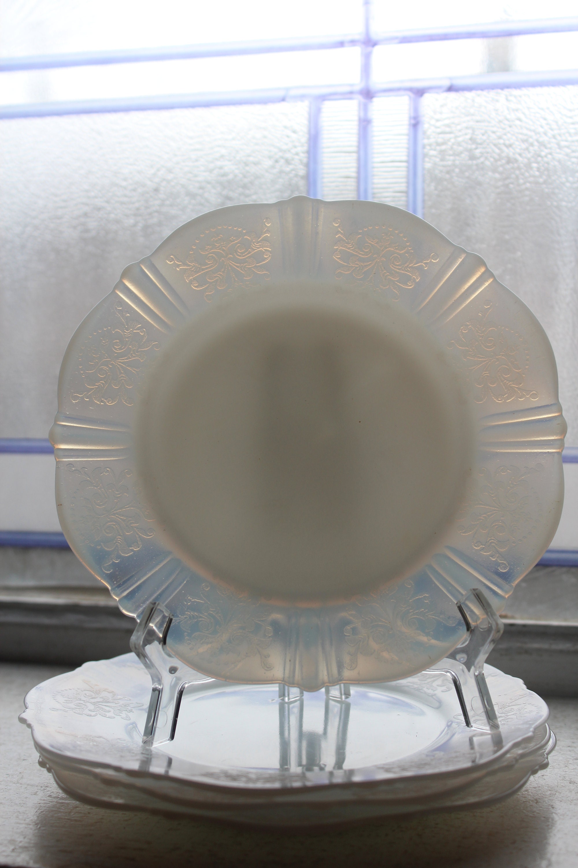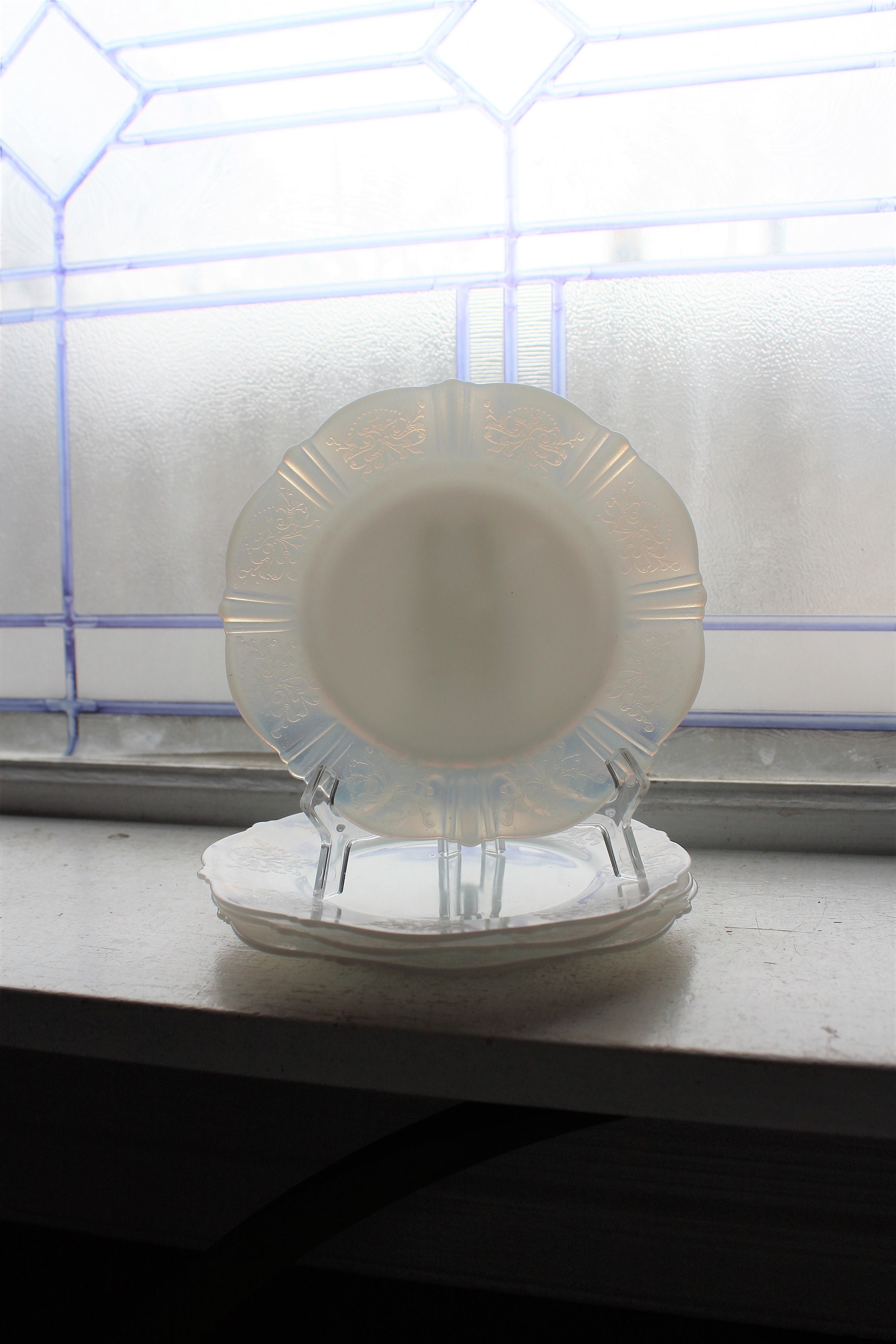 4 vintage 1930s monax white depression glass American Sweetheart bread and butter plates, in good condition. Each one measures 6" wide. No chips or cracks, perfect for use or display. There are 2 sets of 4 available. Enjoy!