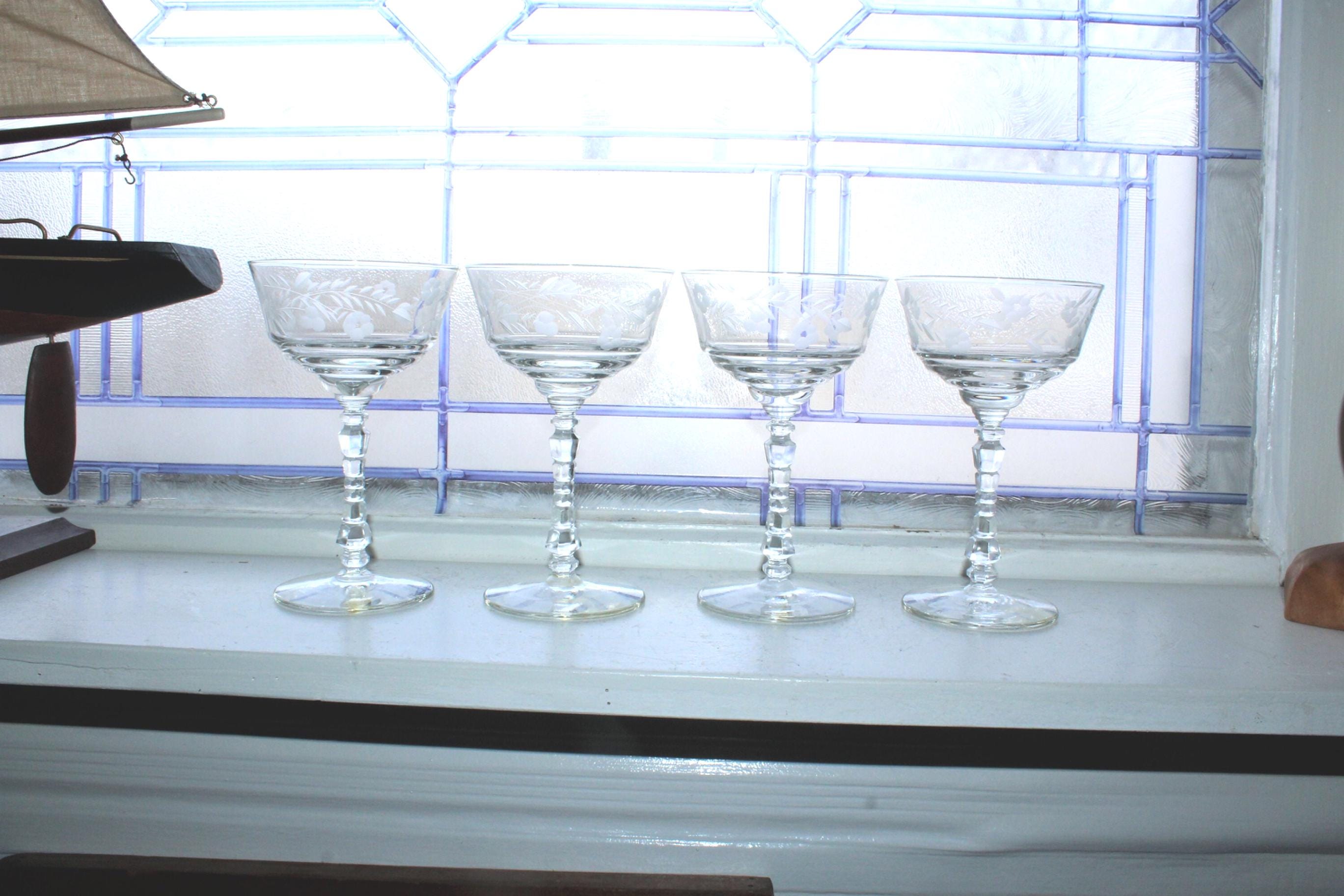 This is a gorgeous set of 4 vintage Rock Sharpe 3005 crystal champagne or wine glasses, in excellent condition. Each measures 6 1/8" high x 3 34" wide at the rim. No chips or cracks, excellent condition. This is a beautiful set and perfect for use or display. I also have a matching set of 4 more available in my shop. Enjoy!