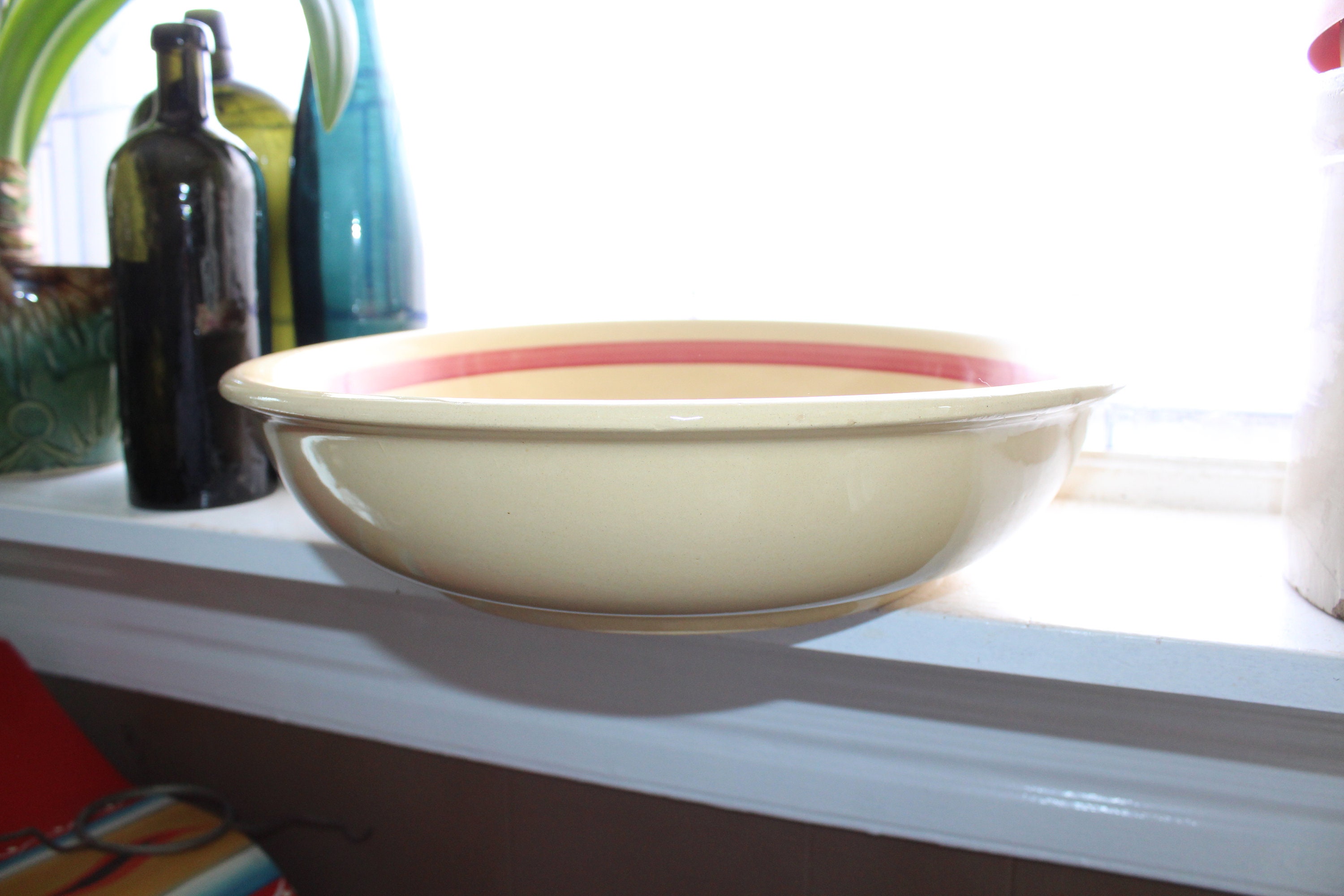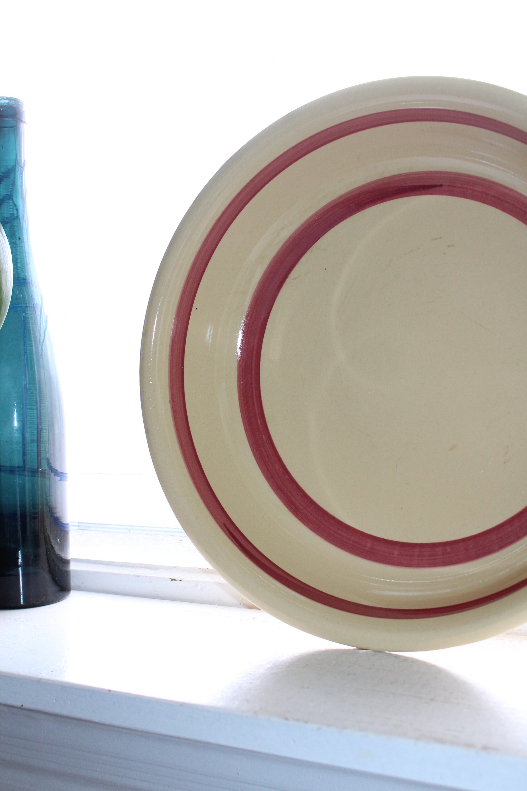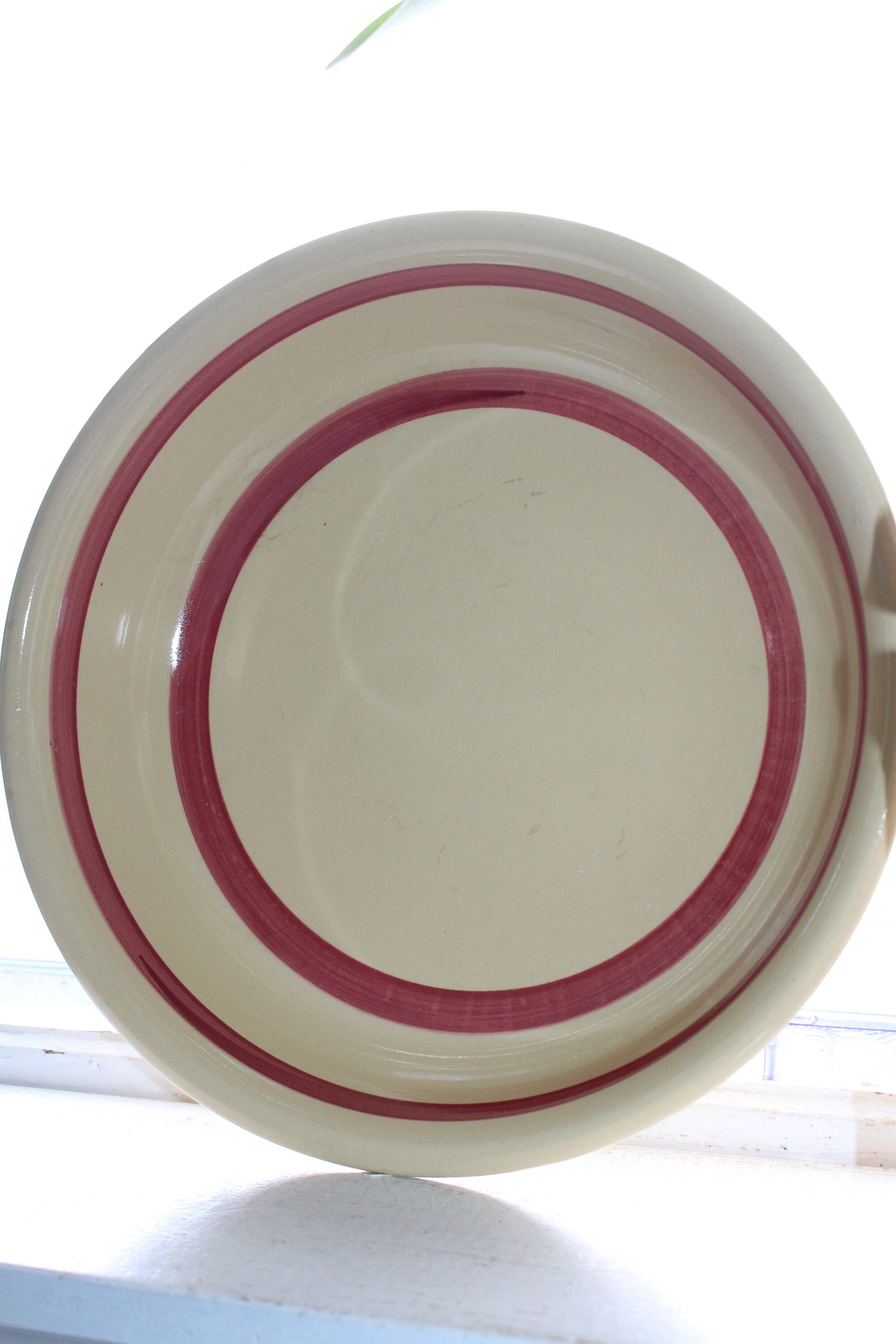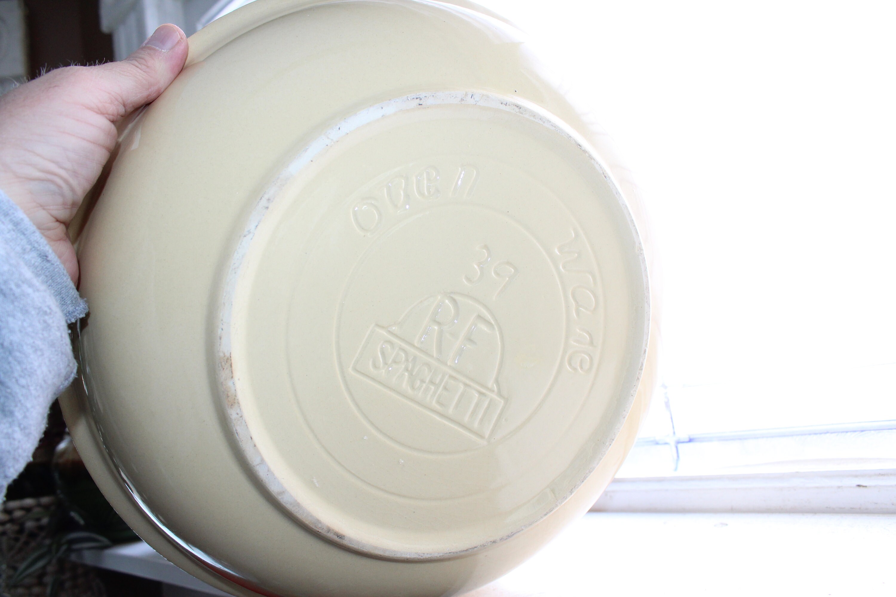Large vintage 1950s Watt Pottery red ring pattern spaghetti bowl #39, great for use or display in a country home. The bowl measures 13 1/4" wide x 3 1/4" high. As usual with these bowls, there are is some interior crazing and discoloration, but it still displays very well. No chips or cracks. Enjoy!