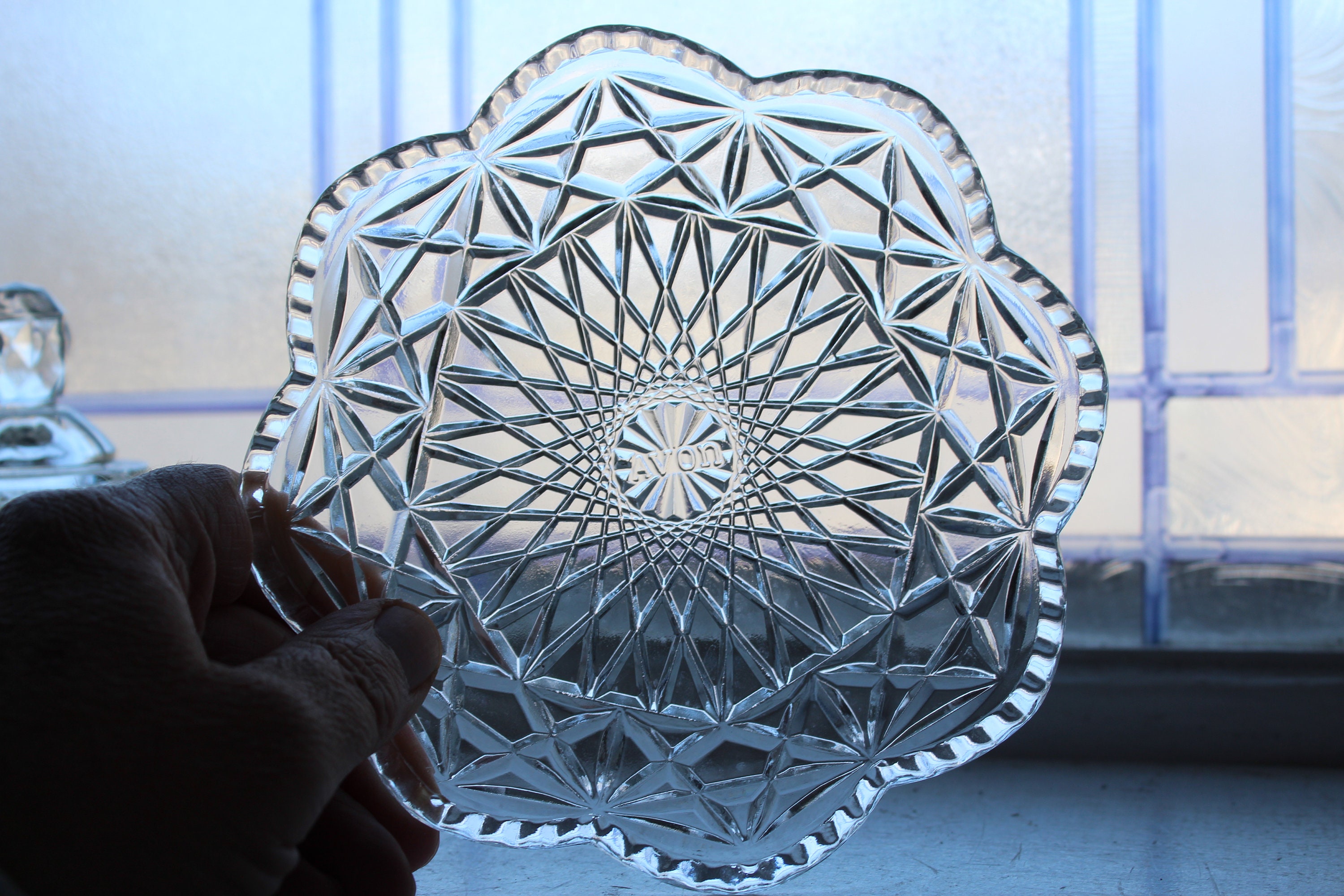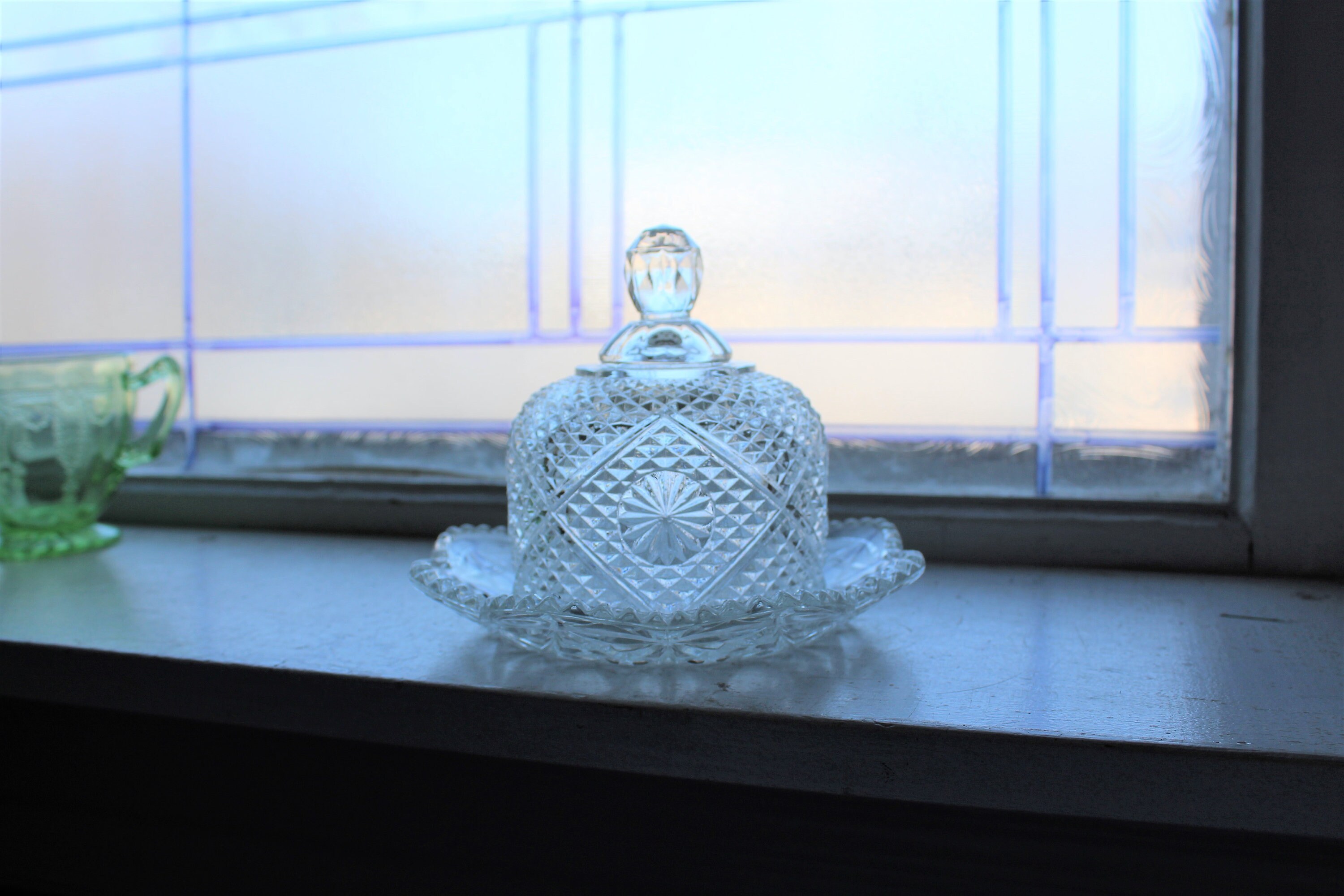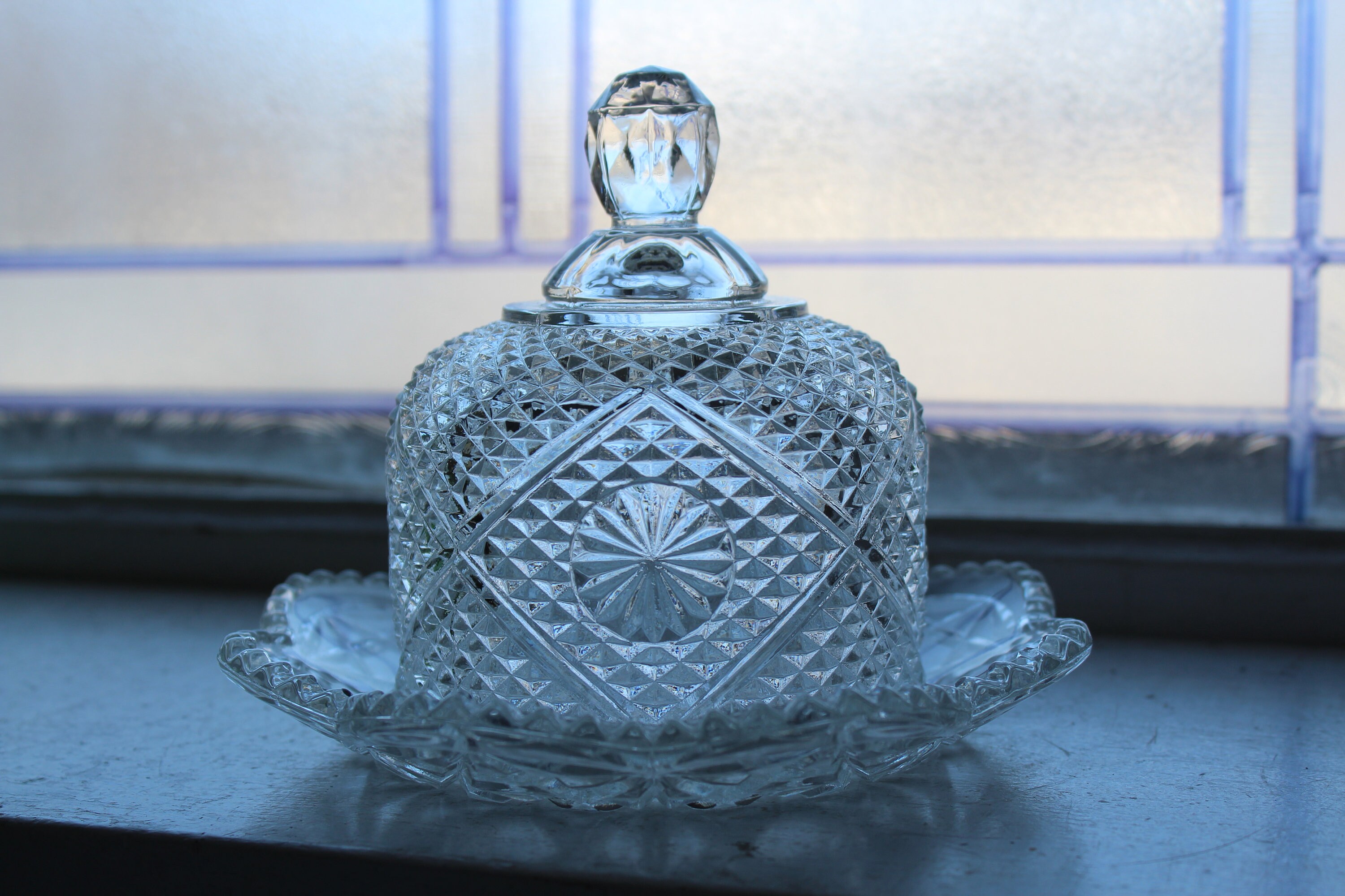 Vintage Avon round glass butter dish, in excellent condition. The dish measures 5" high to the top of the lid knob and and the base measures 6 1/4" wide. No chips or cracks. Enjoy!