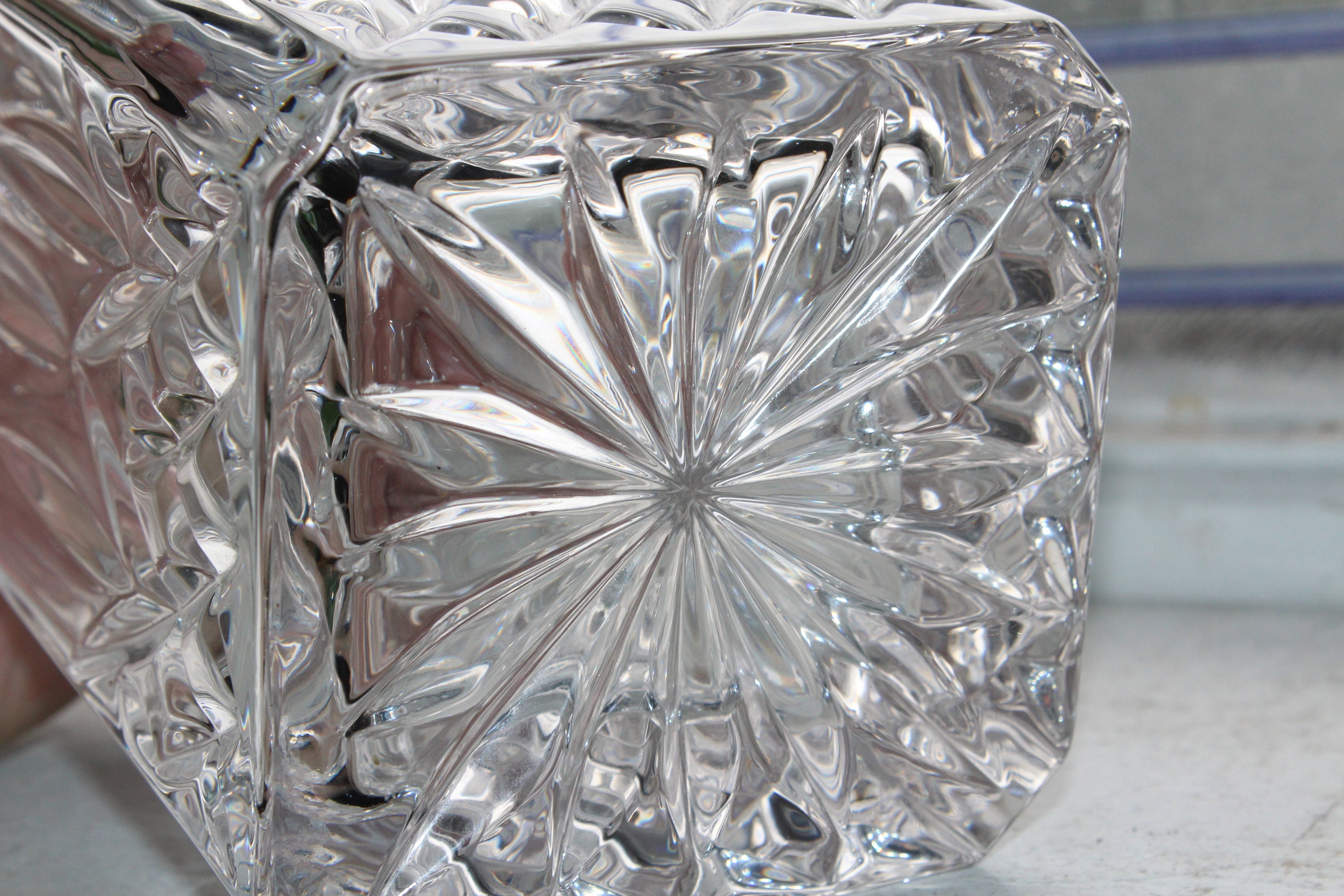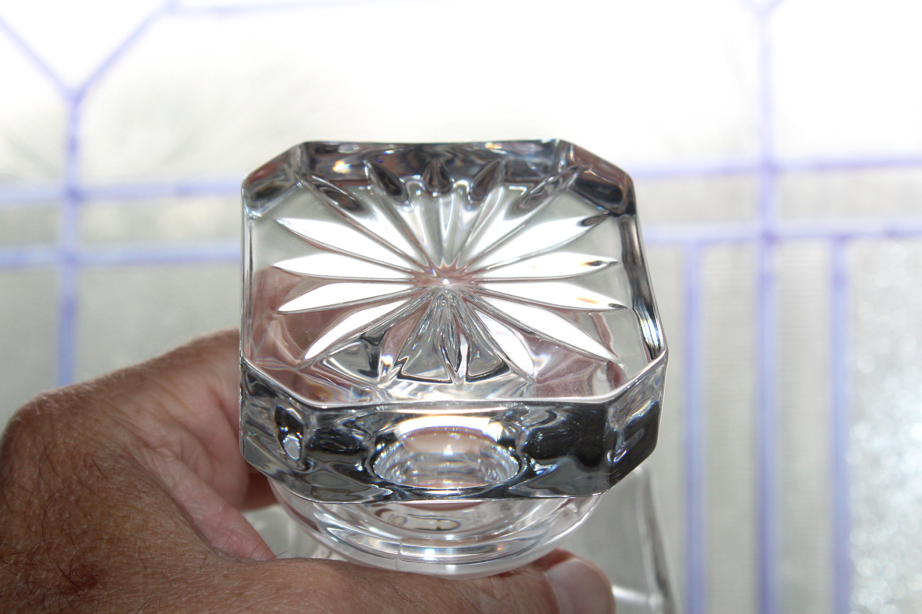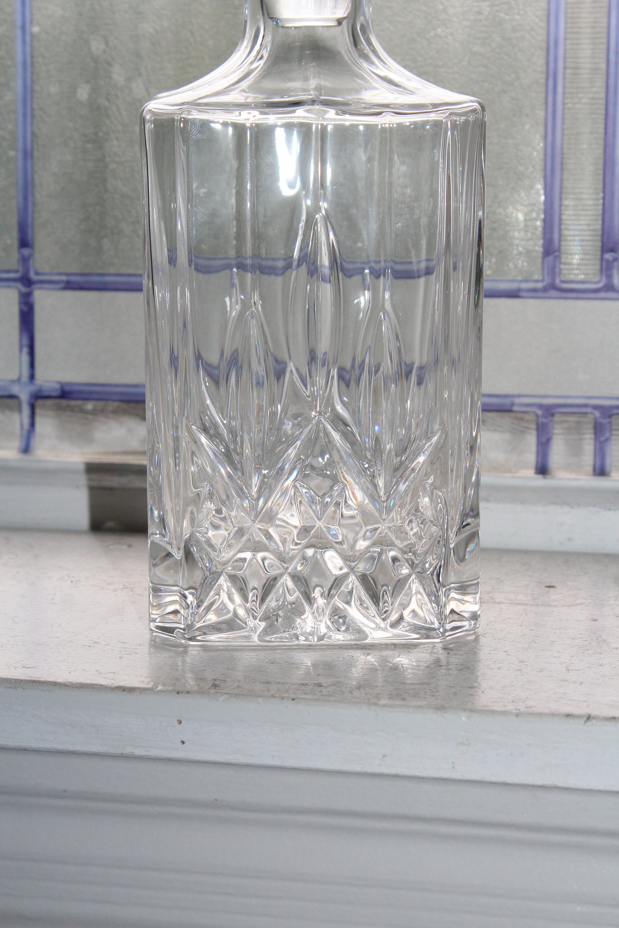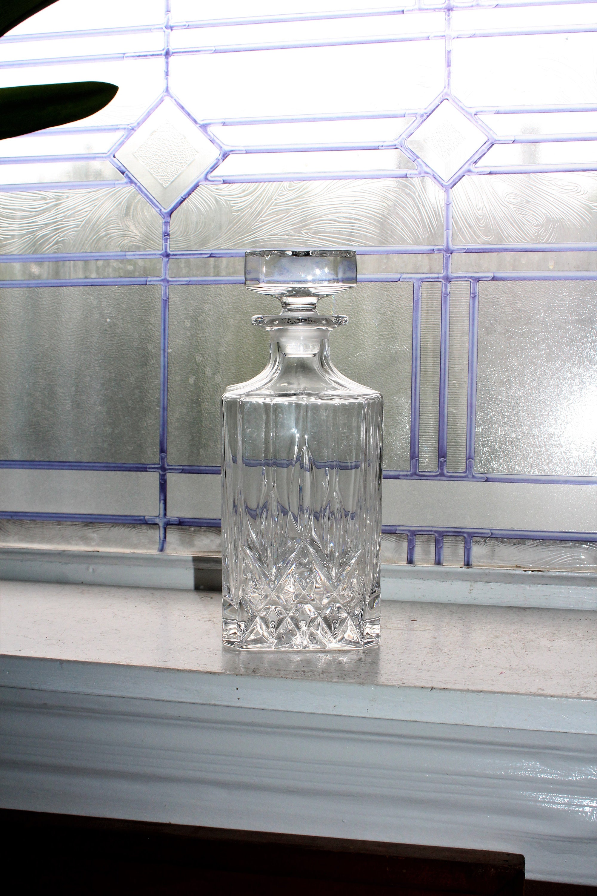 Vintage crystal liquor decanter, in excellent condition. The decanter measures 9" high to the top of the stopper x 3 1/2" wide, and it weighs 3 1/2 lbs. No chips or cracks, perfect for use or display. Enjoy!