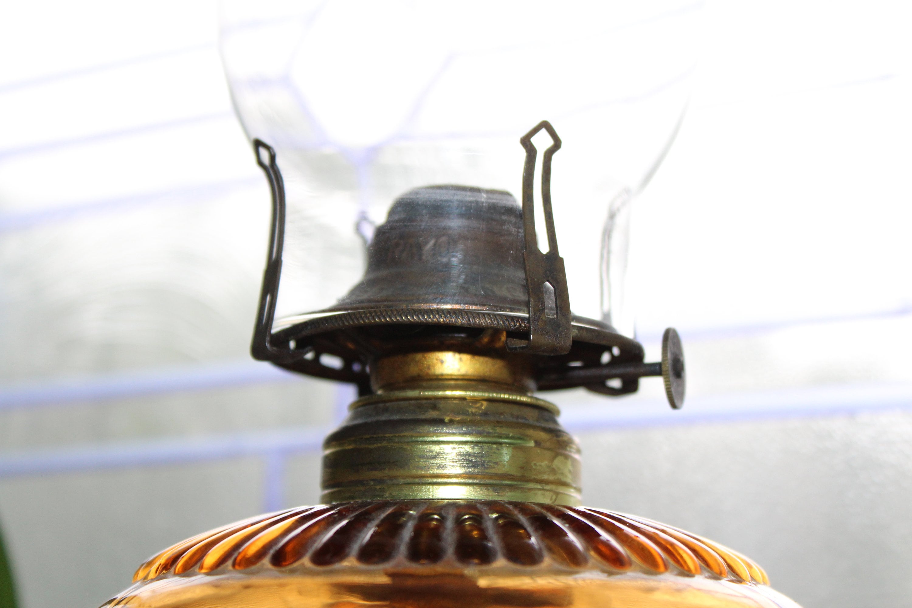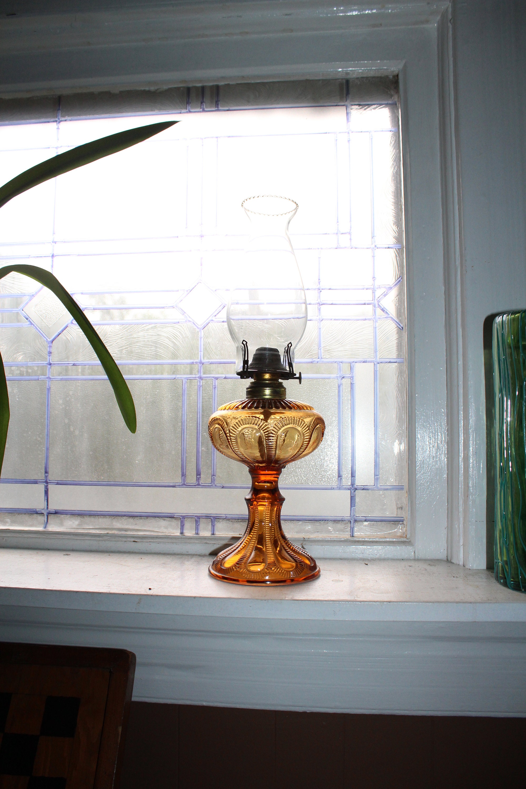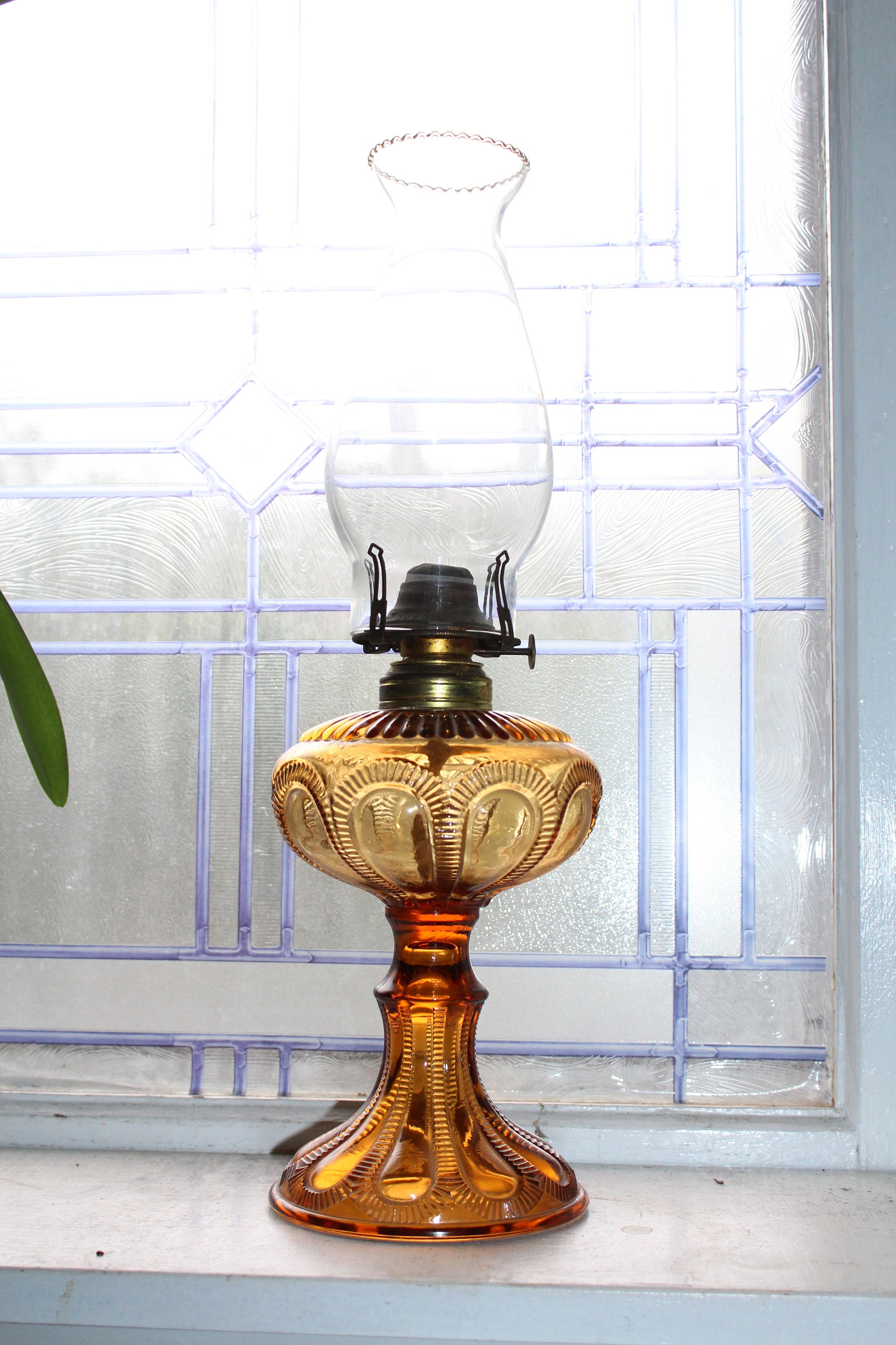 Antique eapg amber glass oil lamp with clear glass chimney, in very good condition. The lamp works well. It measures 16" high to the top of the chimney and has a Queen Anne burner. The glass has no chips or cracks and looks great. Enjoy!