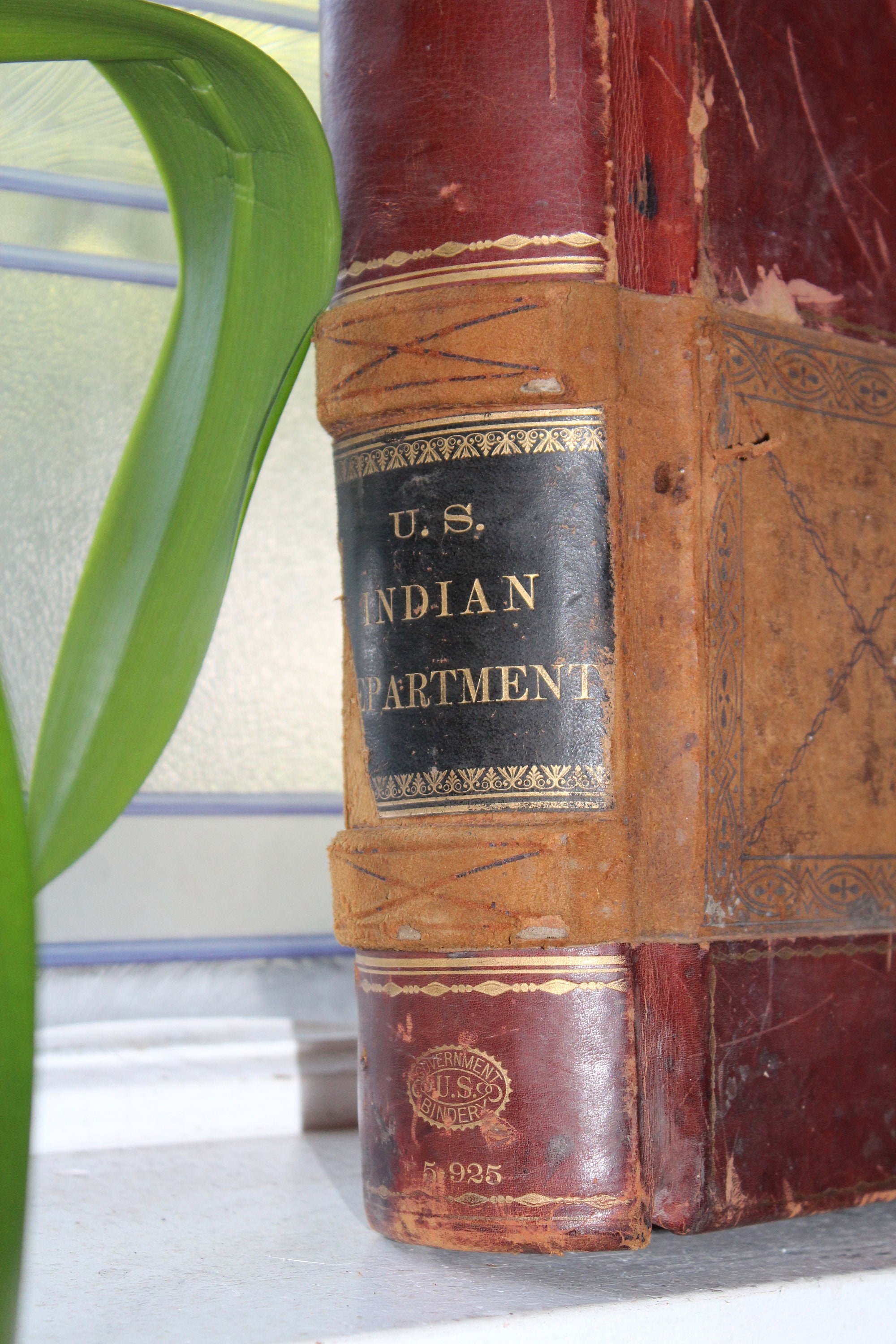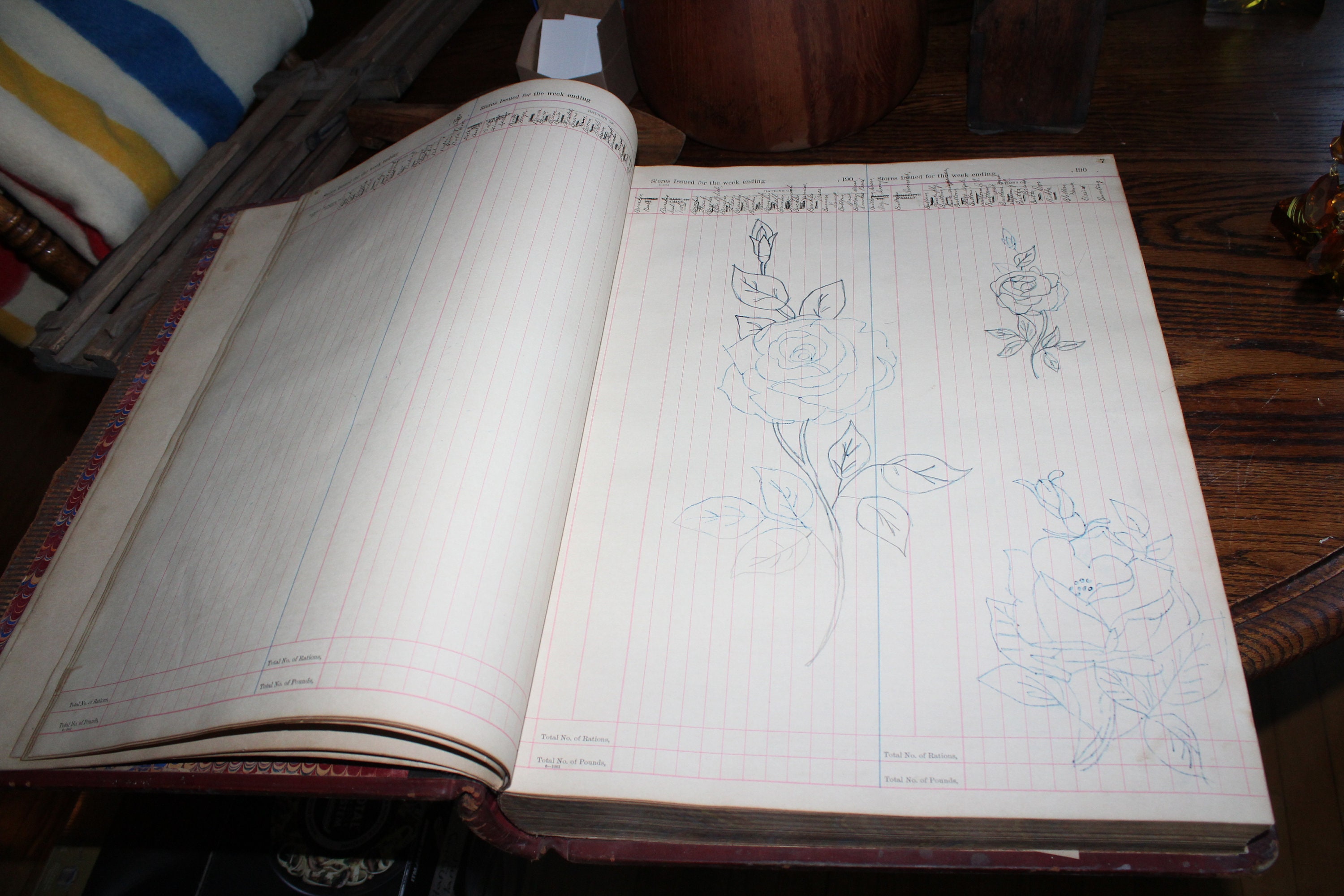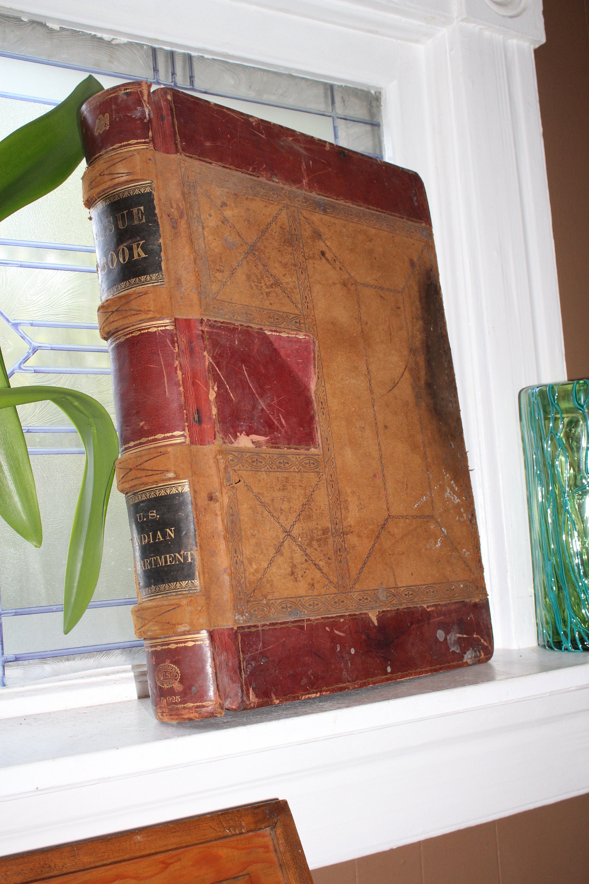 Here we have an interesting large ledger book. It's an issue book for the U.S. Indian Department, meant to keep track of supplies issued to Native Americans. This huge leather bound book measures 19 3/4" x 16" and weighs 23 lbs. It shows age appropriate wear and tear, and the first several pages were used to draw embroidery patterns back in the 1920s, but it displays very well. To be clear, the majority of the pages are blank. Enjoy!