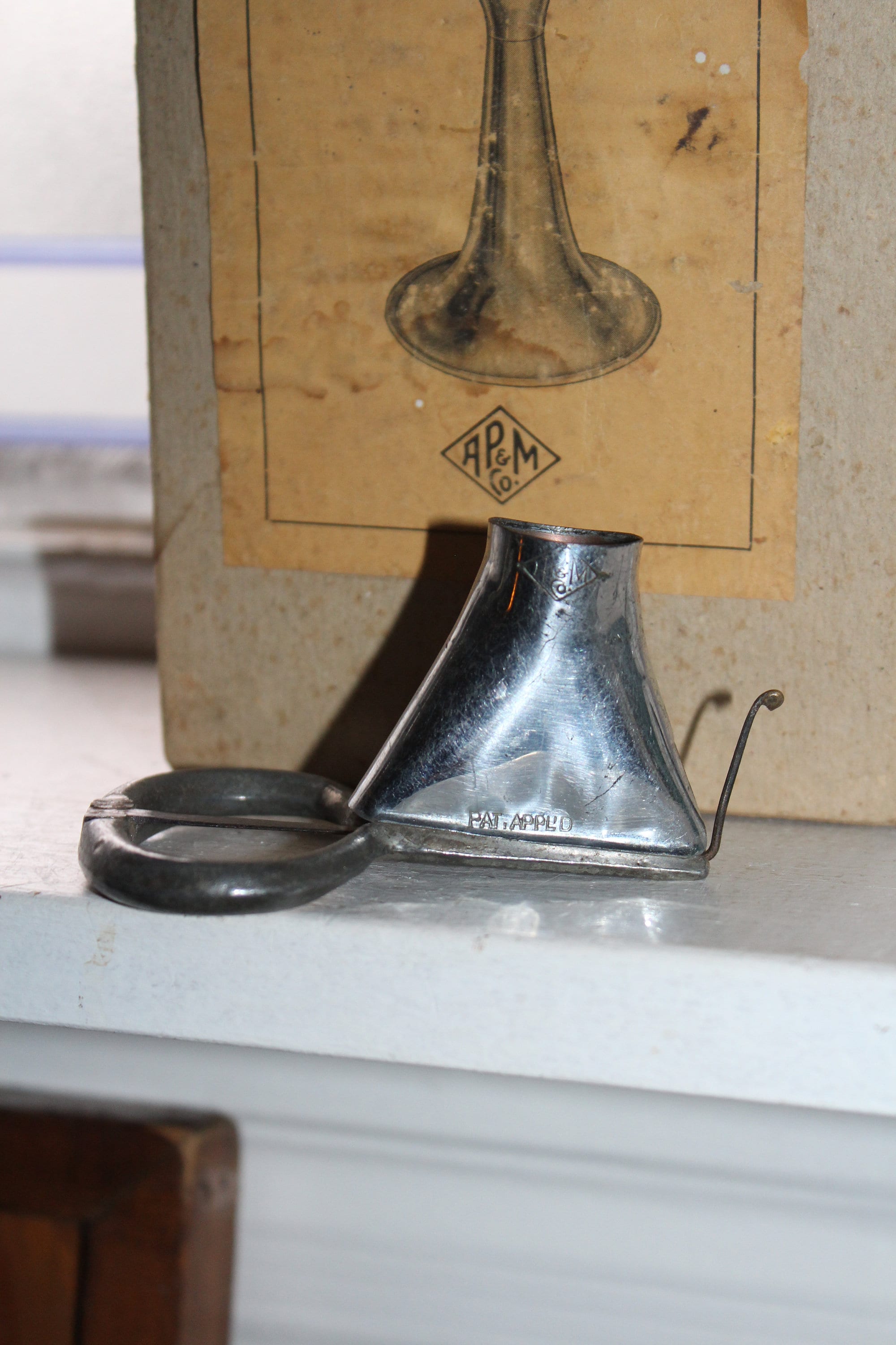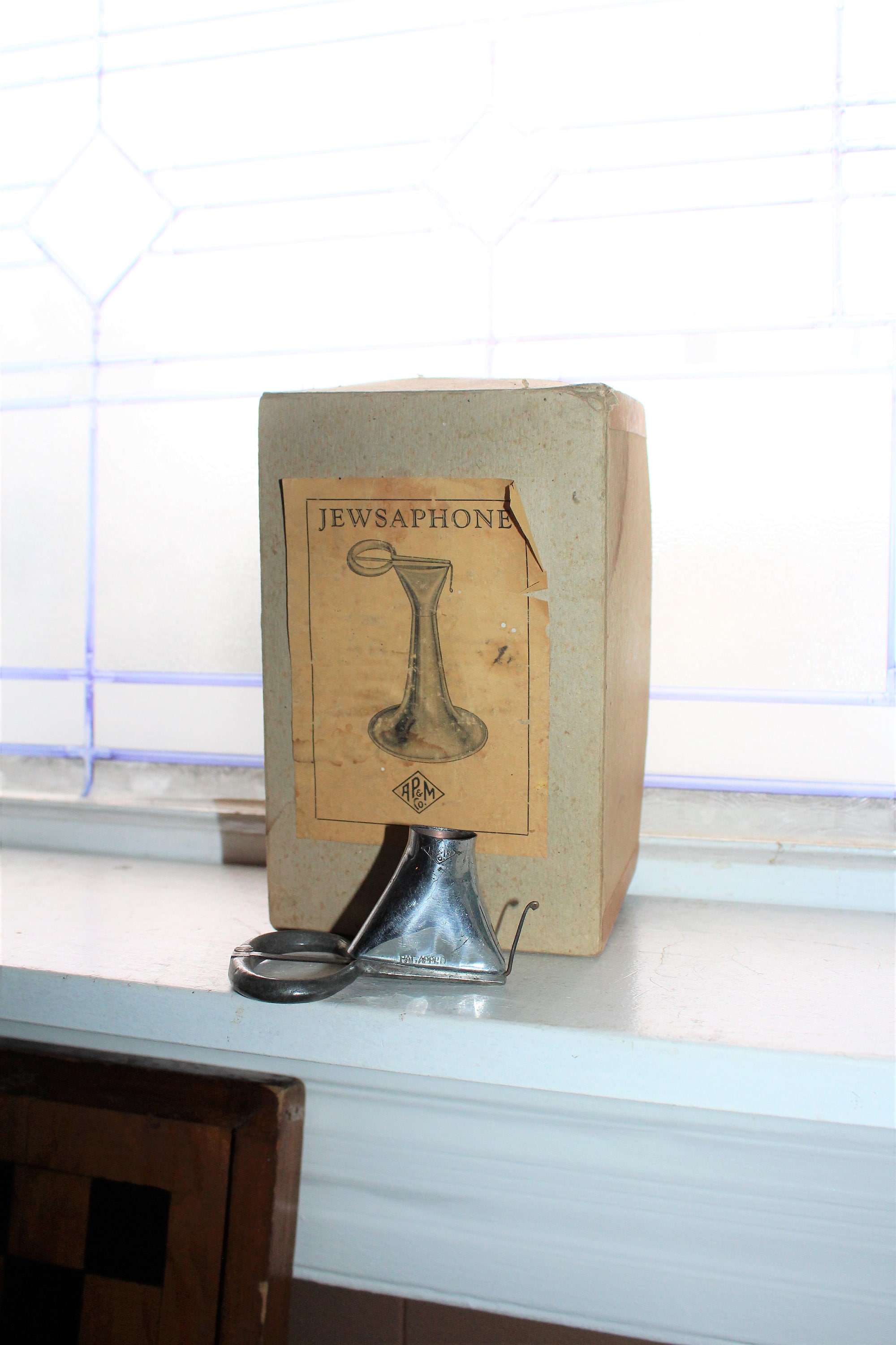 Antique metal AP&M mouth harp or Jewsaphone with original box. The box measures 7 1/2" x 4 3/4" x 4 1/2". The harp is missing the horn portion but still works, and the box is super rare to find. Enjoy!