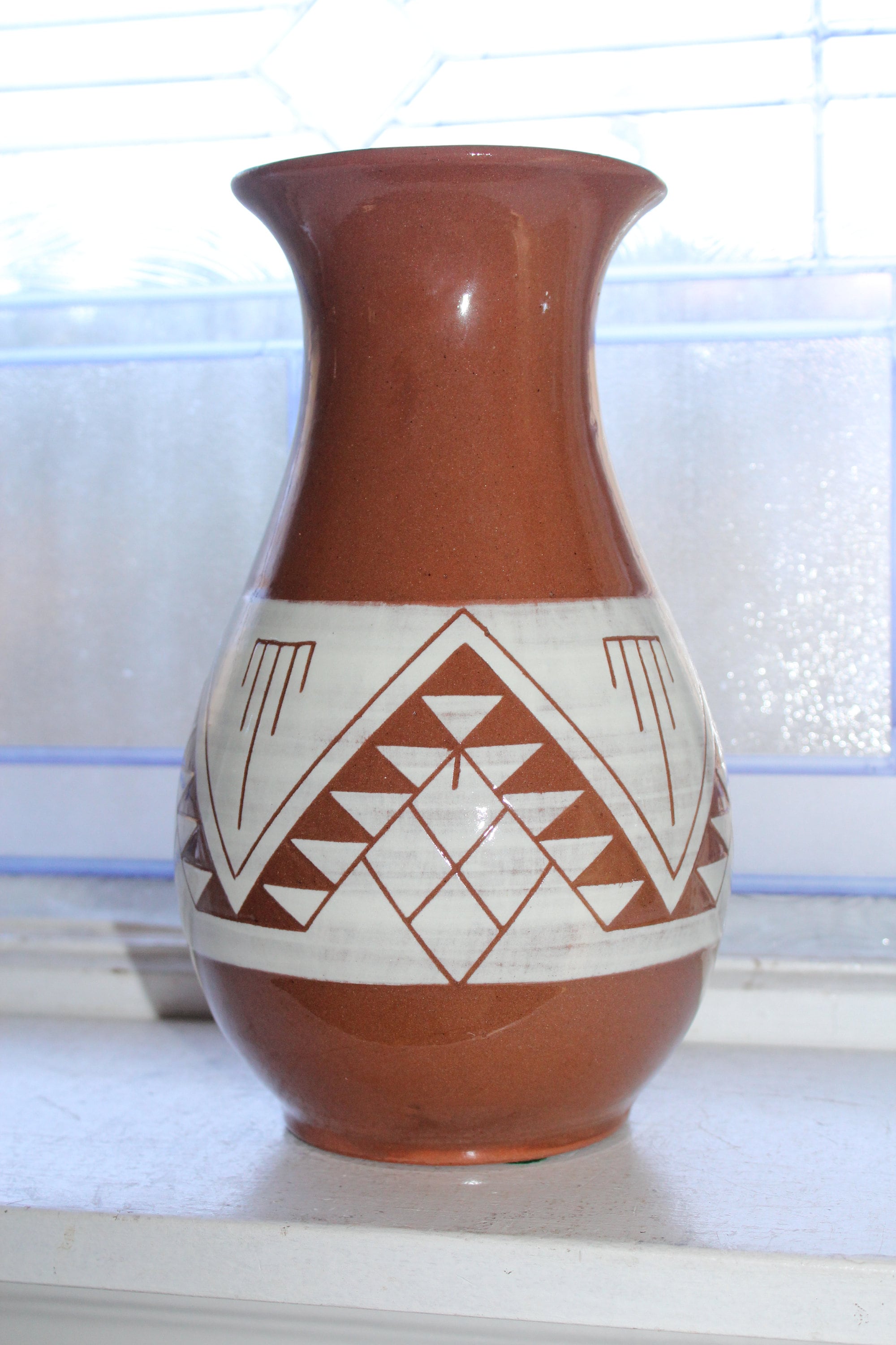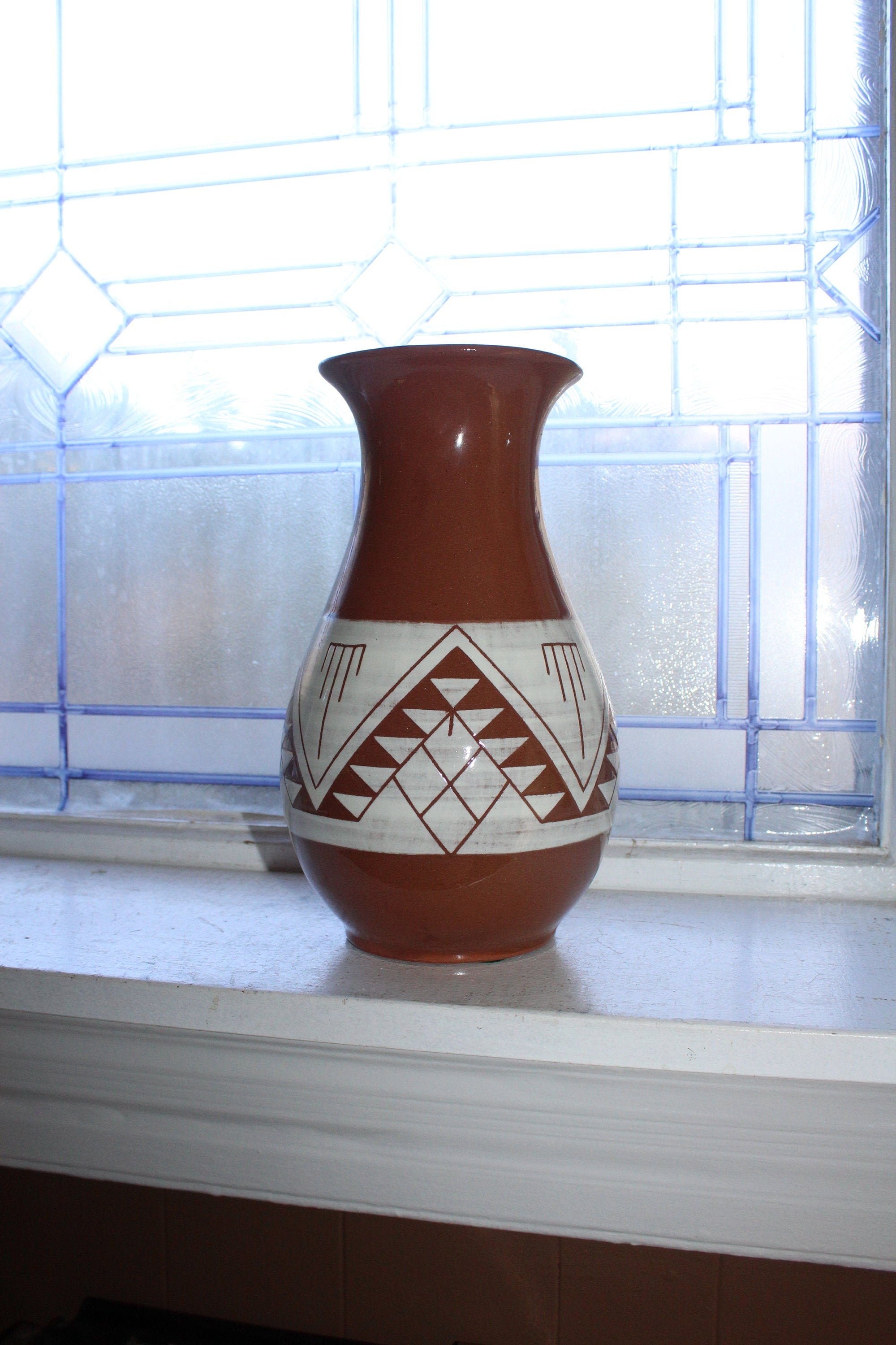 Large vintage Sioux Pottery brown and white vase, signed by the Native American Artist Swift Eagle SP-RC-SD, which stands for Sioux Pottery Rapid City South Dakota. The vase measures 9 3/4" high. No chips or cracks. Sioux Pottery is very hard to find in sizes this big. Enjoy!